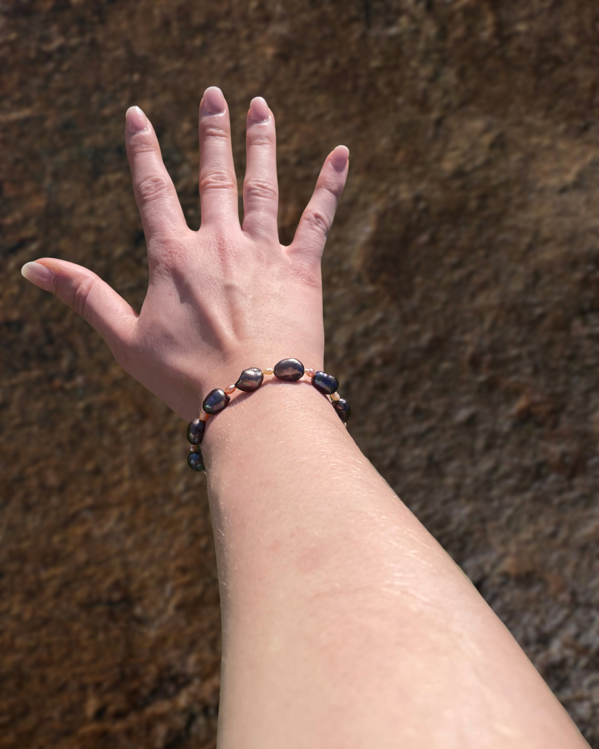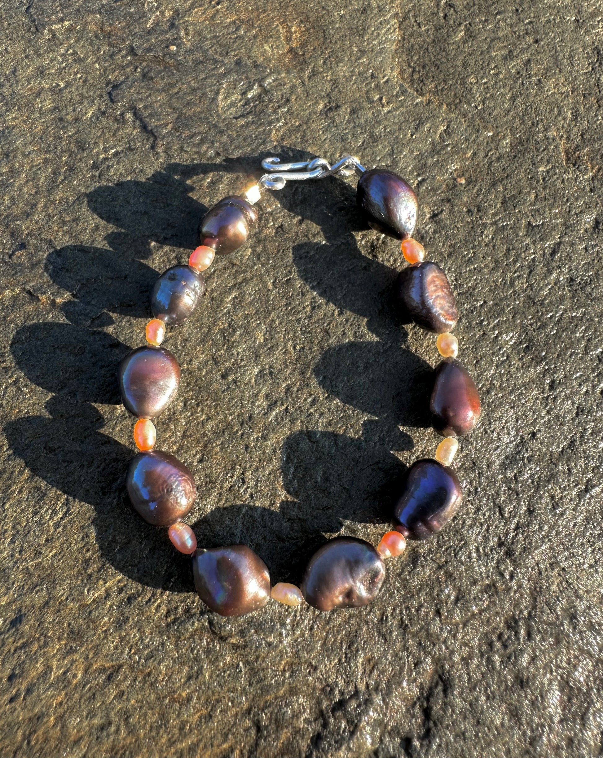 JIM · pulsera elaborada con grandes perlas de agua dulce de tonos oscuros que, según la luz, revelan matices marrones y azulados. El diseño se completa con pequeñas perlas de agua dulce en tono rosado, que aportan un contraste suave y una calidez equilibrada a la pieza.