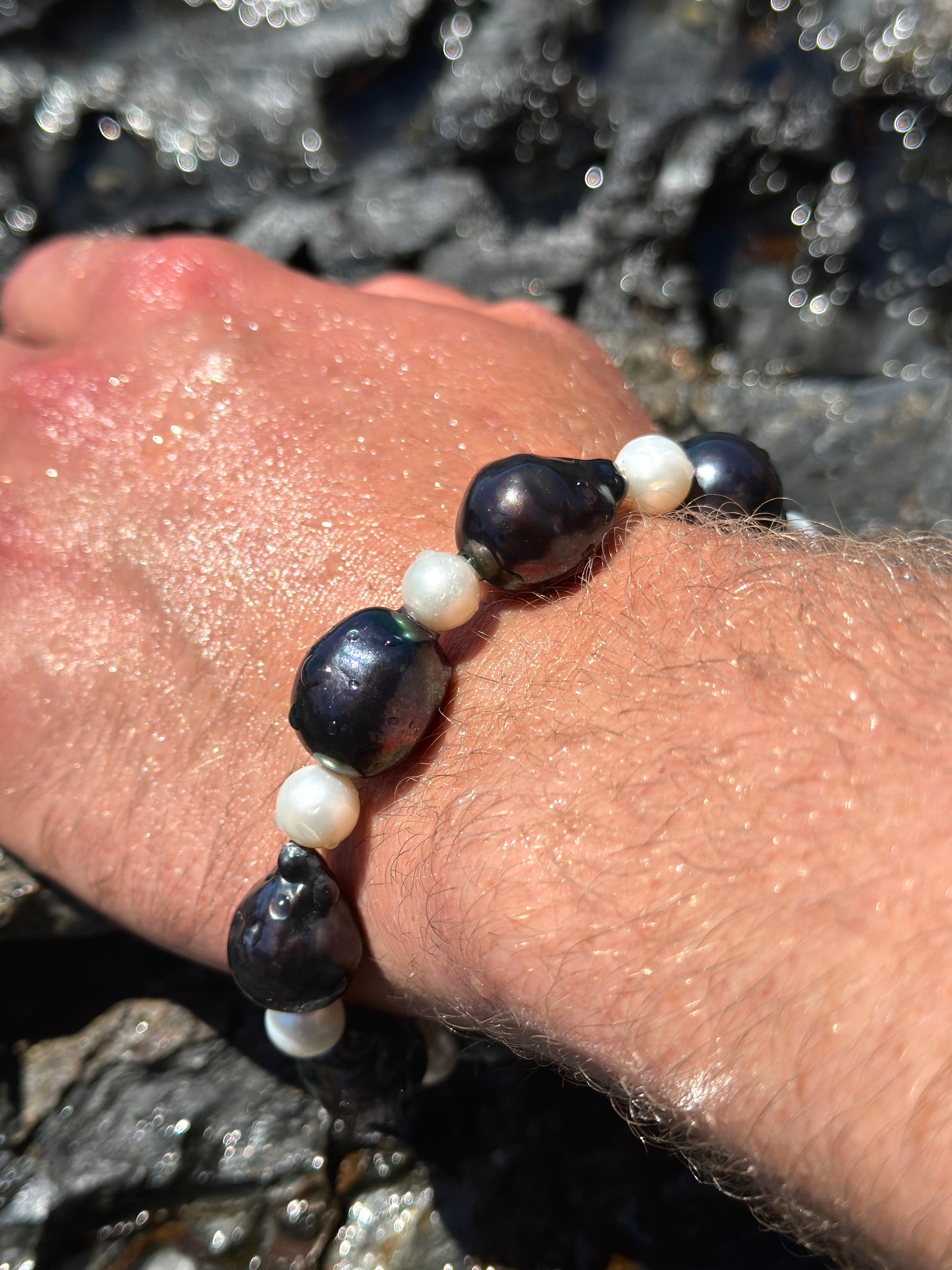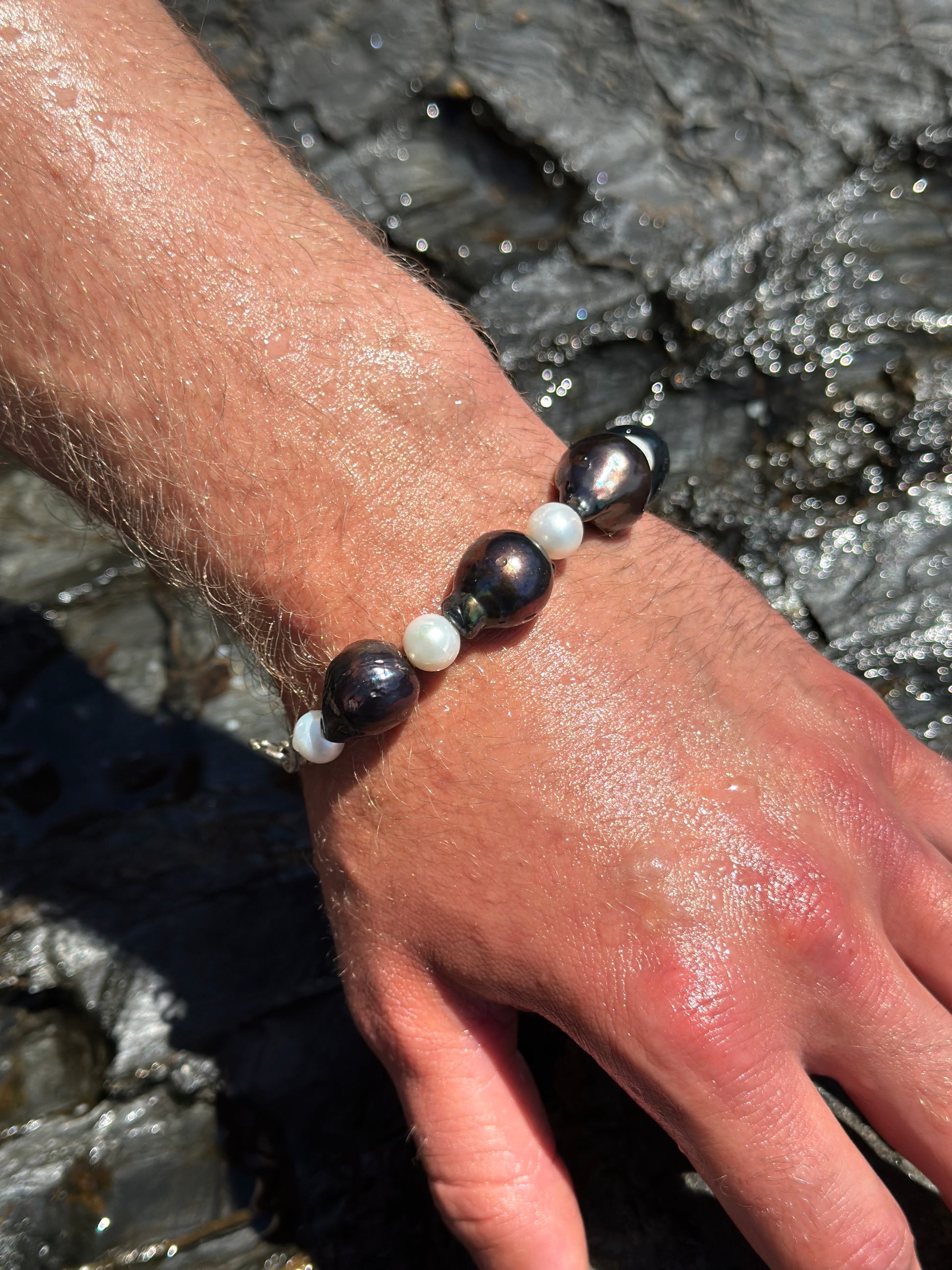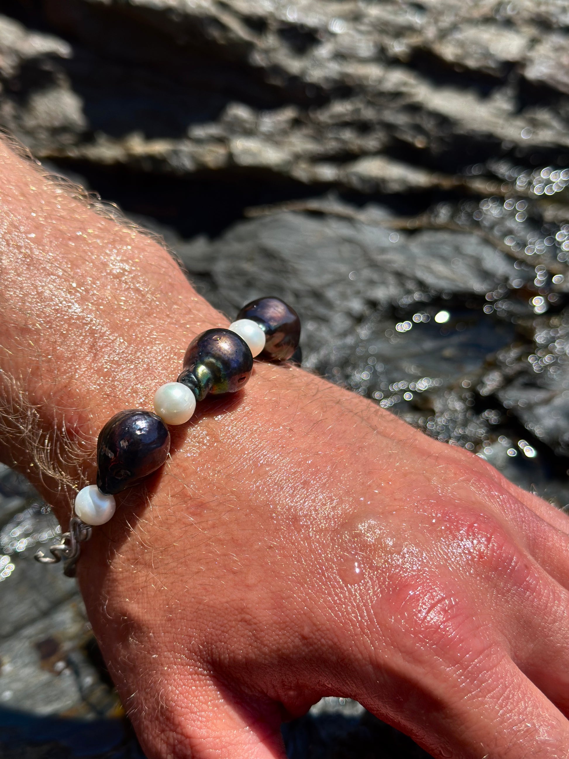 JOHN · pulsera compuesta por perlas barrocas oscuras combinadas con perlas de agua dulce claras.