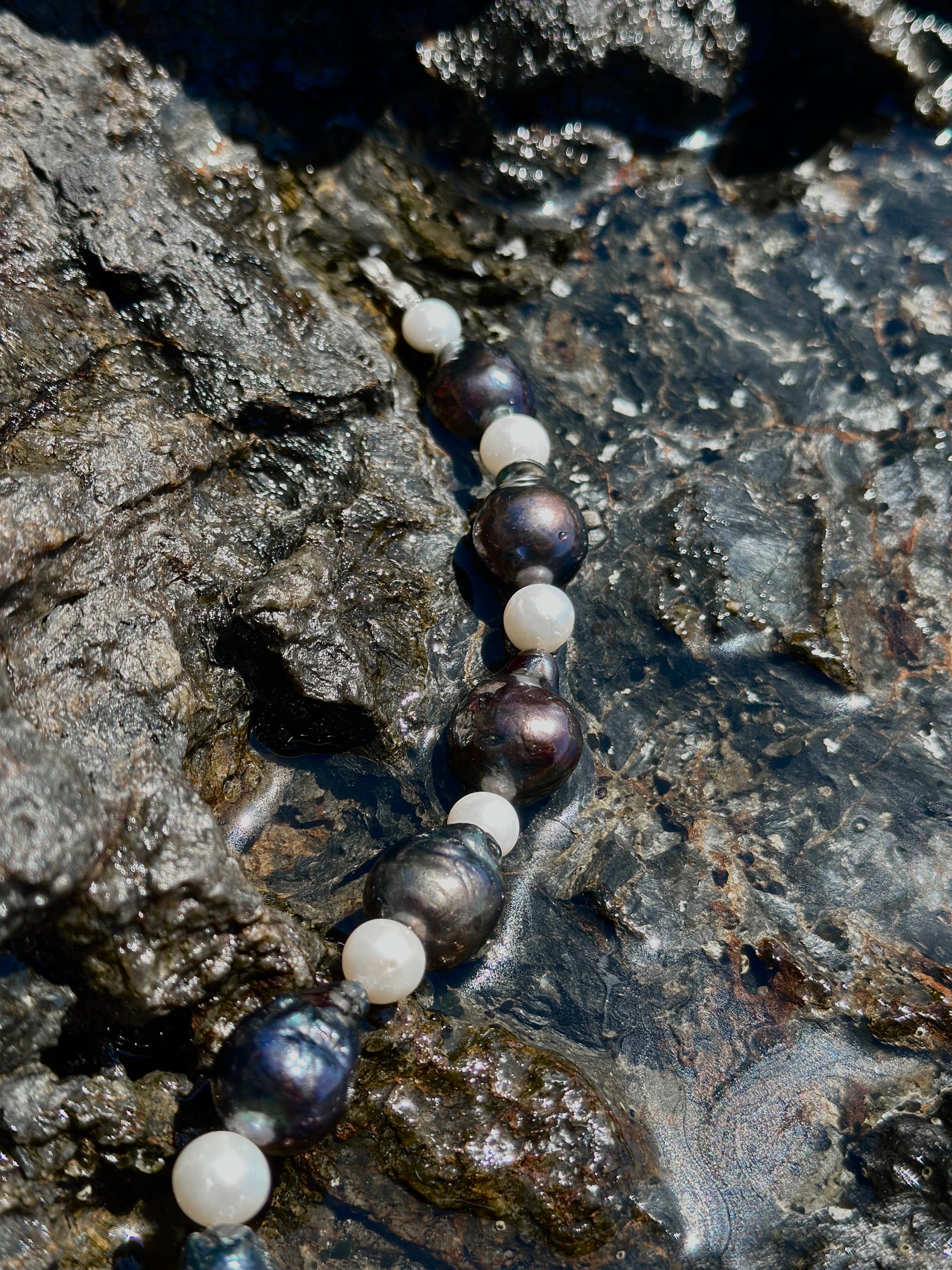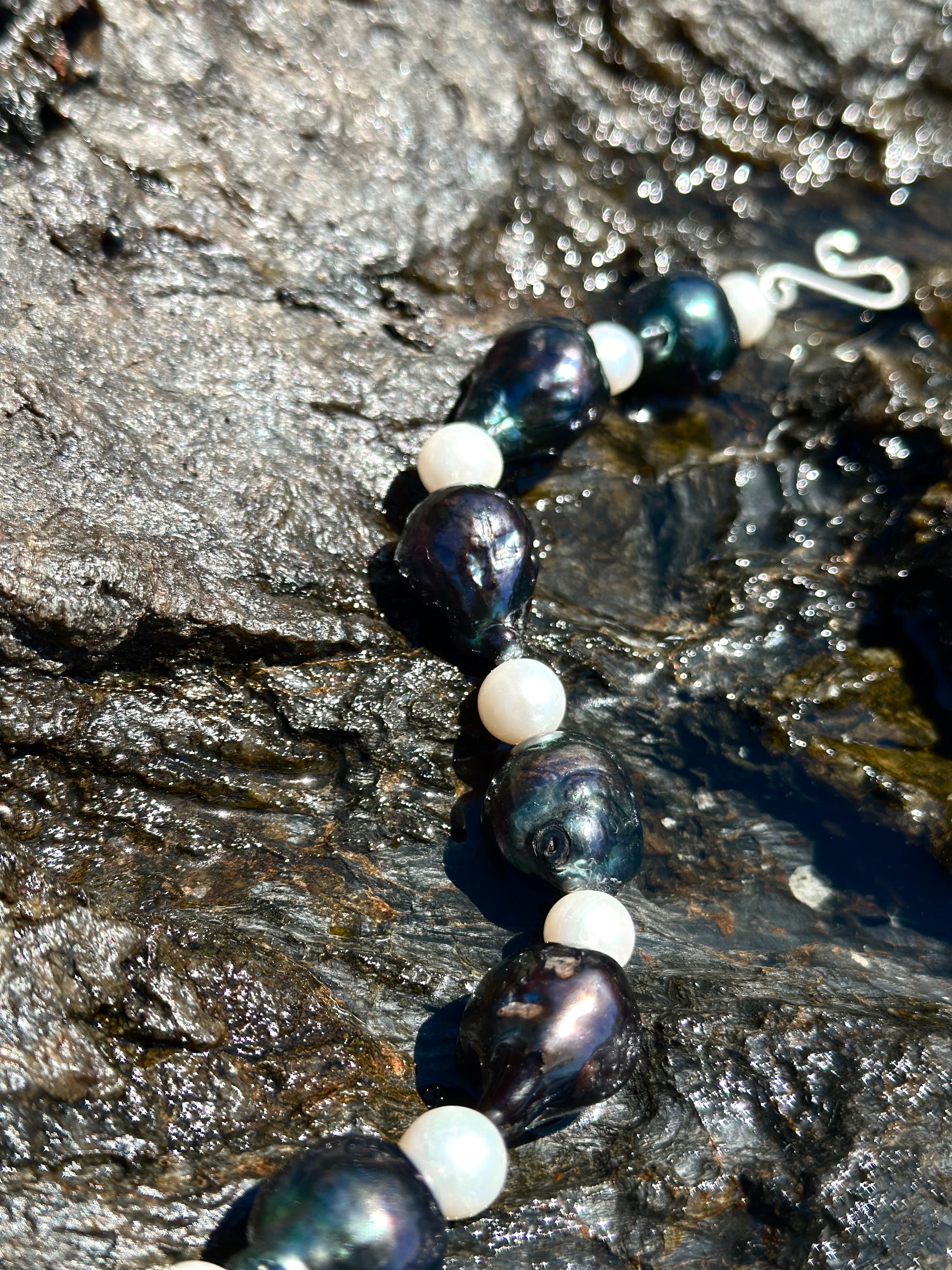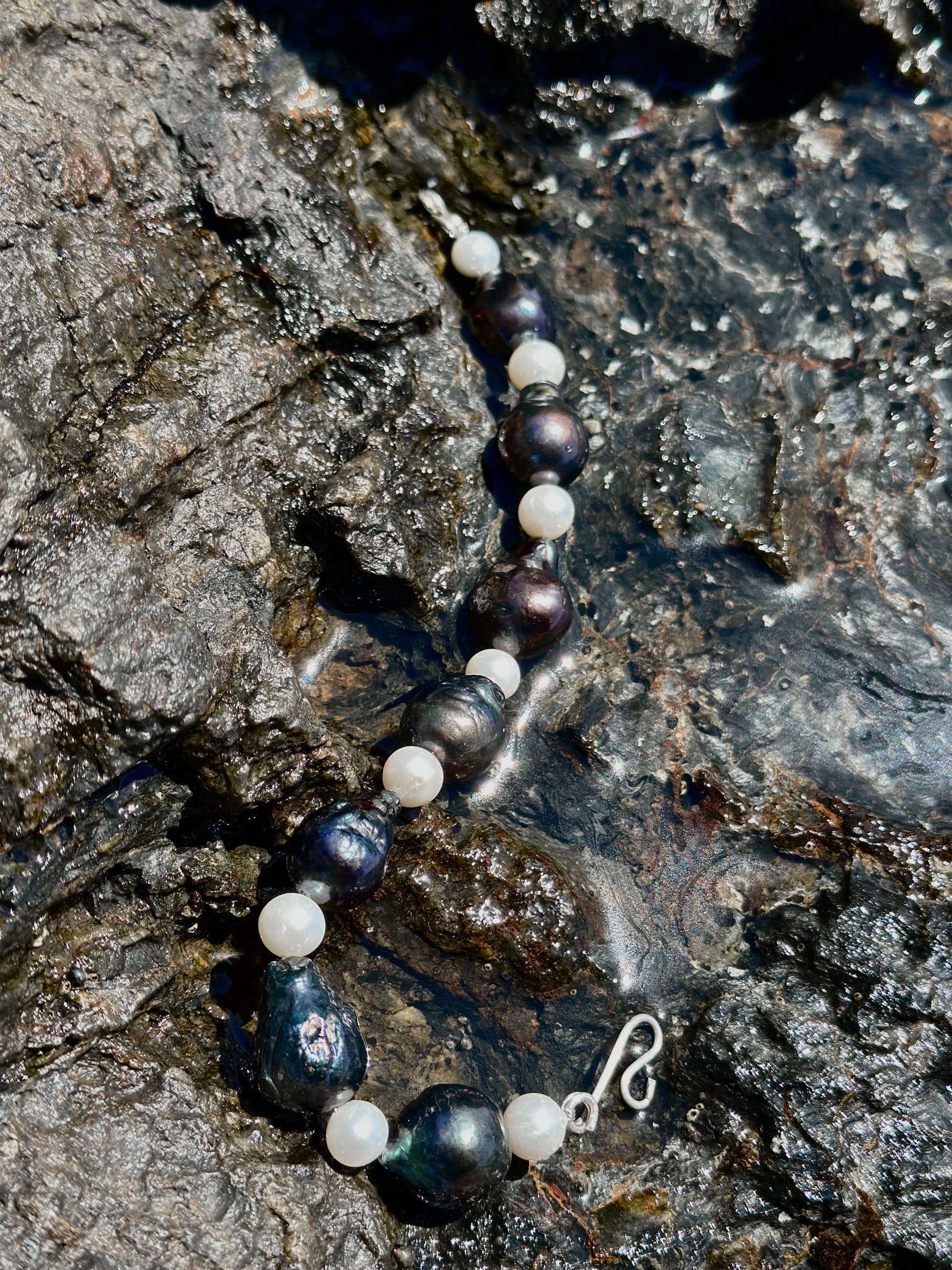 JOHN · pulsera compuesta por perlas barrocas oscuras combinadas con perlas de agua dulce claras.