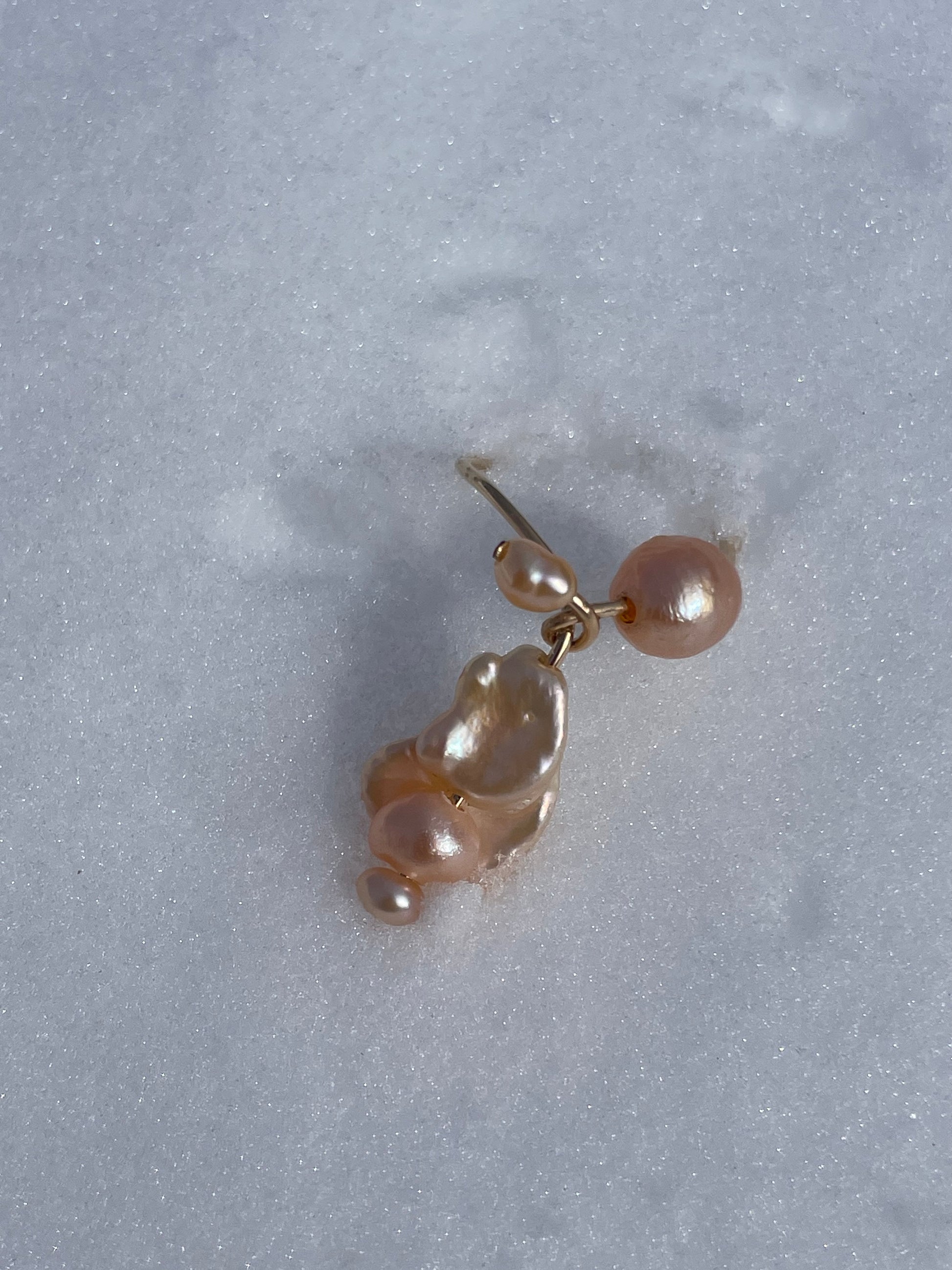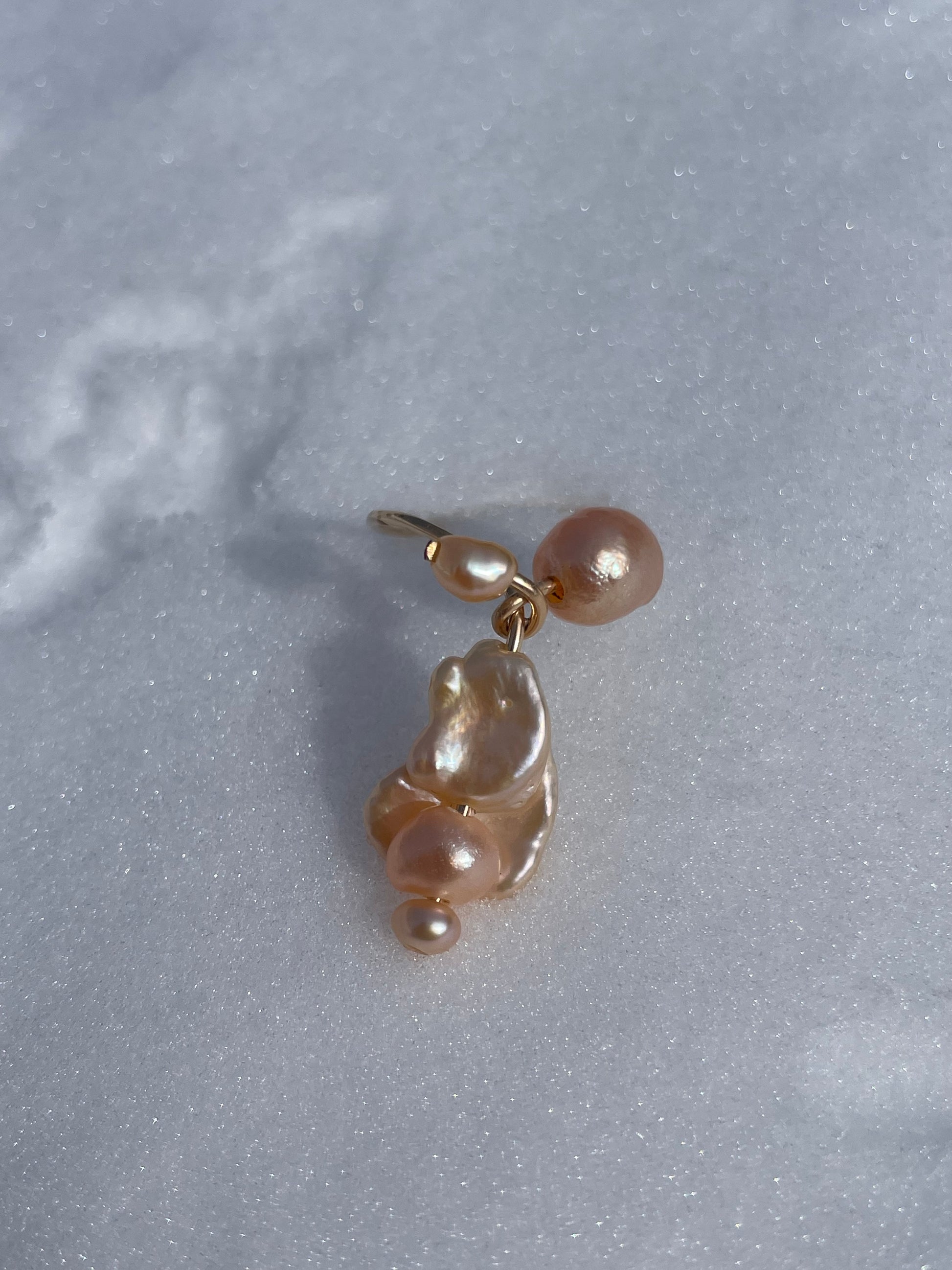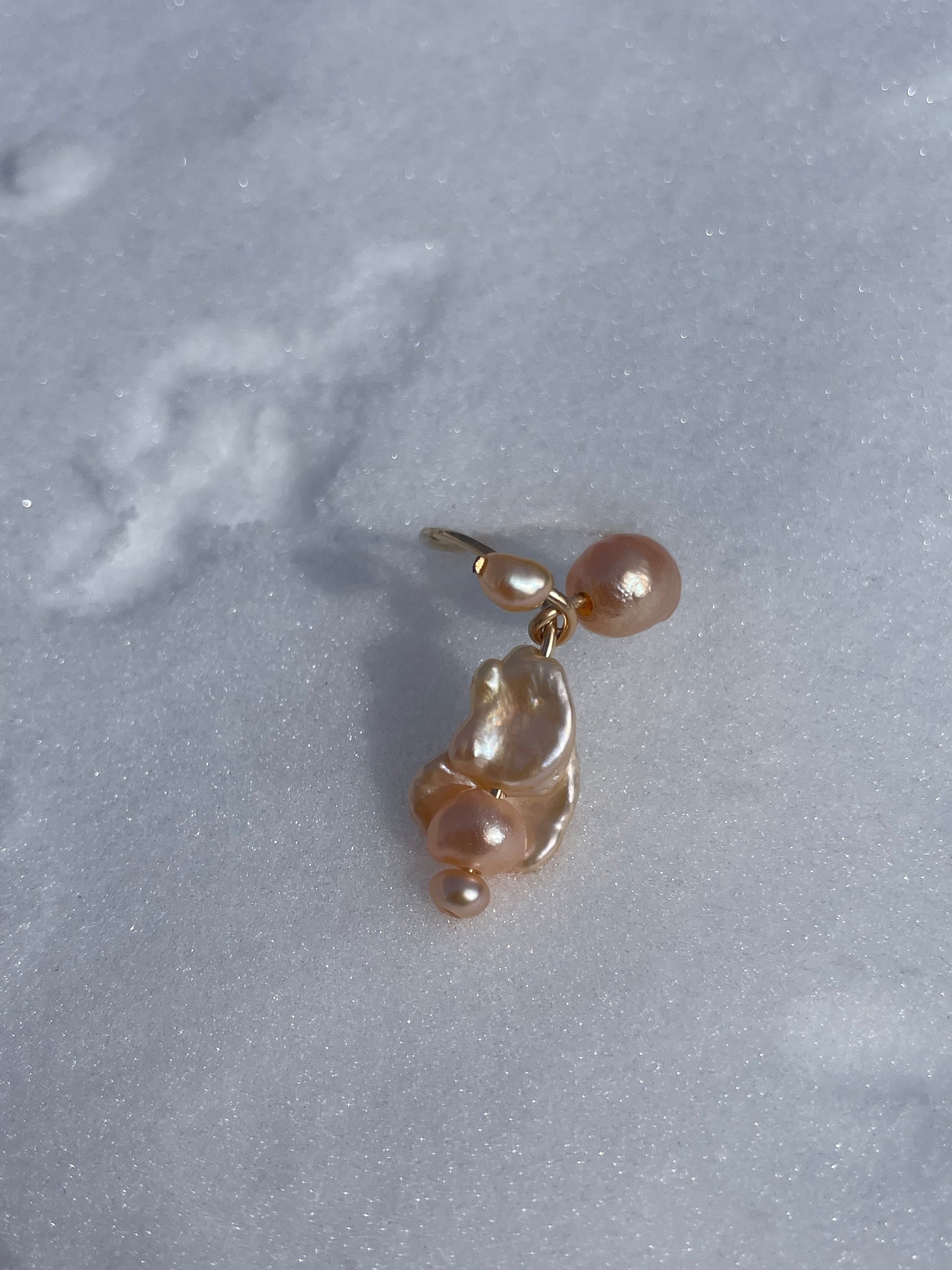 Dos pequeñas perlas la acompañan, formando un delicado conjunto que evoca la imagen de una flor suspendida.
