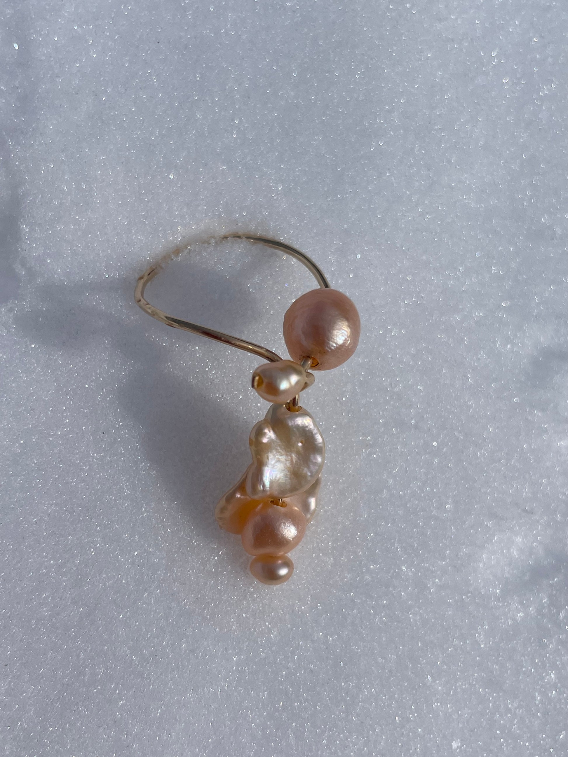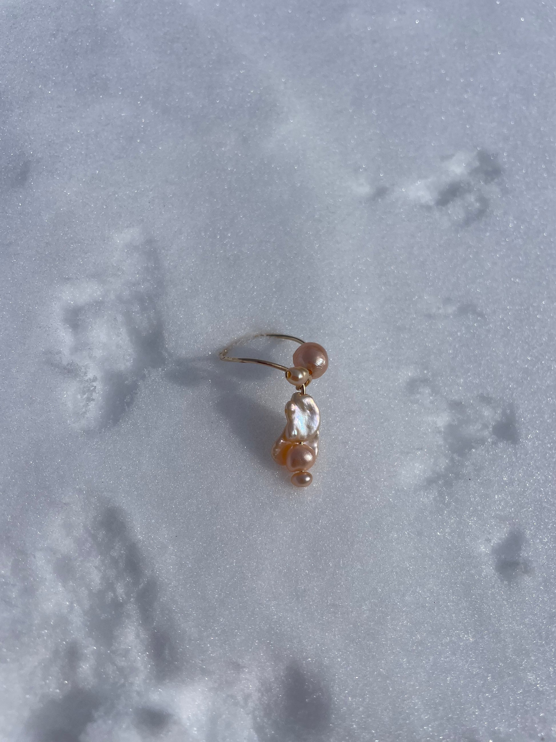 En la parte superior, dos perlas de agua dulce en tonos salmón con matices dorados envuelven el diseño y realzan la calidez y elegancia natural del anillo.