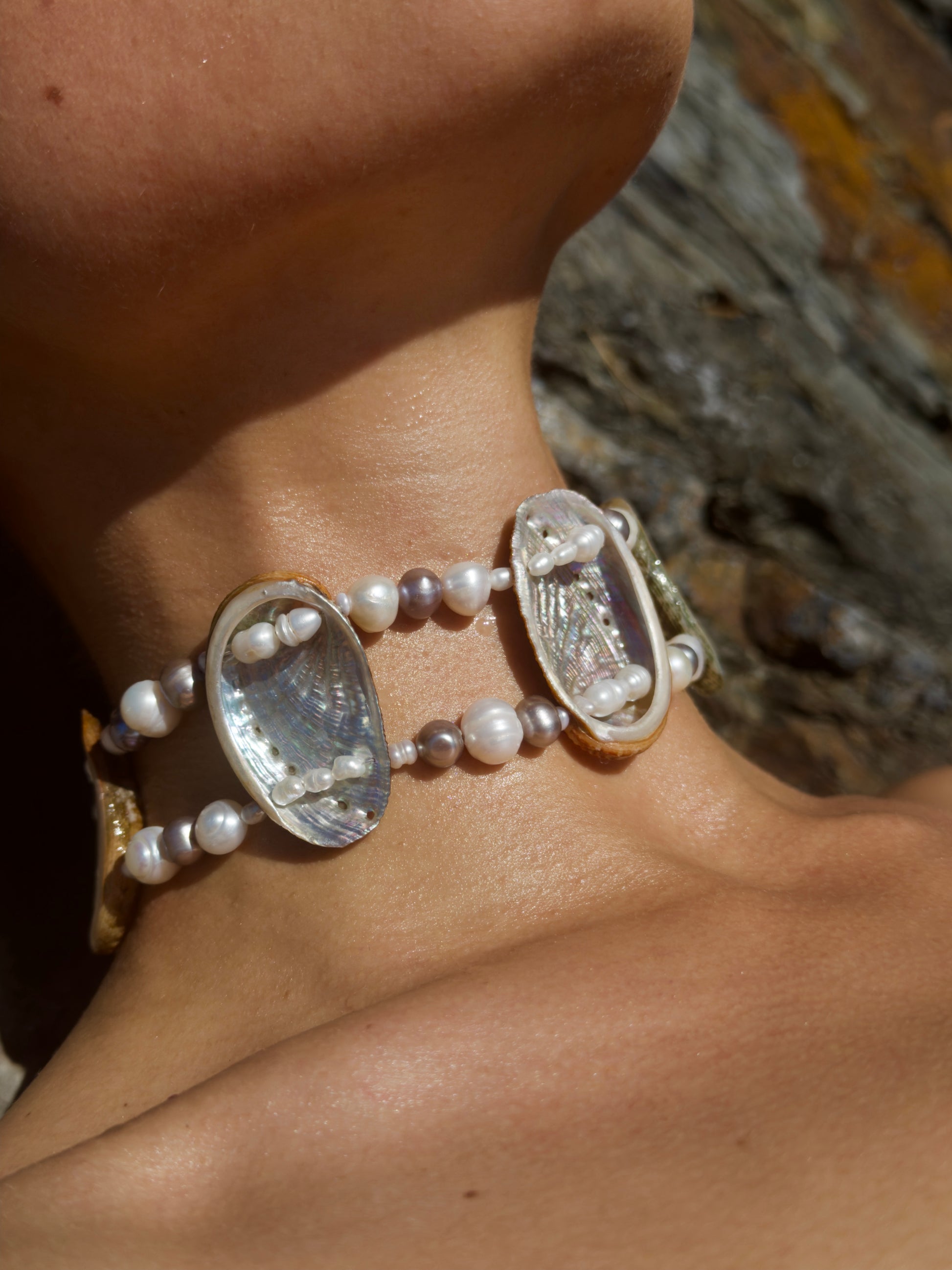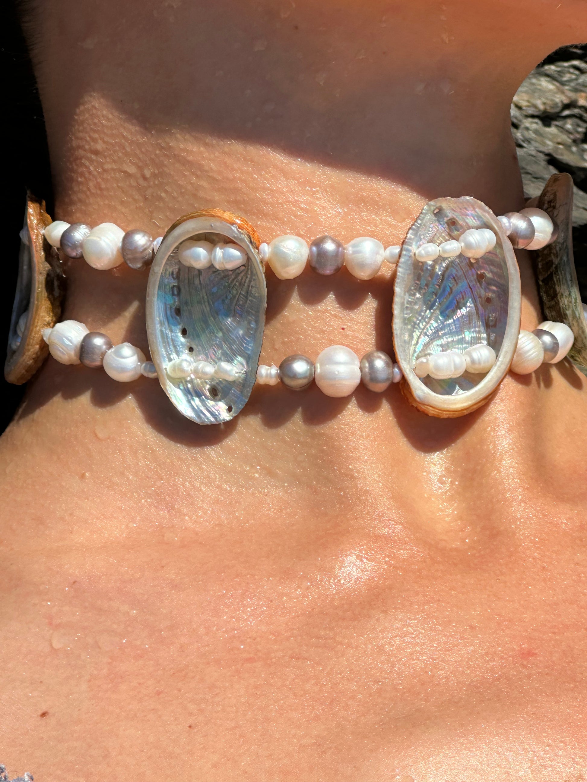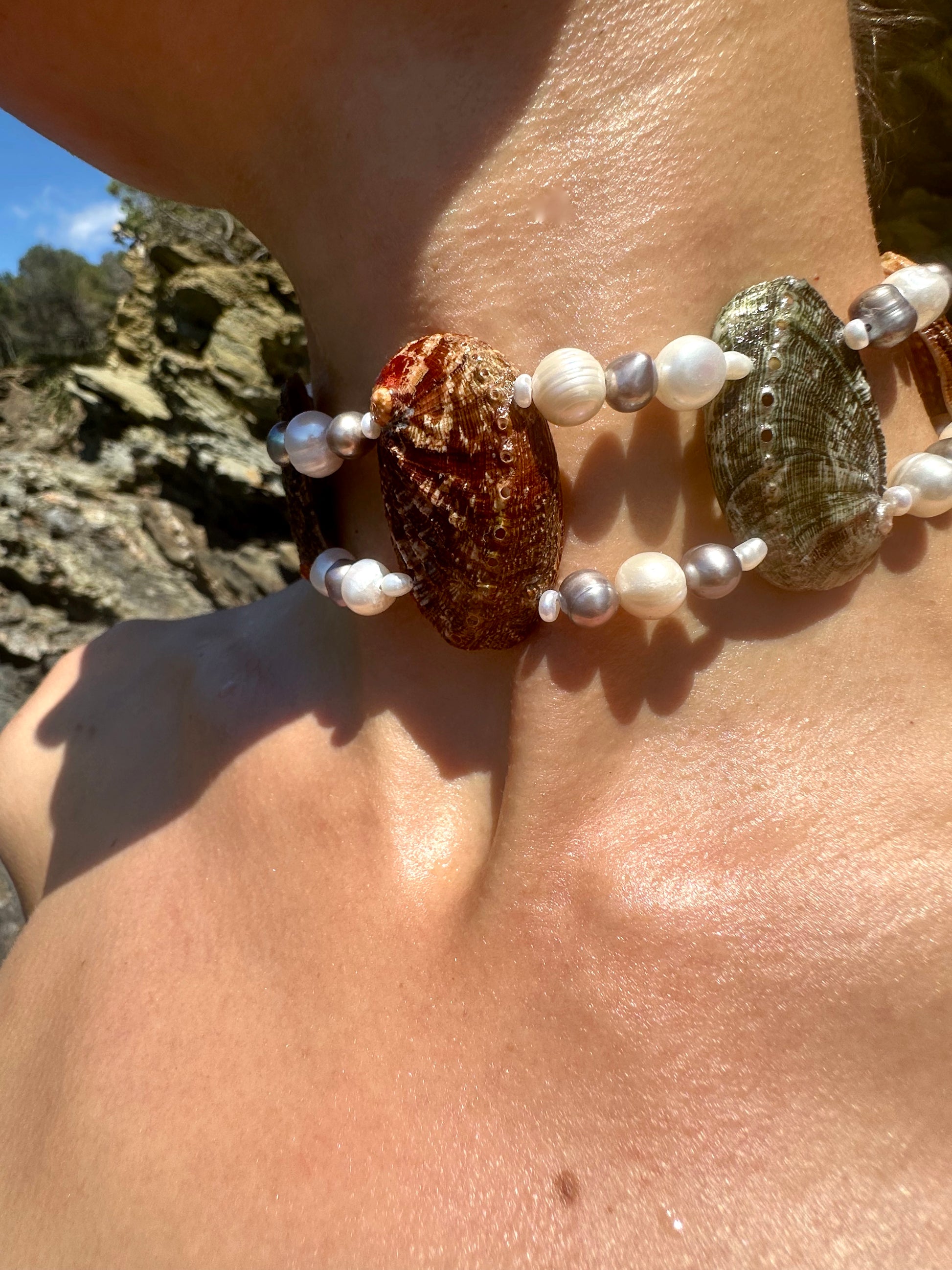 LEON · collar choker reversible elaborado con múltiples conchas de abulón en tonos rojizos y verdes, acompañado de varias perlas de agua dulce.