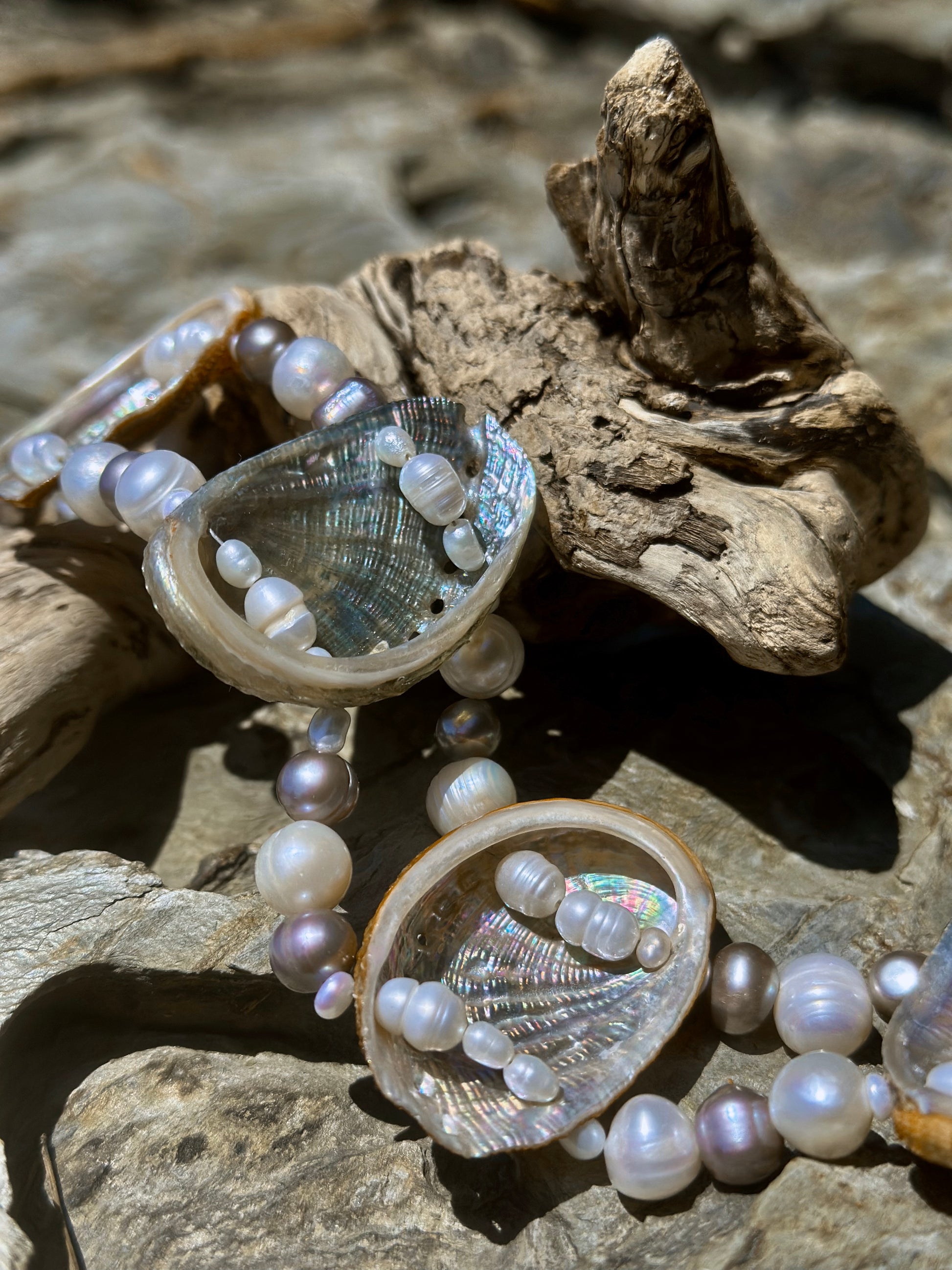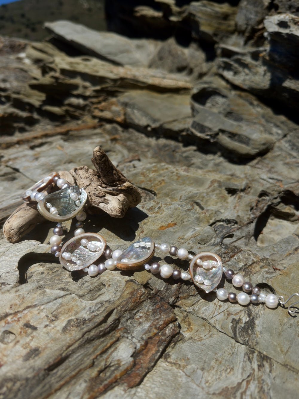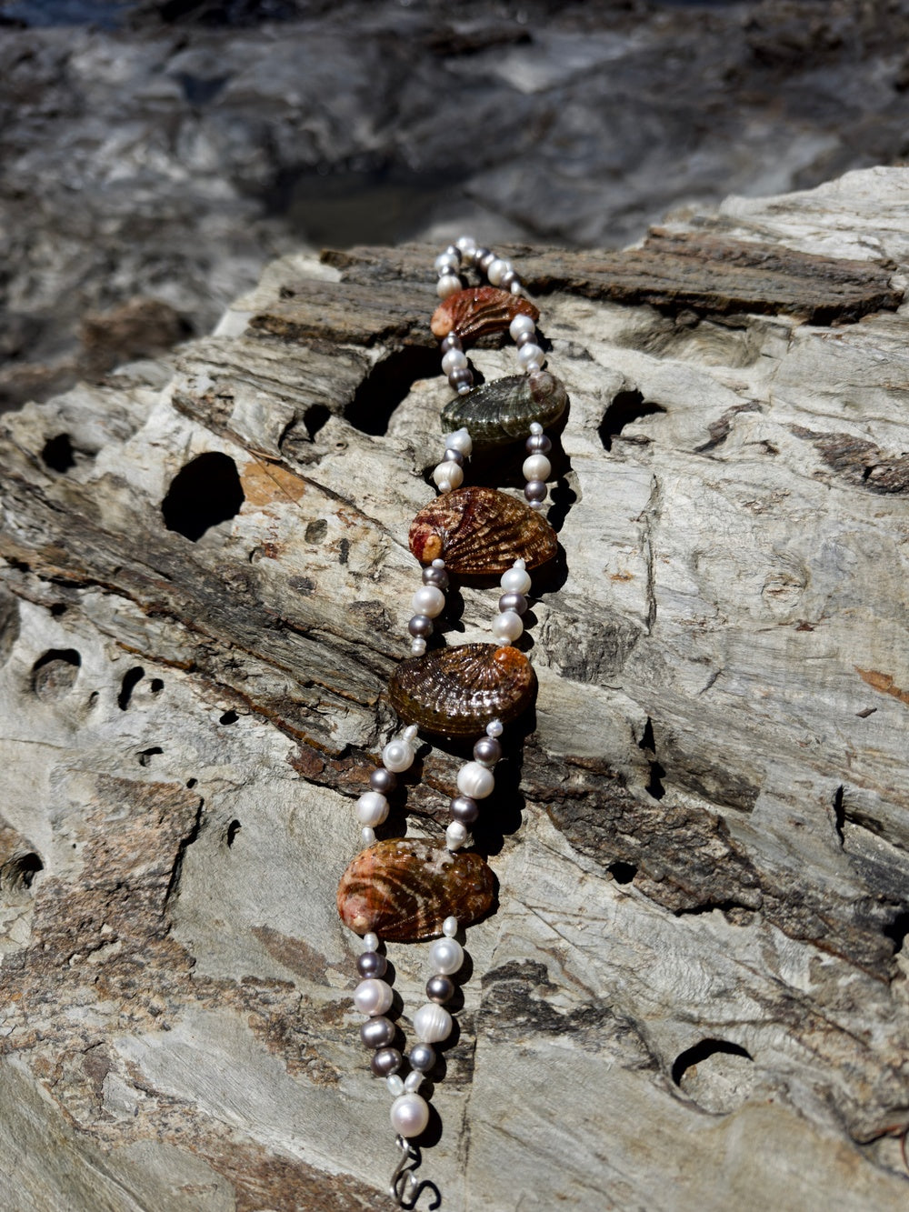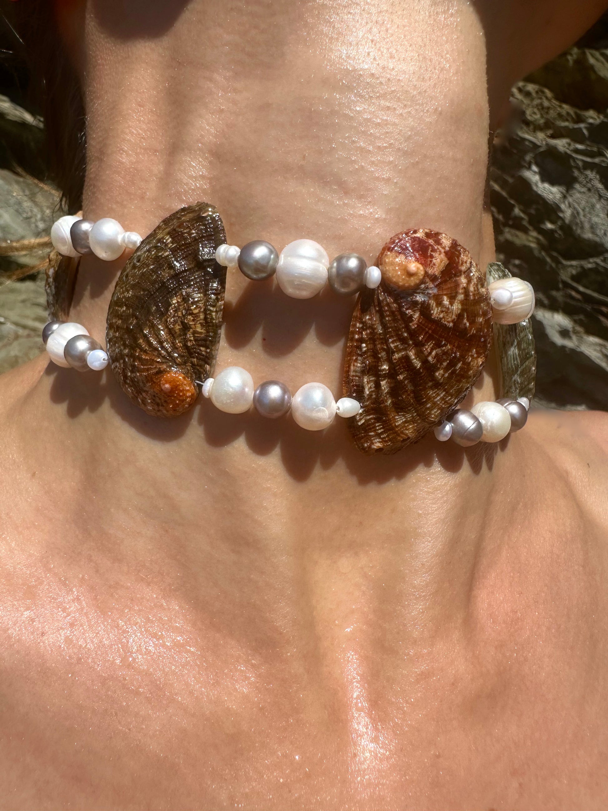 LEON · collar choker reversible elaborado con múltiples conchas de abulón en tonos rojizos y verdes, acompañado de varias perlas de agua dulce.