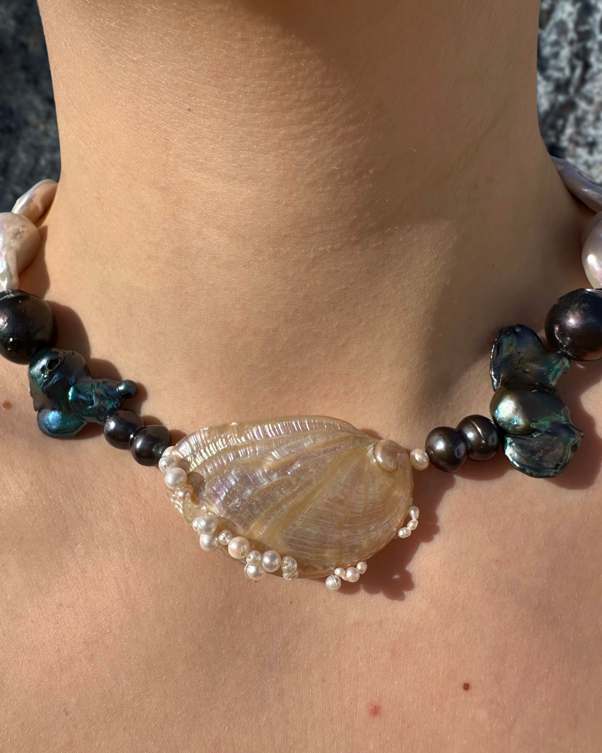 LEOPOLD · un collar espectacular para quienes buscan algo realmente llamativo : en el centro de esta pieza única se encuentra una concha de abulón con un brillo nacarado, que refleja fascinantes tonos turquesa y rosados según la luz. El elemento central está delicadamente adornado con pequeñas perlas de agua dulce, aportando elegancia y profundidad.
