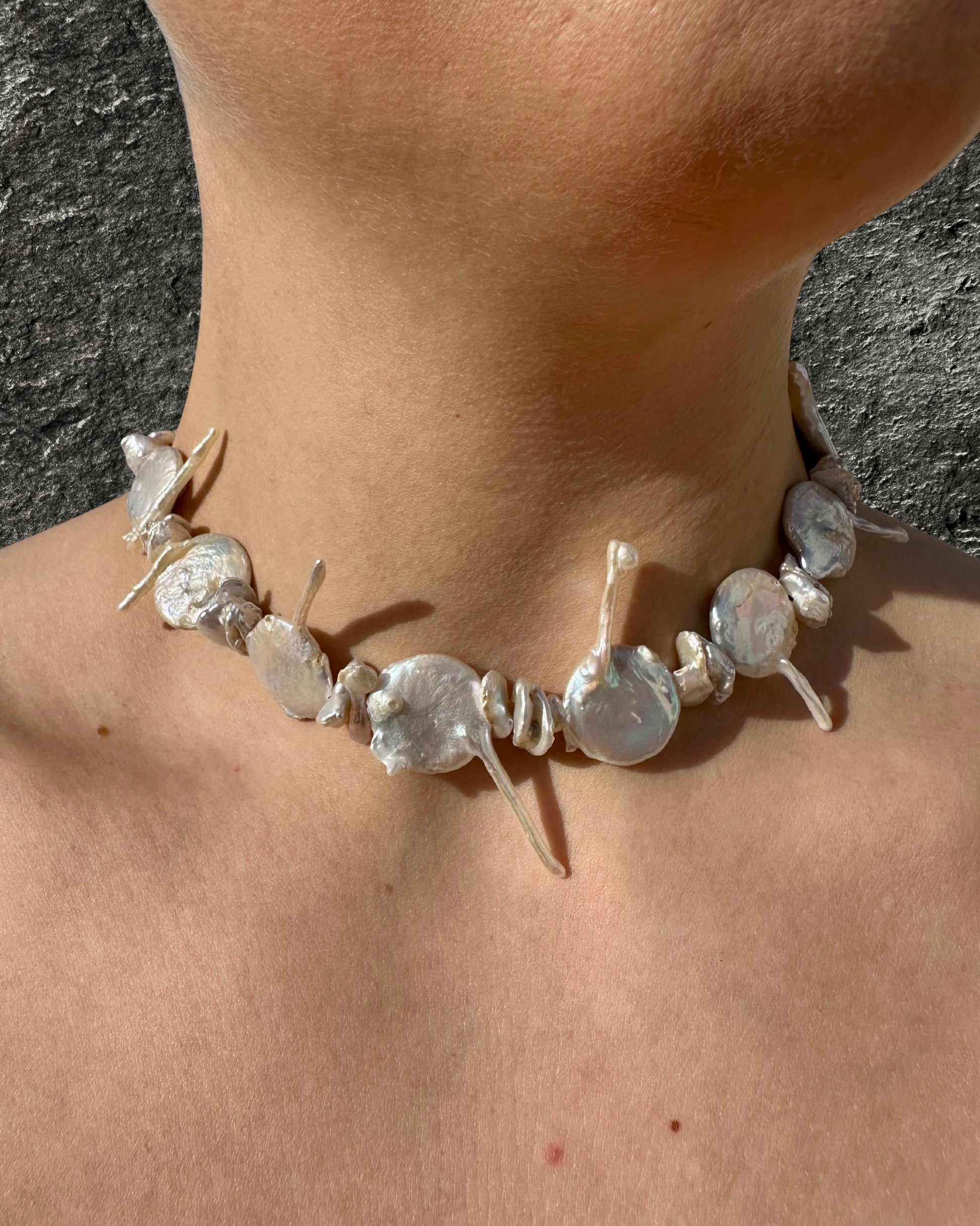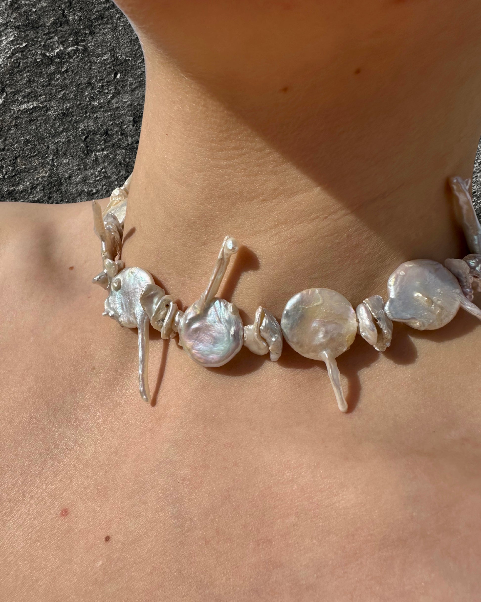 El juego entre volúmenes, texturas nacaradas y formas salvajes confiere al collar un carácter distintivo, dinámico y lleno de personalidad.