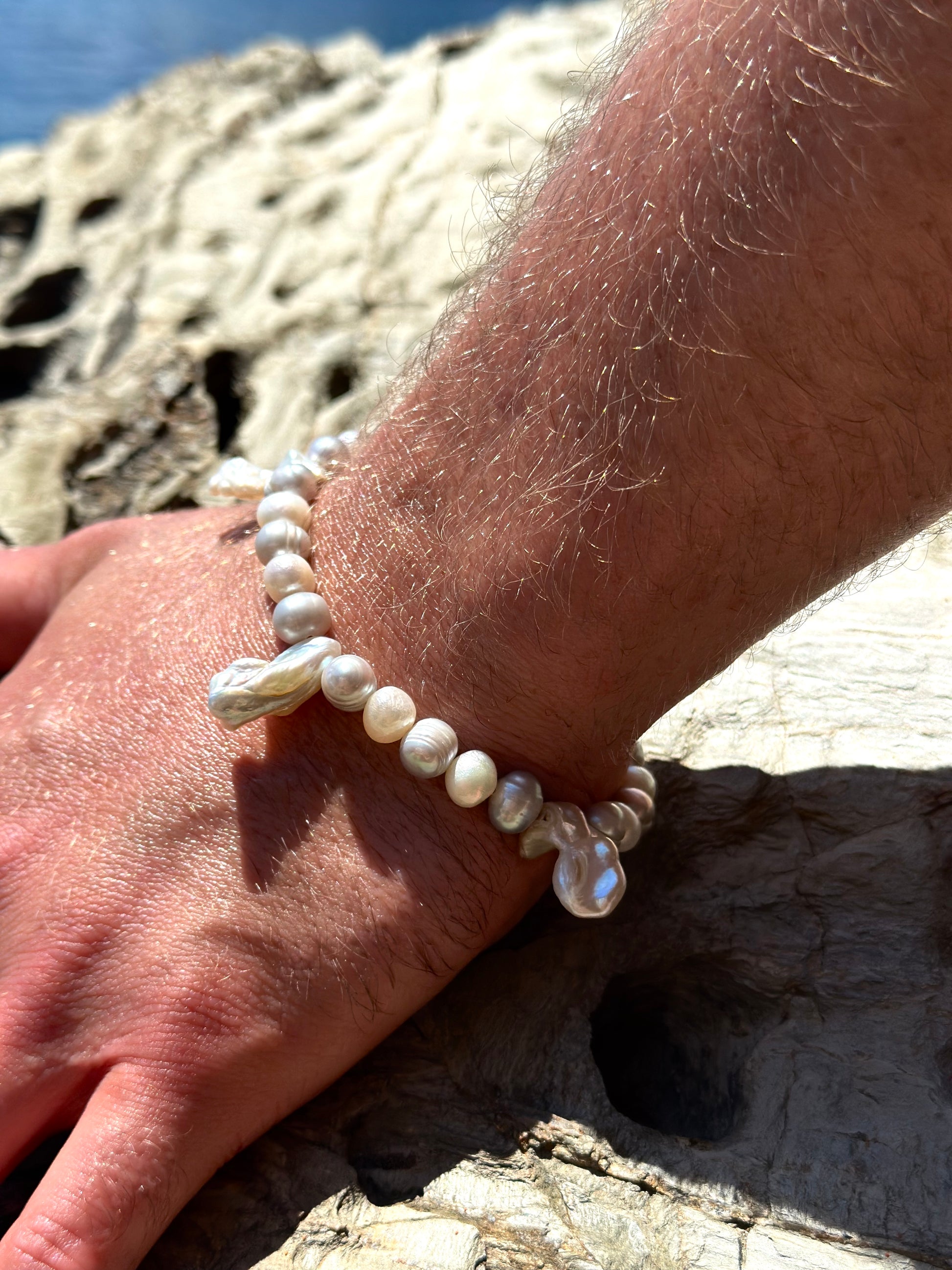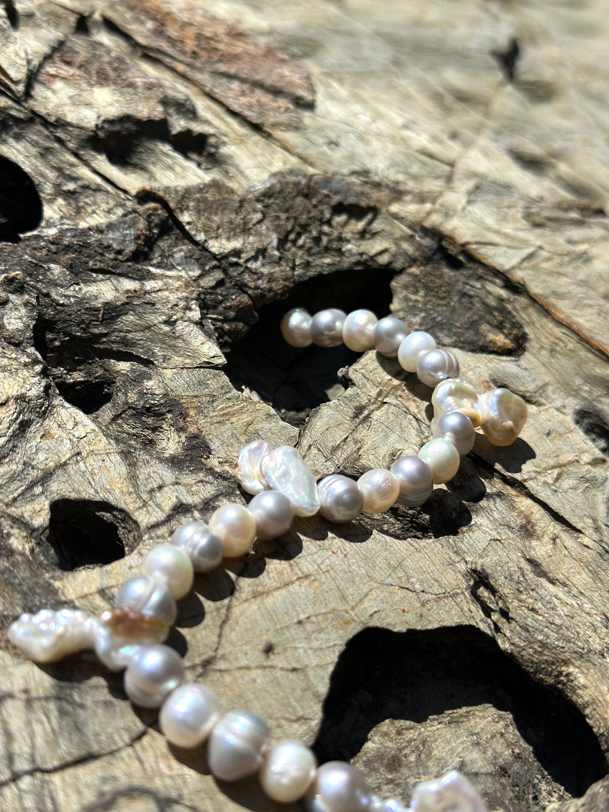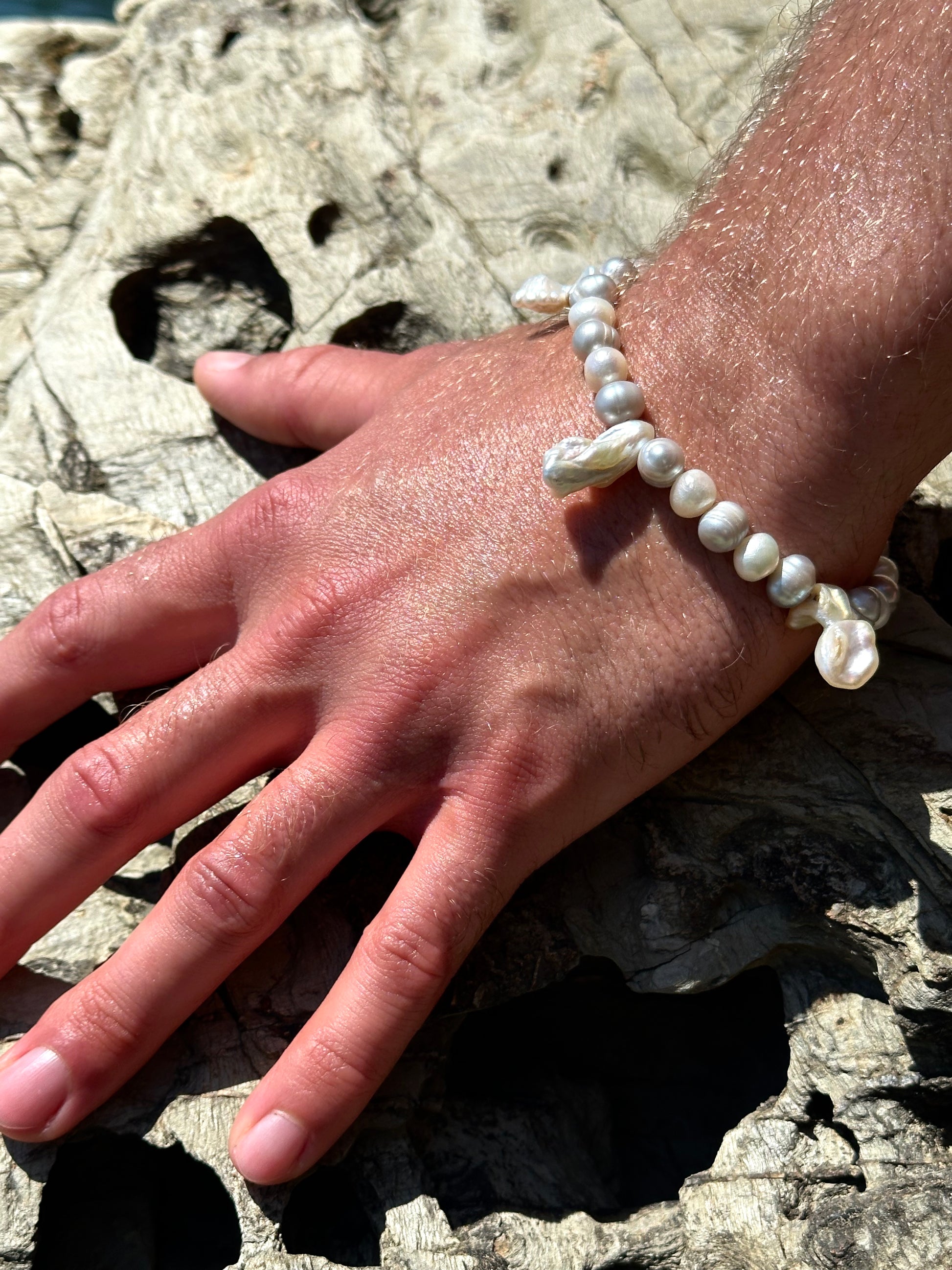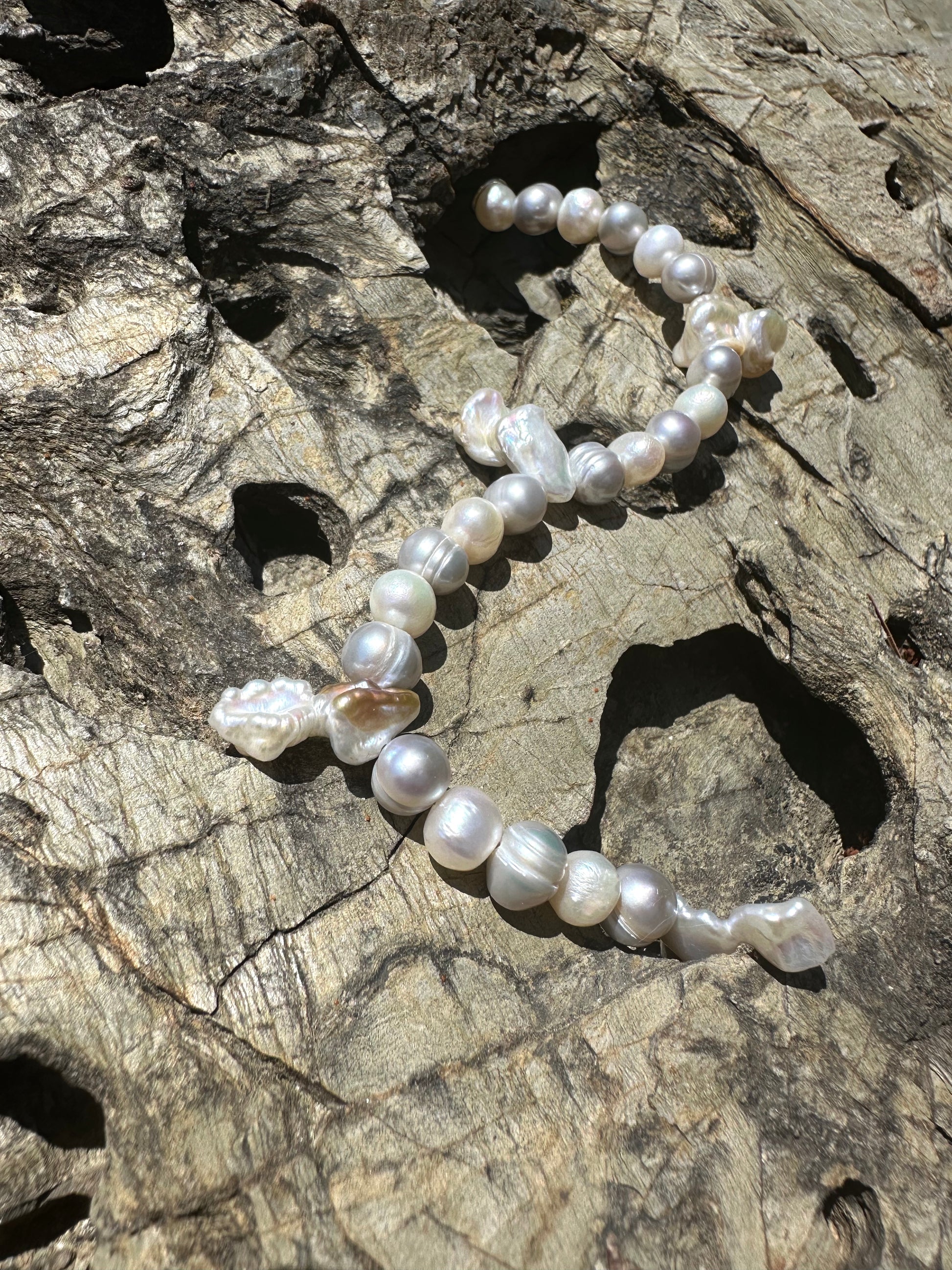 LUIS · pulsera compuesta por perlas barrocas alargadas combinadas con perlas de agua dulce en tonos blancos y plateados.