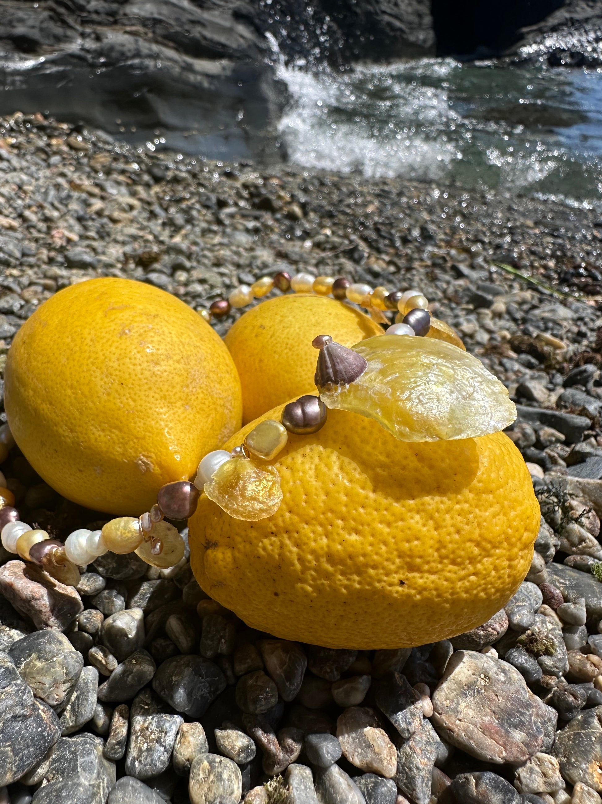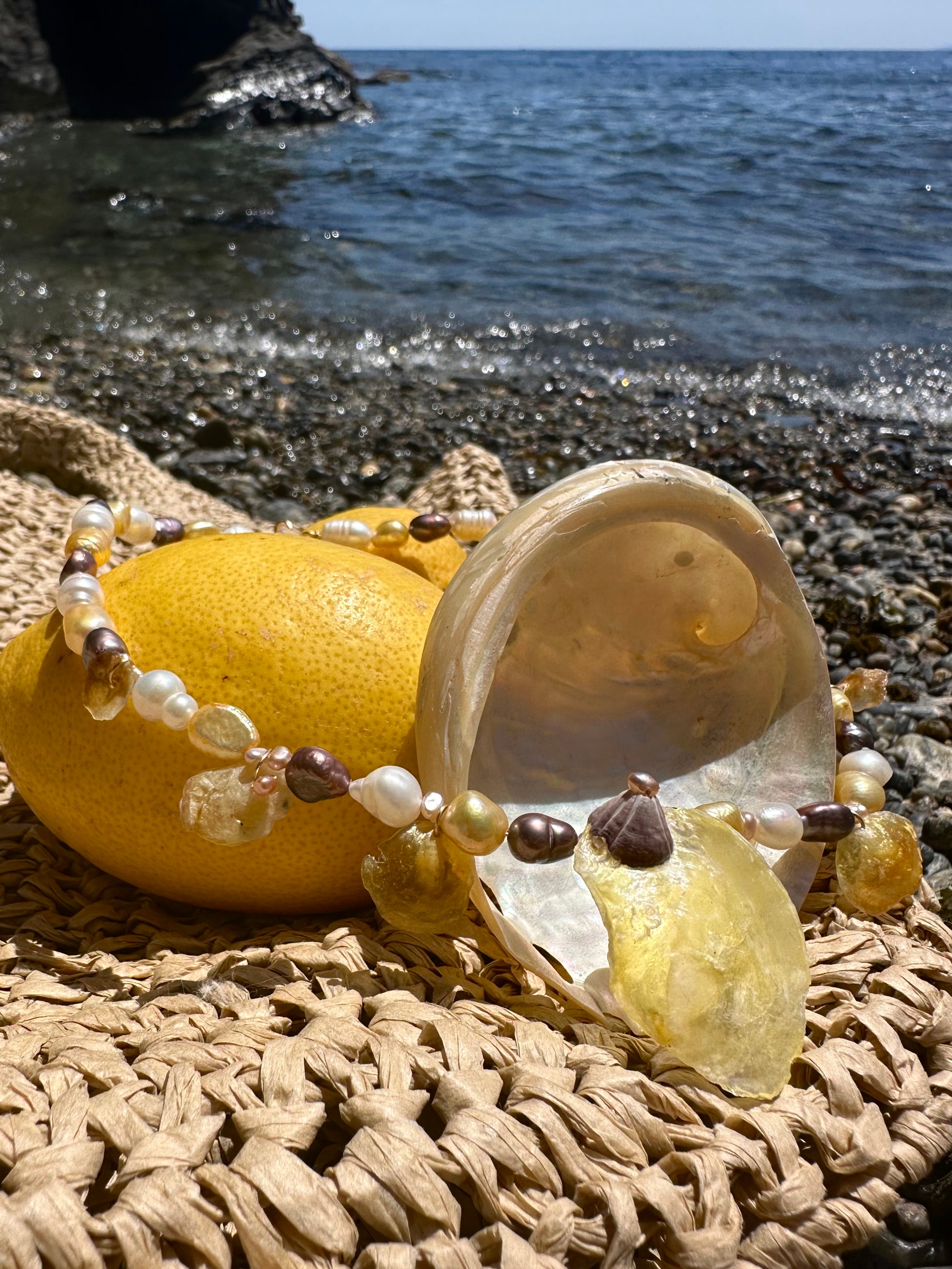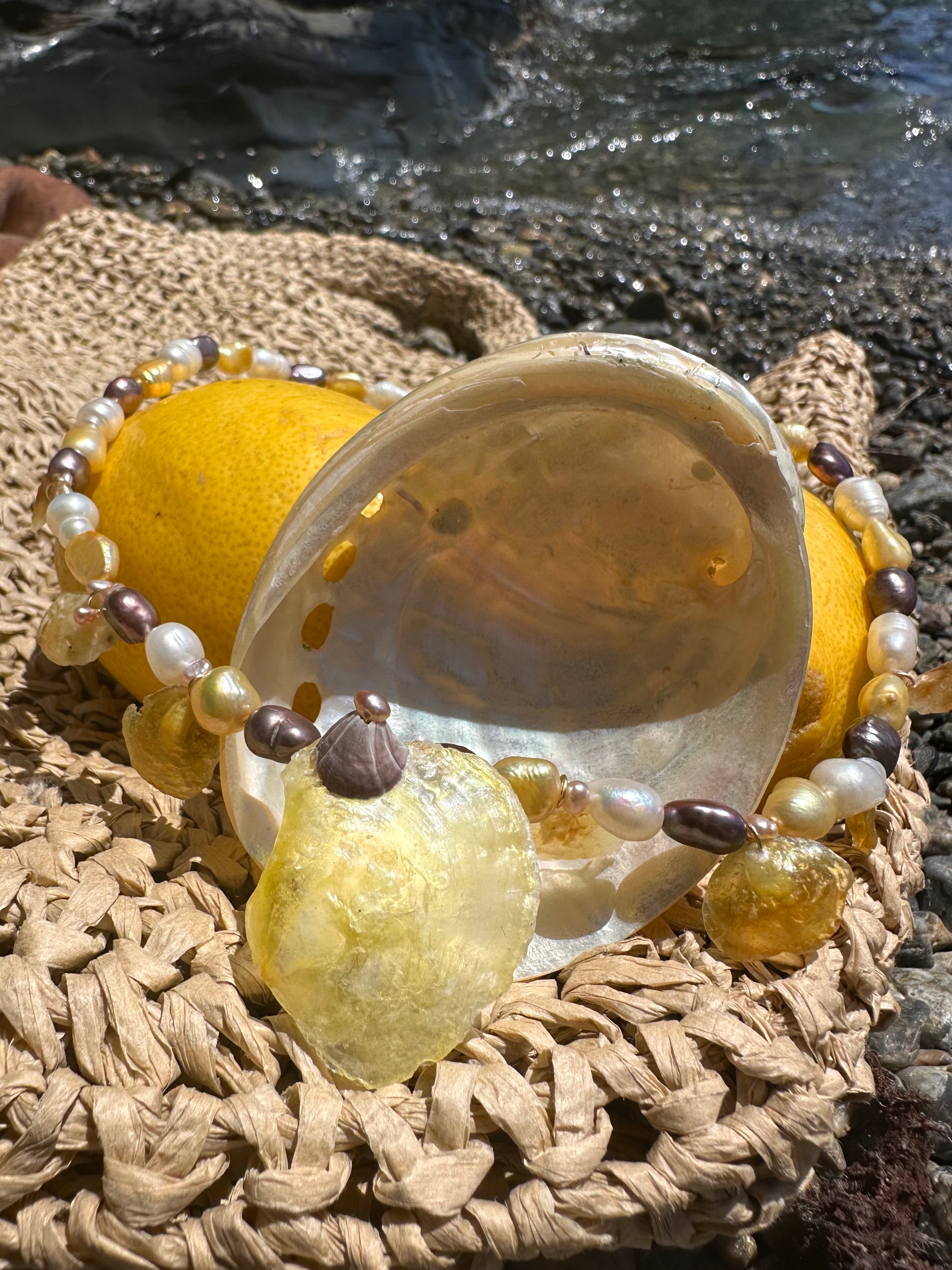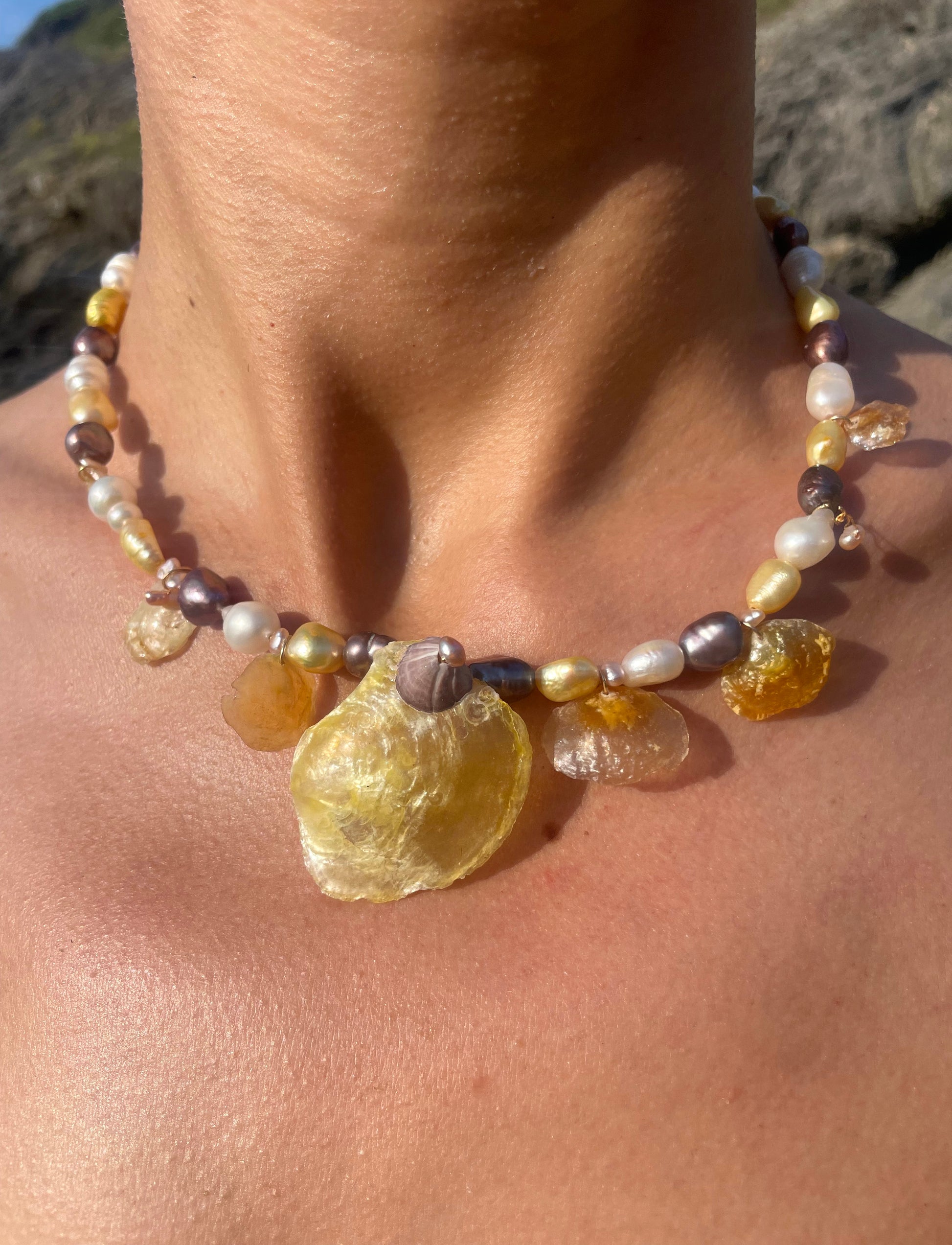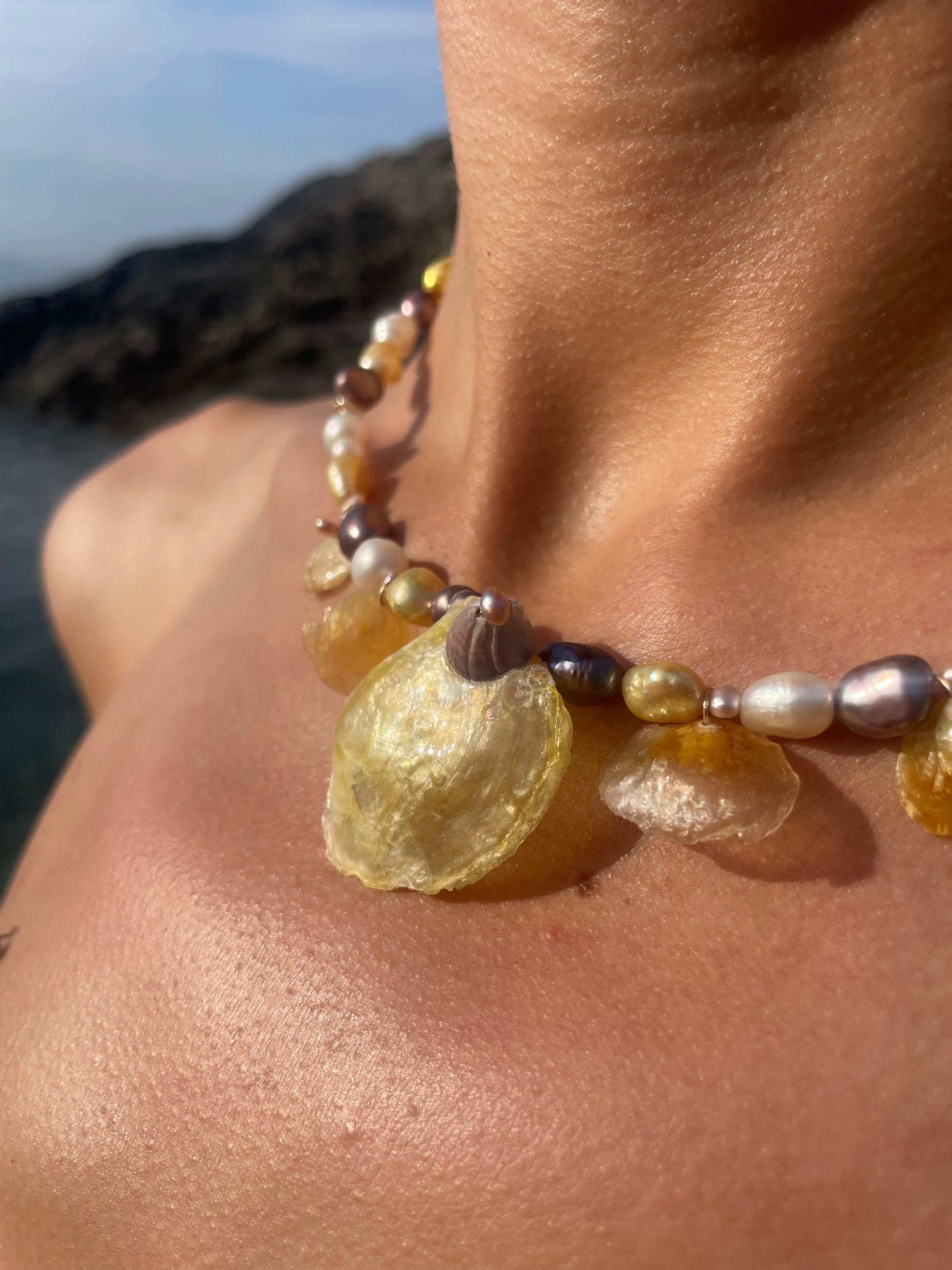 MAJA · collar de conchas doradas y perlas de agua dulce en tonos vibrantes, perfecto para sentir el espíritu del verano bajo el sol.