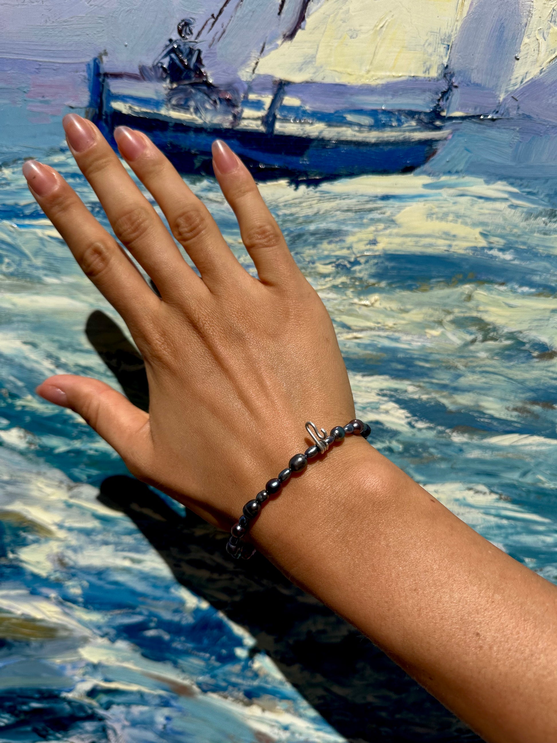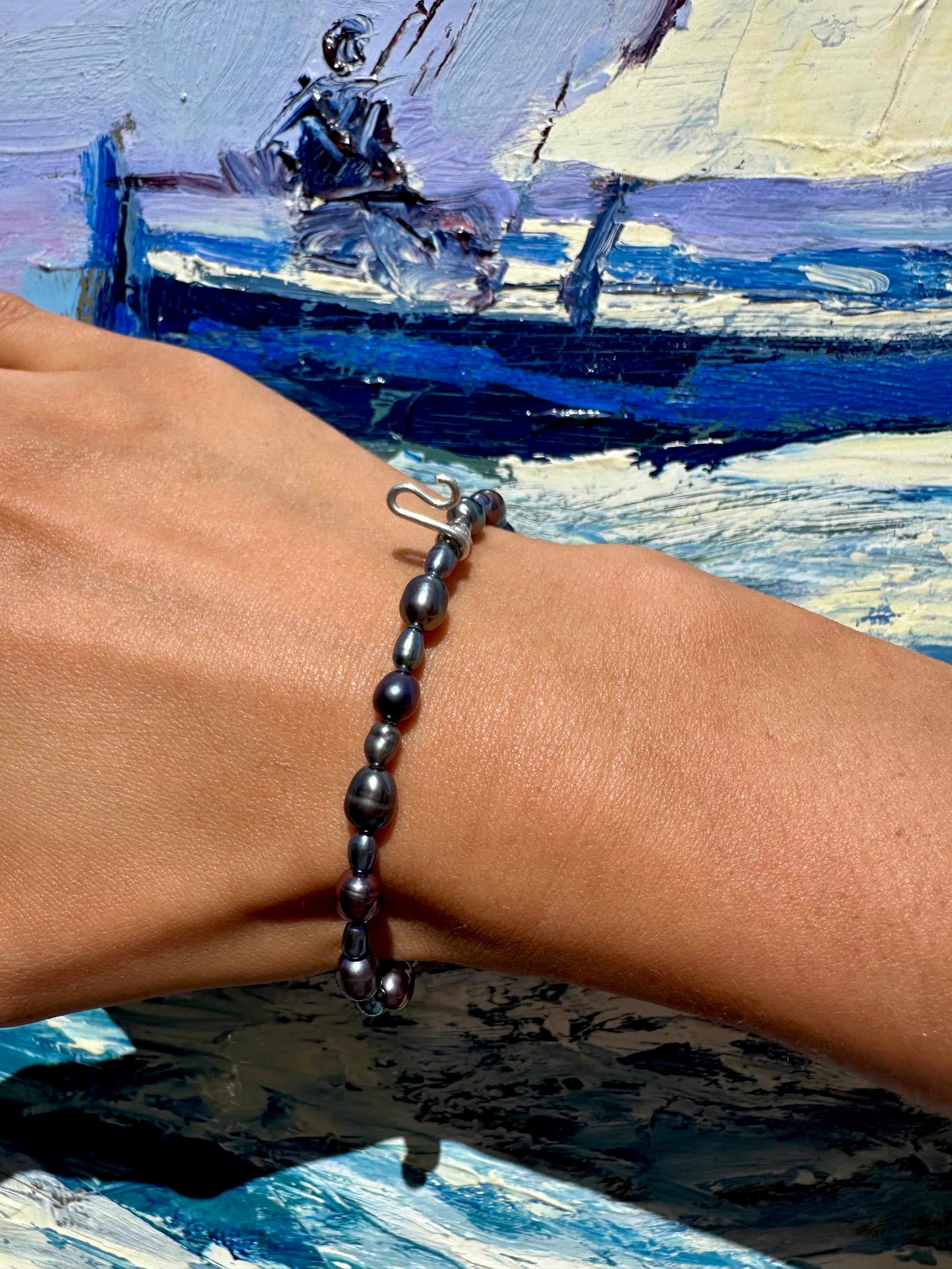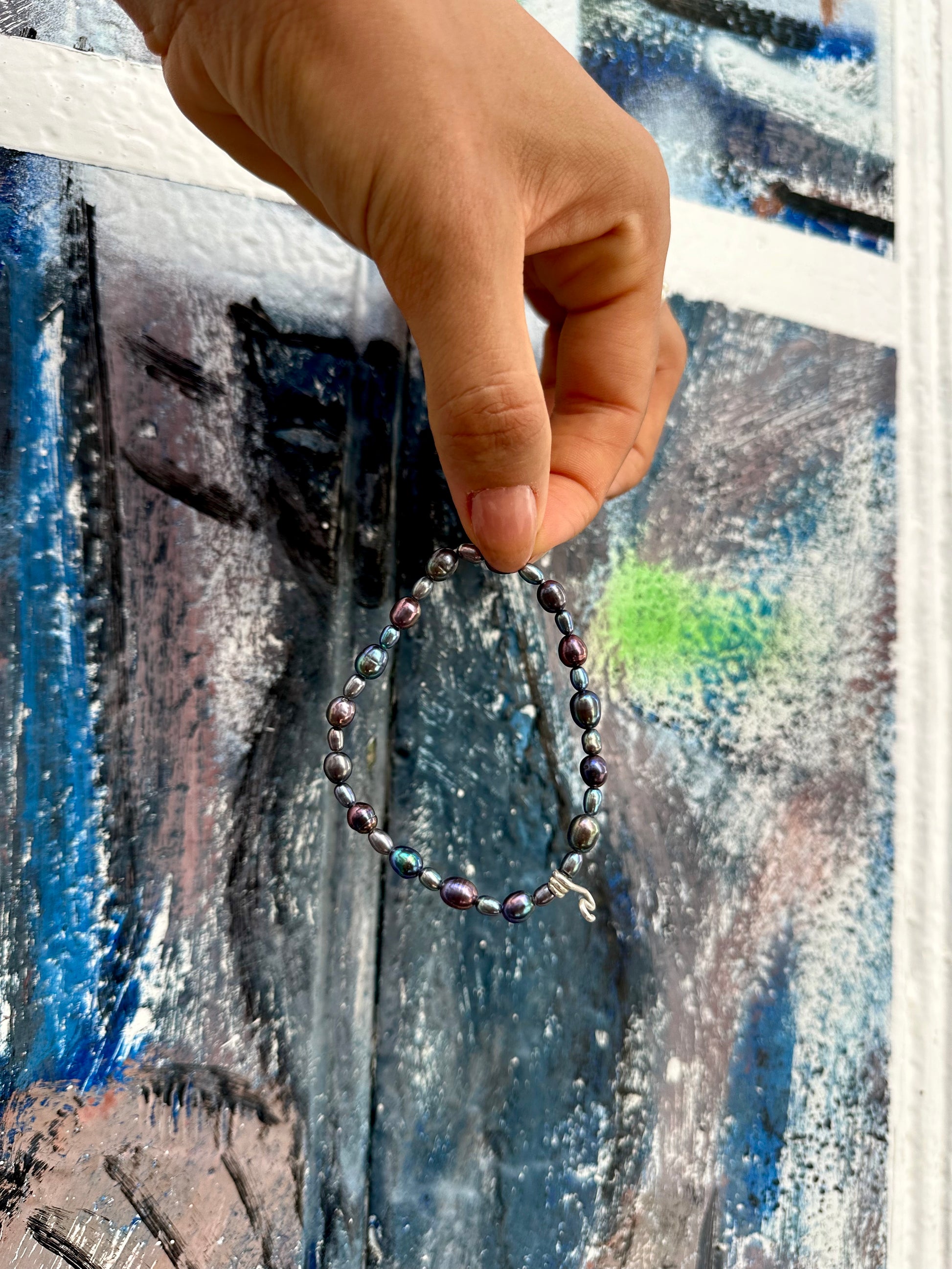 MANUEL · pulsera elástica compuesta por perlas de agua dulce oscuras, en tonos azul, verde y lila, con un detalle "salti" en plata 925. Es fácil de poner, cómoda y elegante.