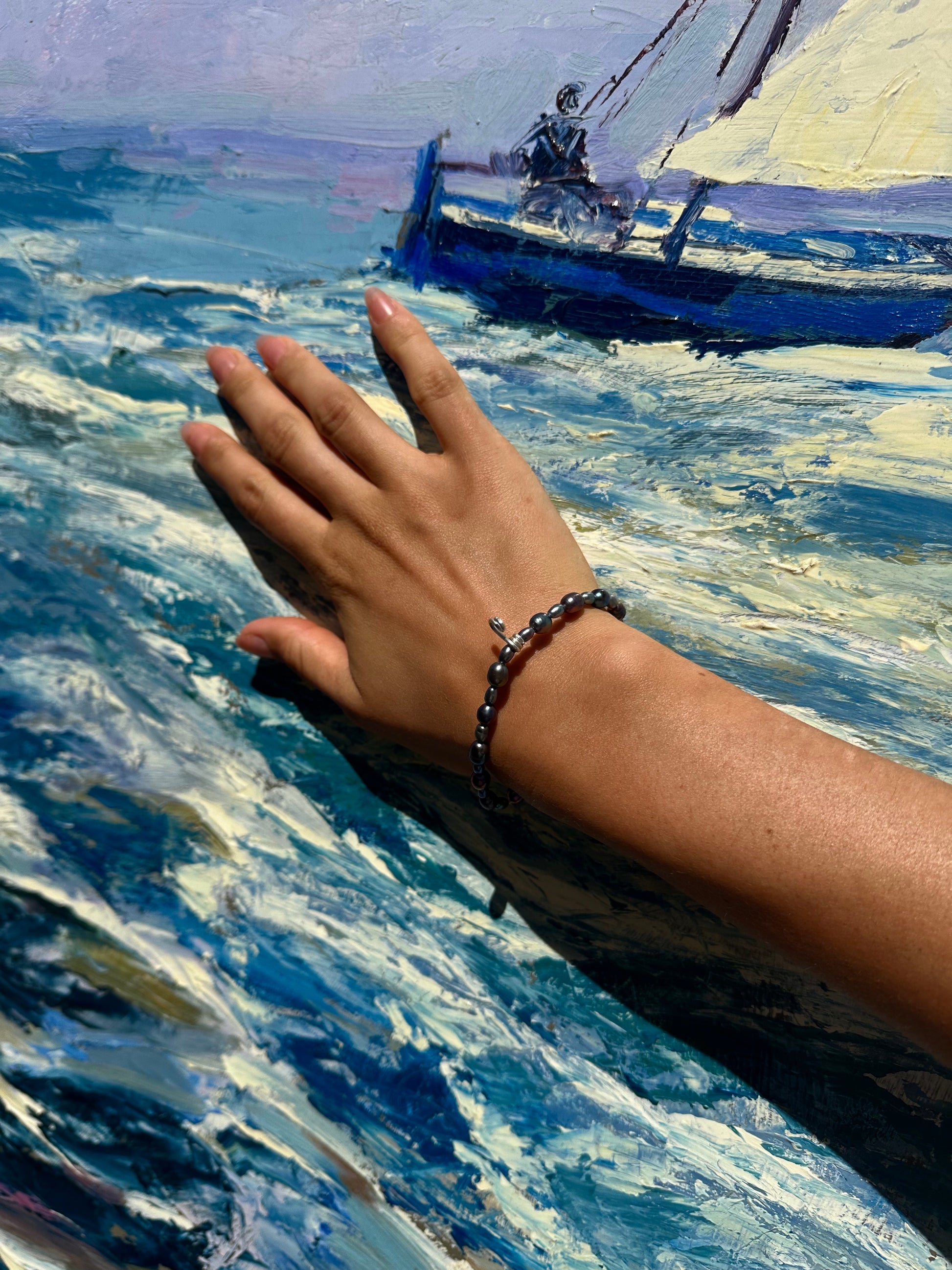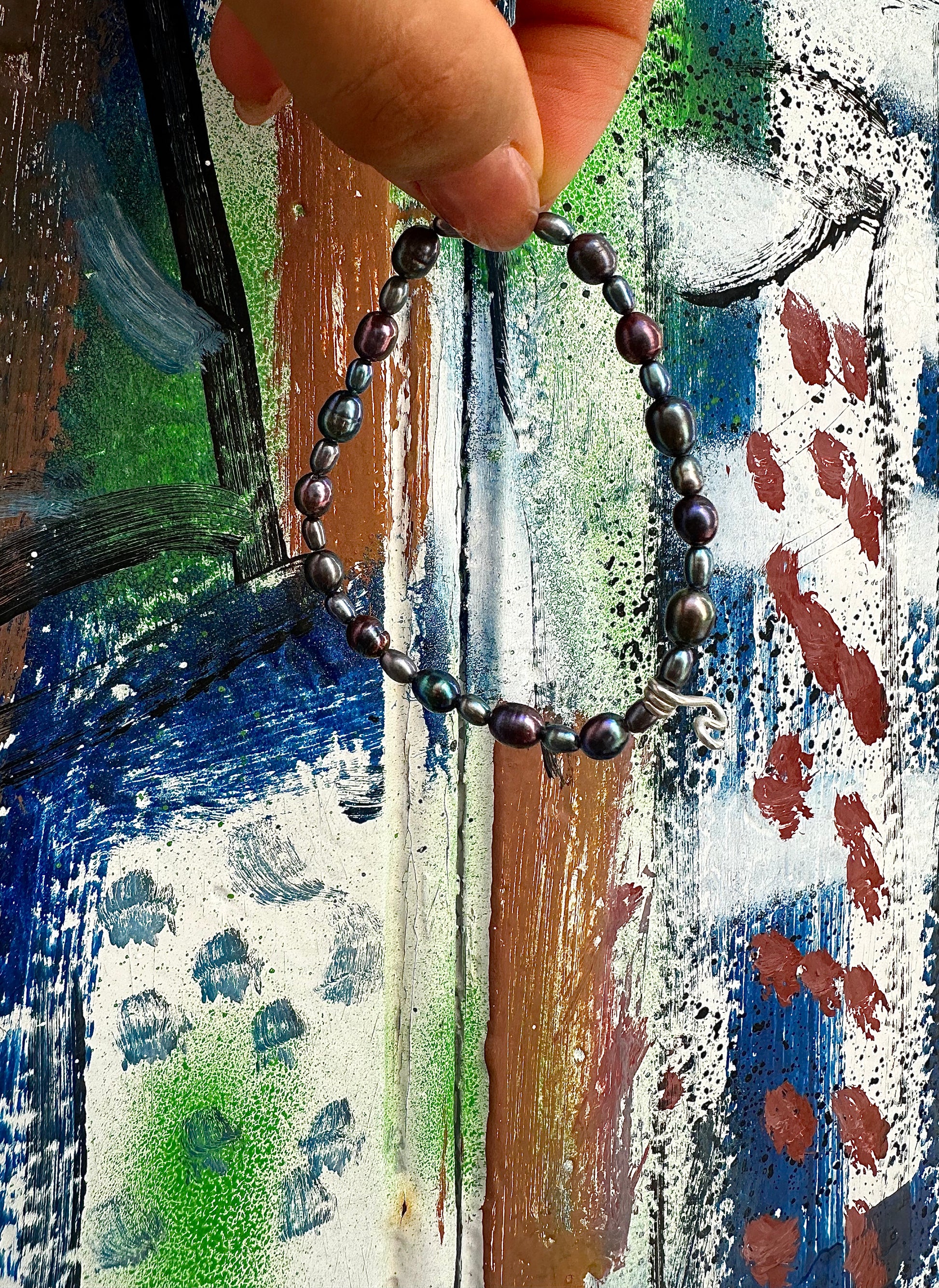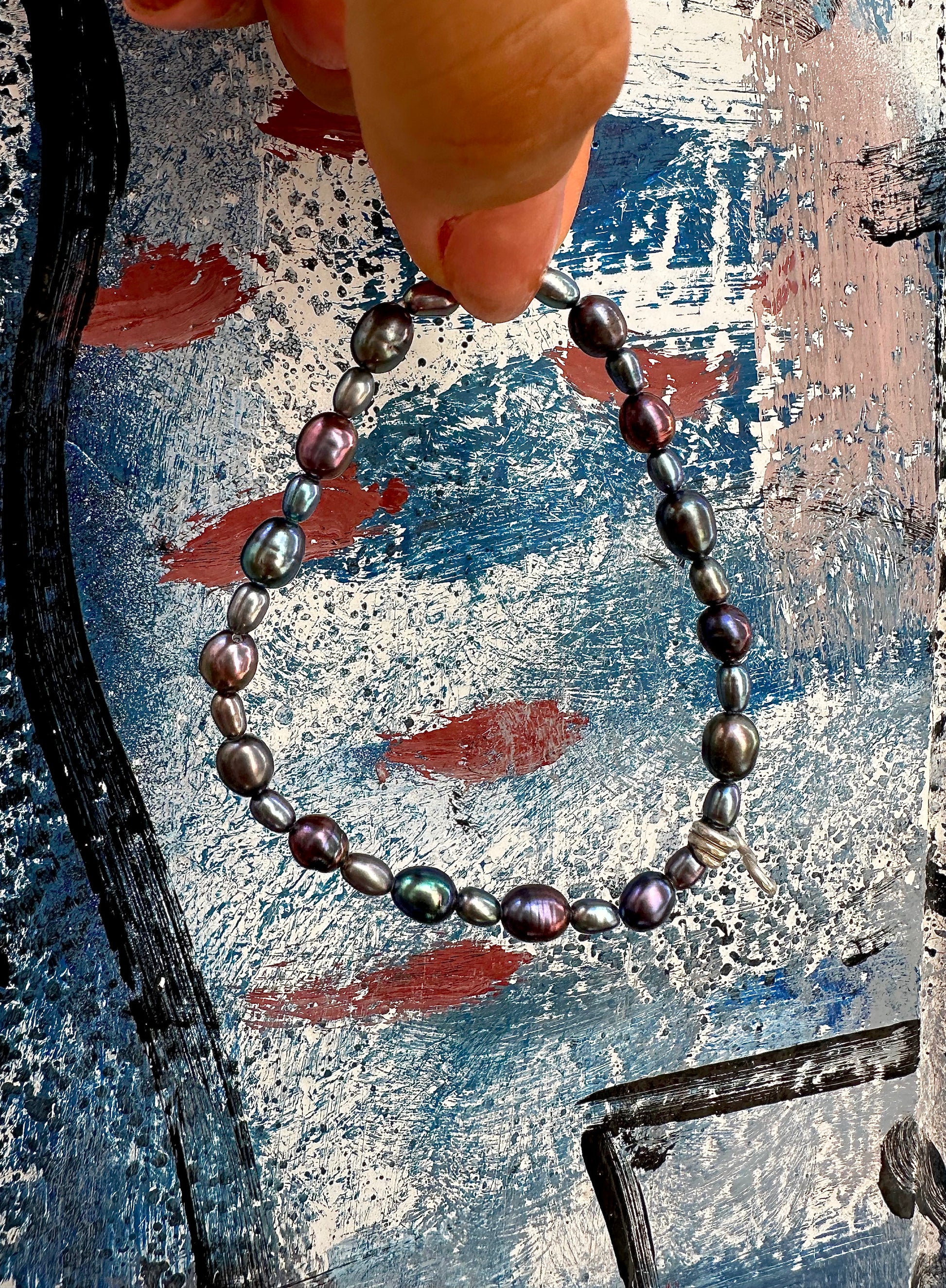 MANUEL · pulsera elástica compuesta por perlas de agua dulce oscuras, en tonos azul, verde y lila, con un detalle "salti" en plata 925. Es fácil de poner, cómoda y elegante.