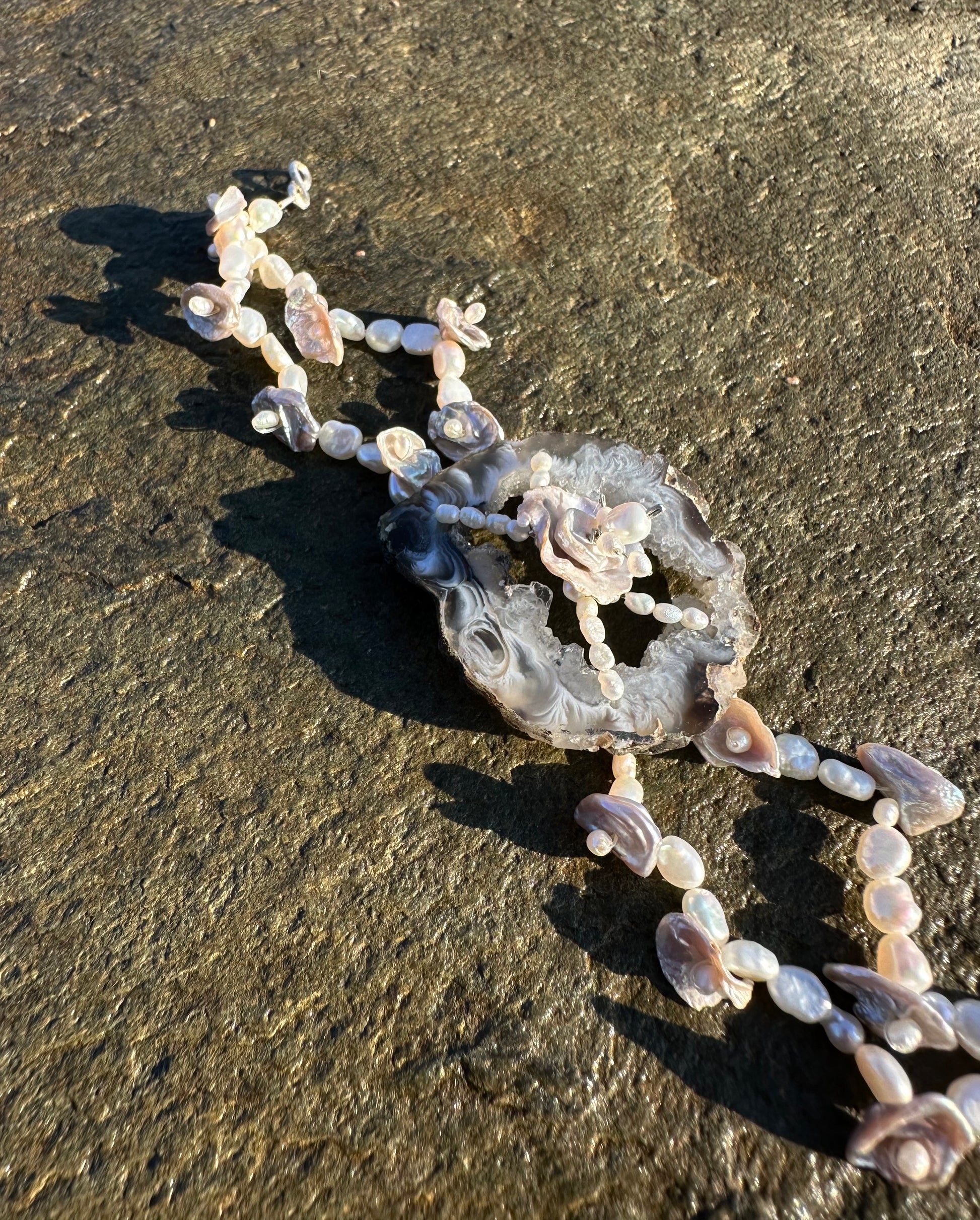Las perlas Keshi están fijadas a diminutas perlas de agua dulce que se integran suavemente en la estructura del ágata.