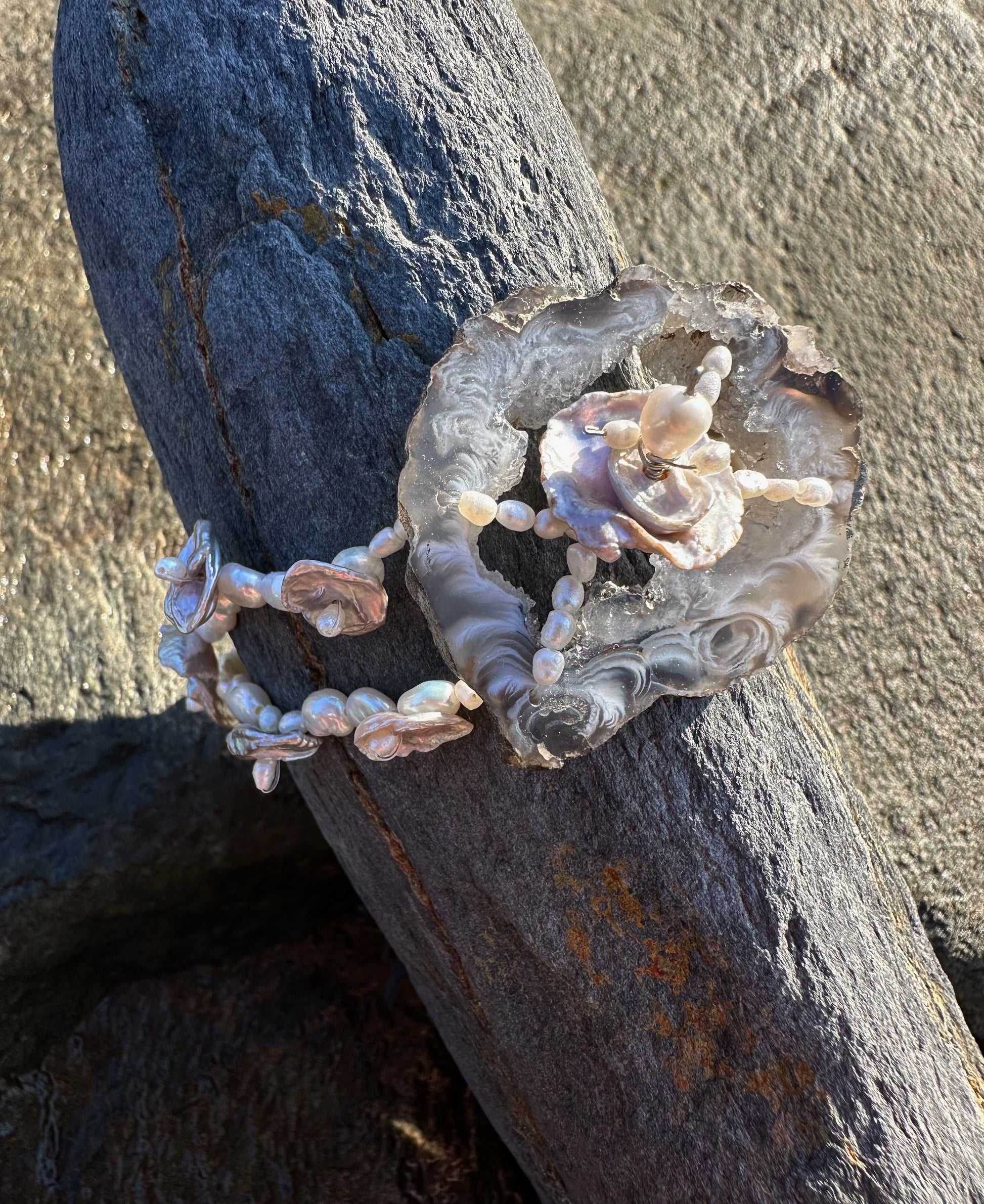 Alrededor de la muñeca, dos hileras —compuestas por pequeñas perlas Keshi plateadas y perlas de agua dulce blancas— continúan este lenguaje floral, aportando armonía, movimiento y una elegancia orgánica al diseño.