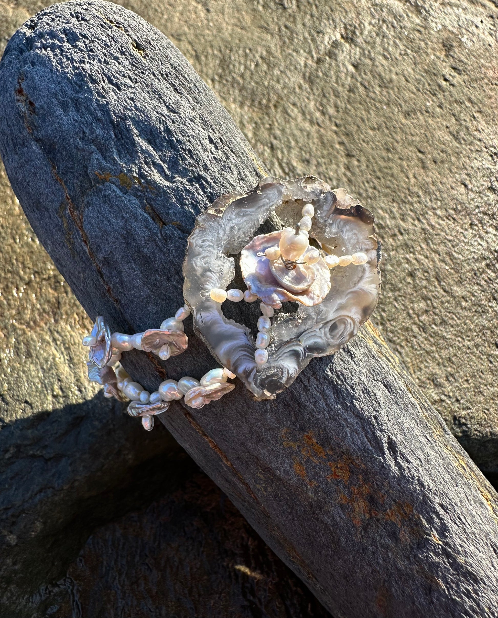 MOON · una pulsera verdaderamente única, protagonizada por una pieza de ágata en tonos blancos y grises con un sutil brillo cristalino. En el centro del mineral se encuentra una perla Keshi plateada con reflejos nacarados, sobre la cual descansa otra Keshi más pequeña. De entre ellas asoman pequeñas perlas de agua dulce fijadas en alambre de plata 925, que evocan delicados estambres, creando un marcado efecto floral.