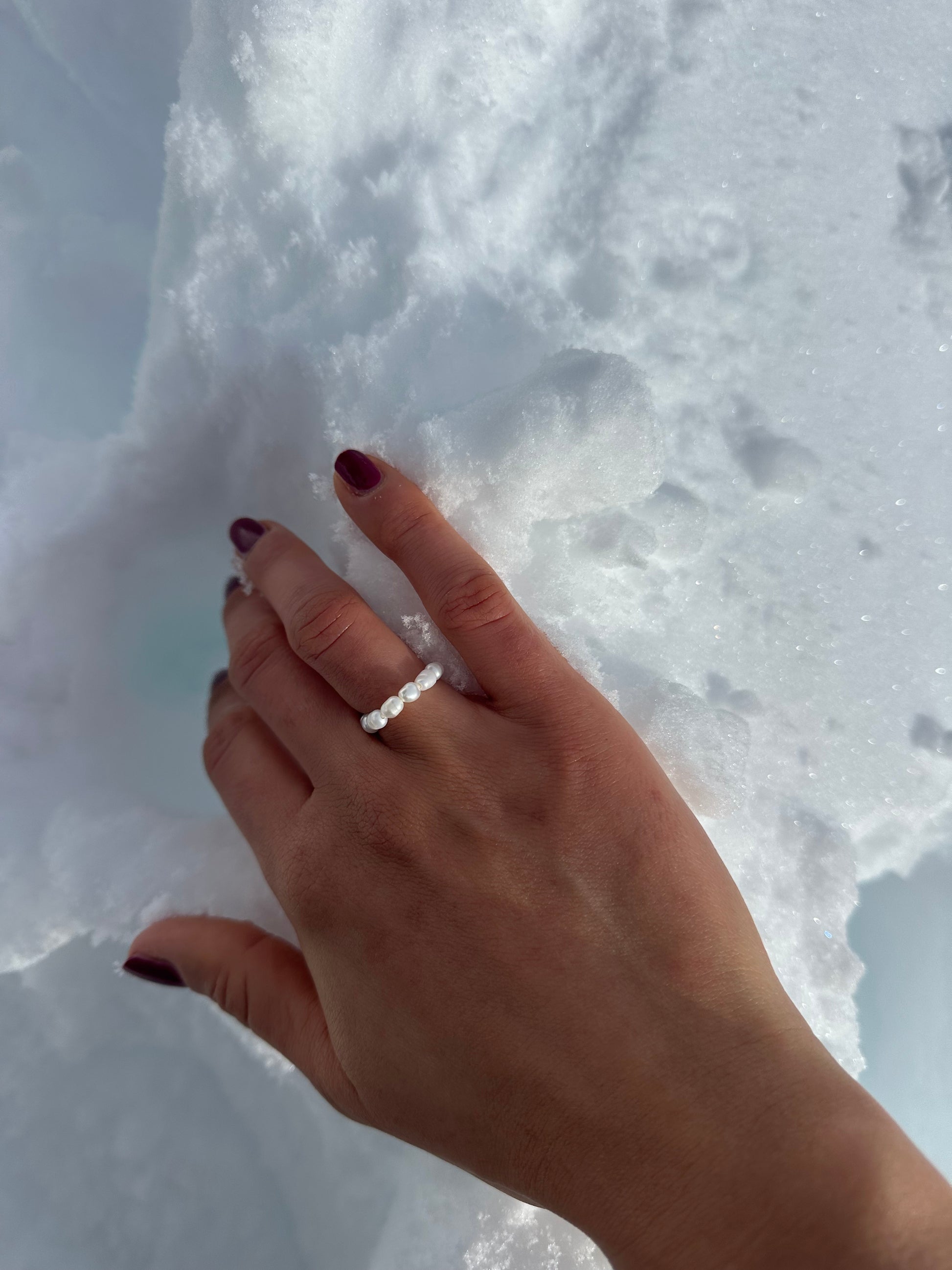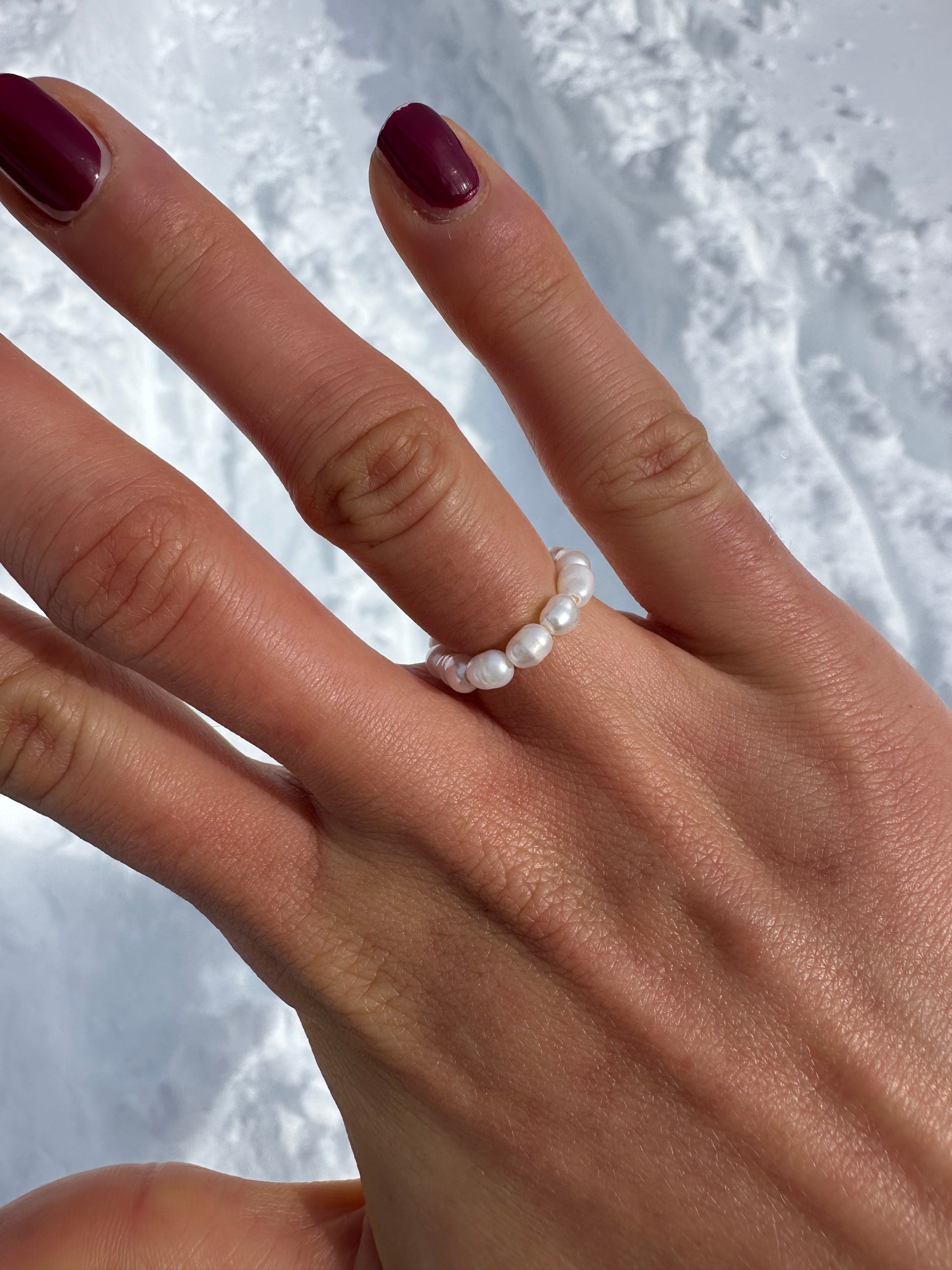MORVANE · anillo elástico y delicado compuesto por pequeñas perlas de agua dulce perforadas longitudinalmente, creando un efecto visual más fino y estilizado.