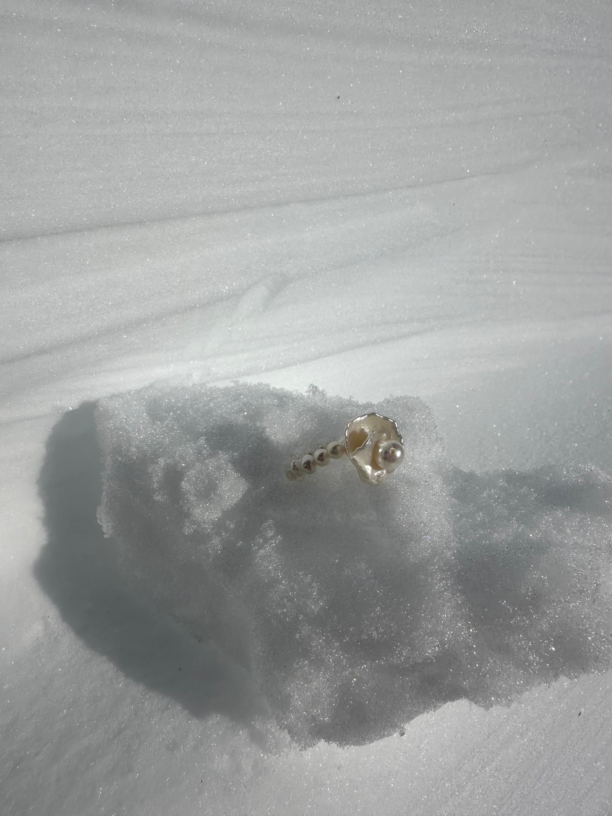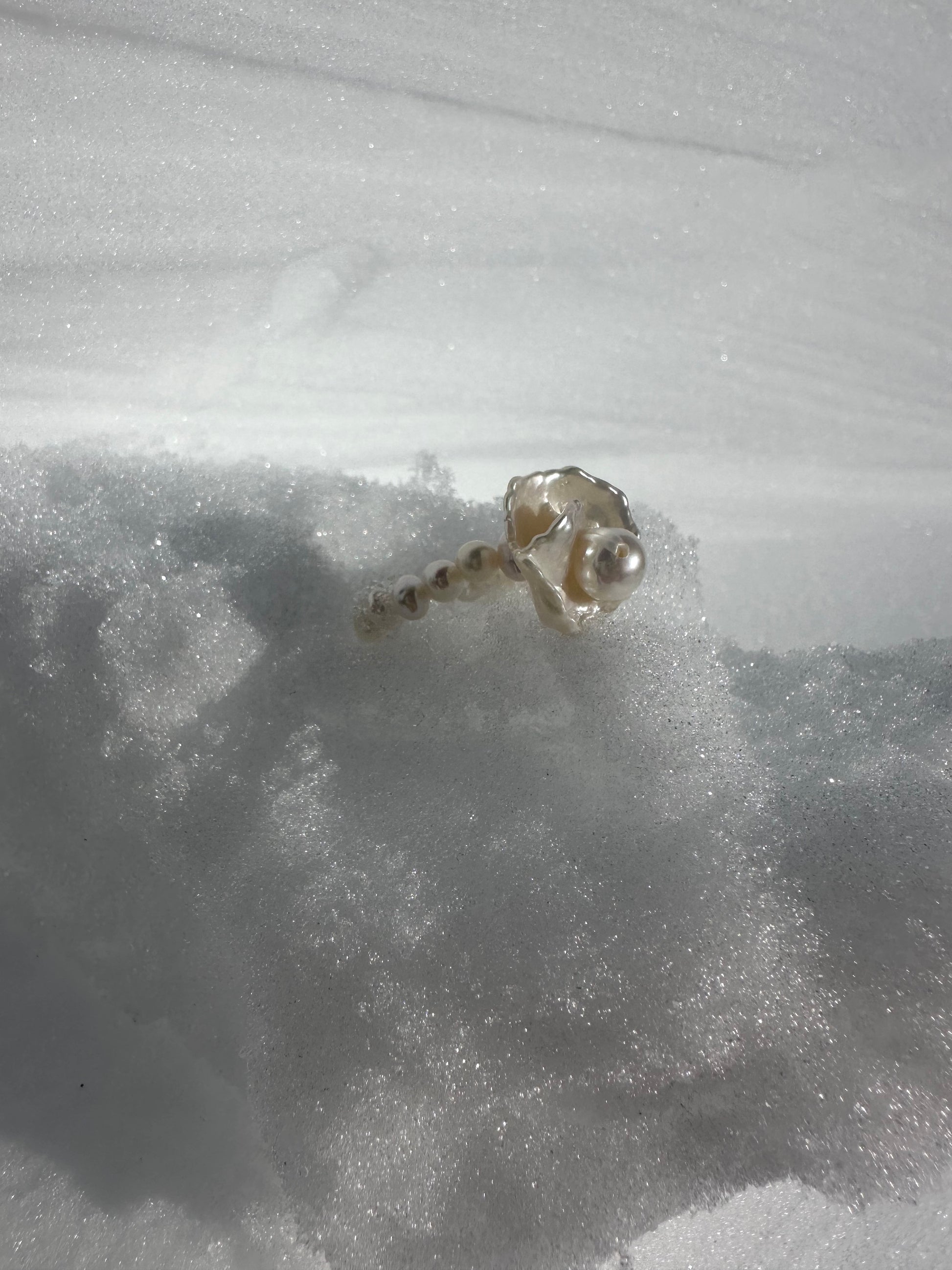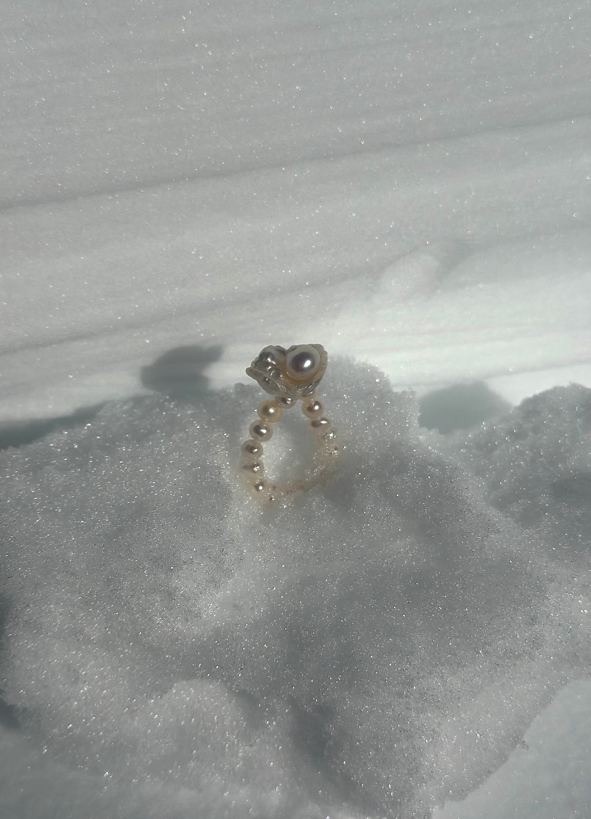 NANNI · anillo elástico con una perla Keshi de forma floral en el centro, adornada por una gran perla redonda de agua dulce de calidad A en su núcleo.