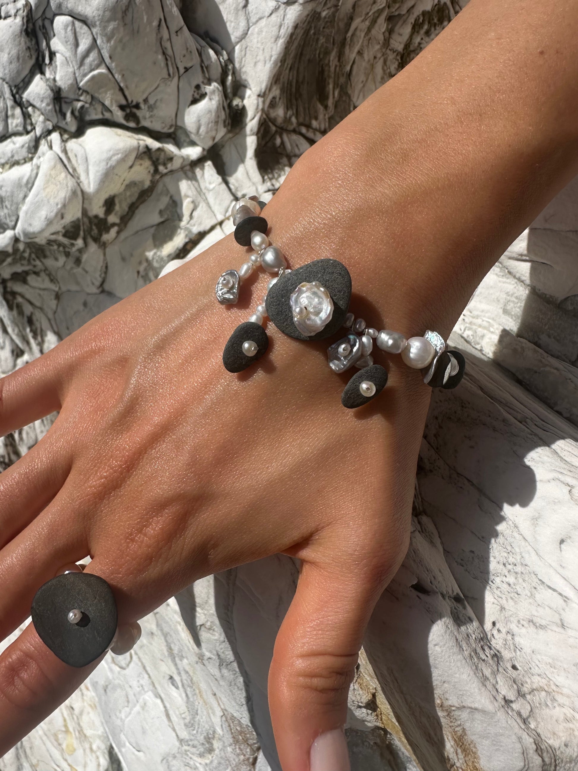 NERIO · esta pulsera reúne piedras de pizarra suavemente moldeadas por el agua, combinadas con perlas keshi de reflejos plateados.