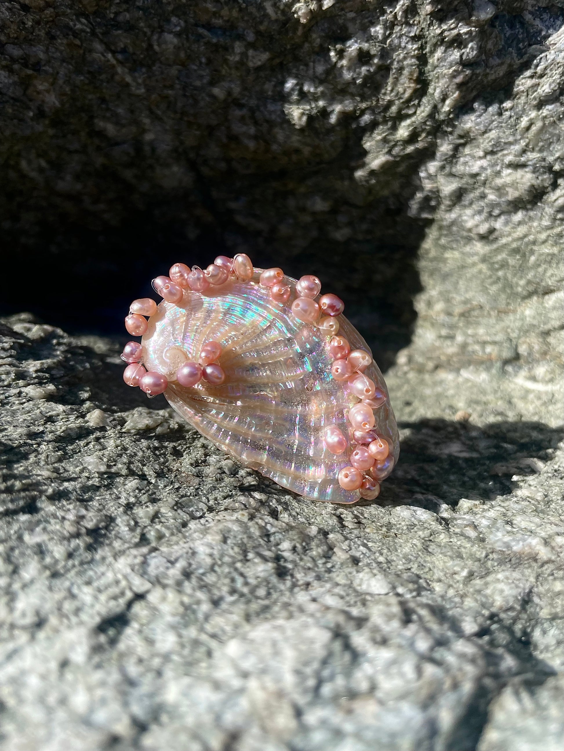 NERISSA · un anillo doble protagonizado por una gran concha de abulón, cuyo nácar luminoso revela reflejos en tonos rosados y turquesa que cambian con la luz. La superficie se encuentra adornada con numerosas pequeñas perlas en matices rosé — algunas más suaves, otras más intensas — que siguen de manera orgánica las curvas naturales de la concha.