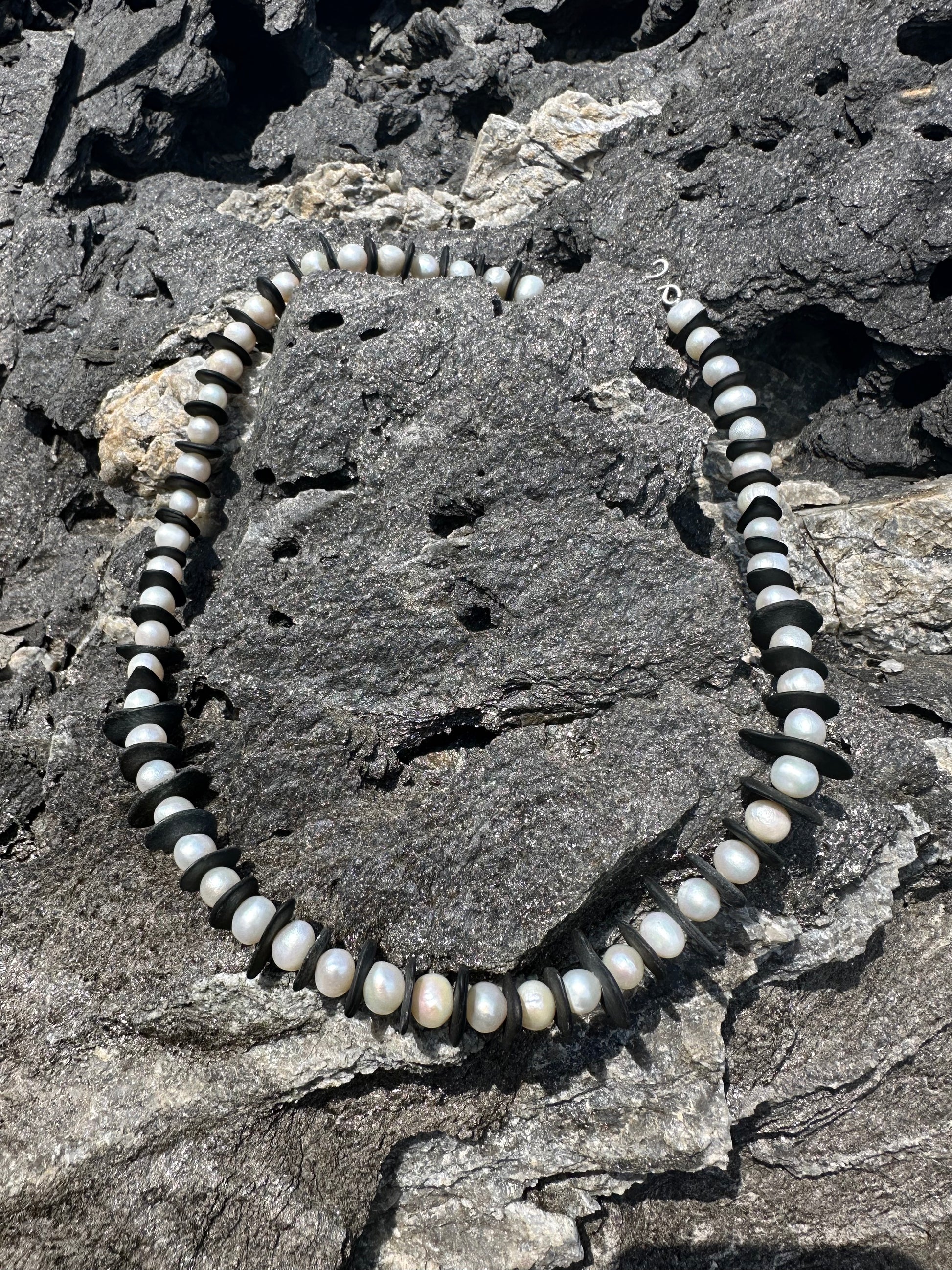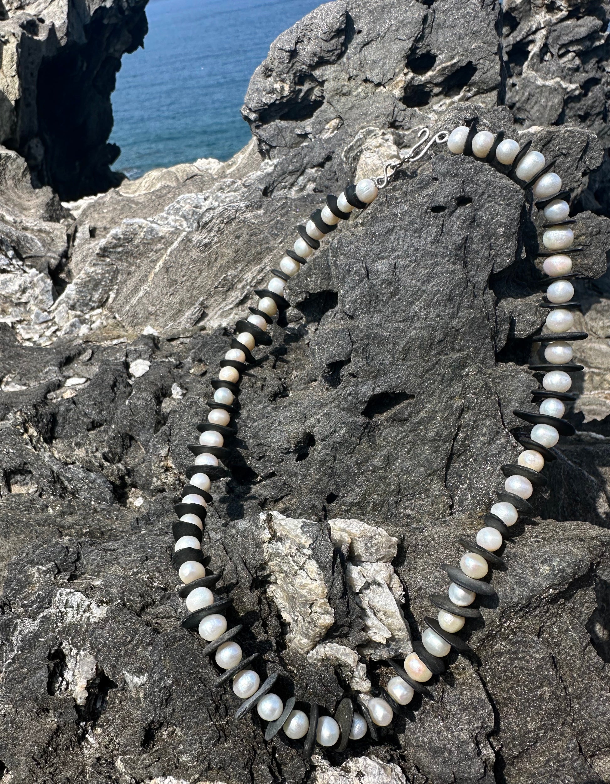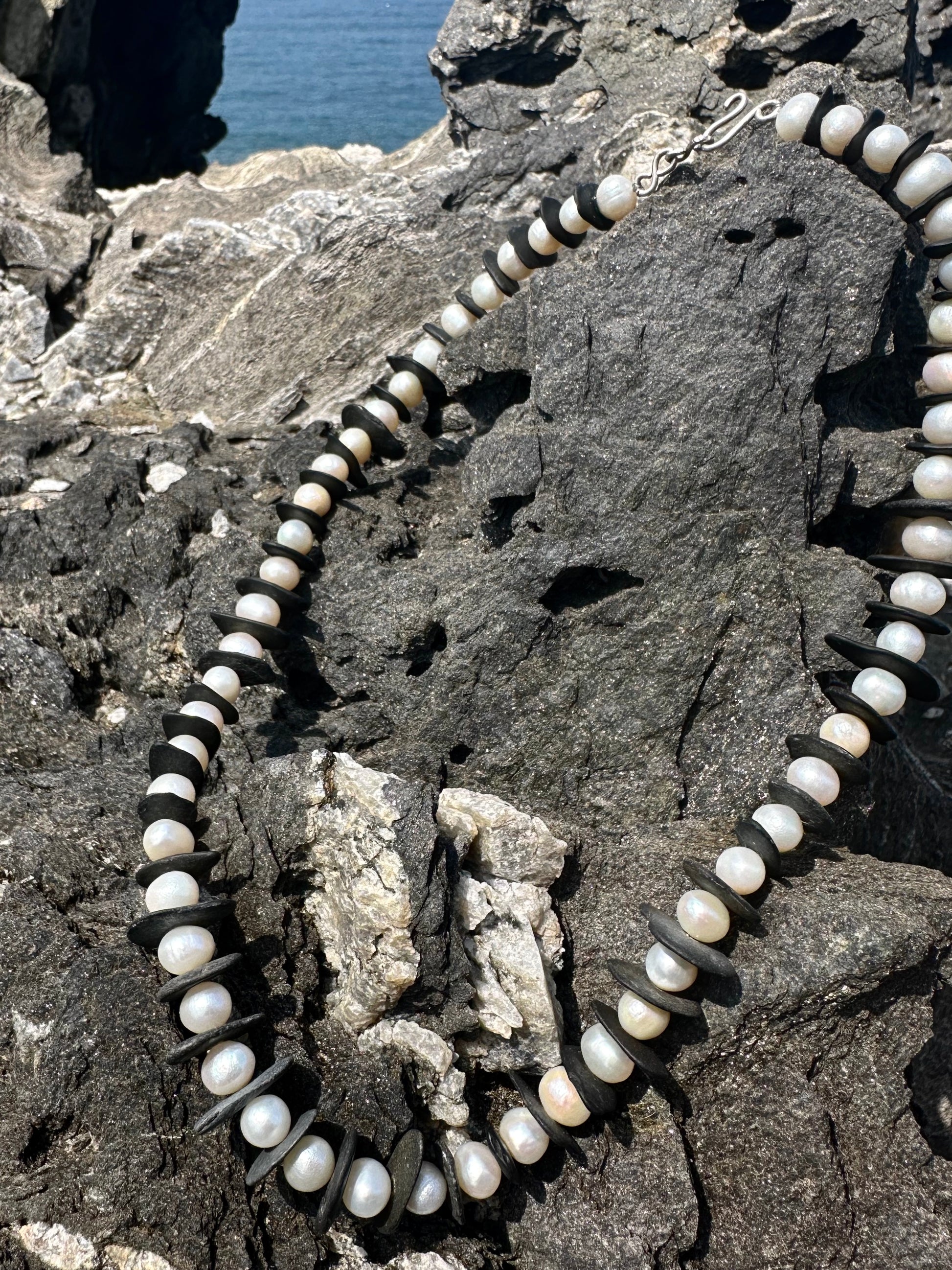 NOAH BIG· collar que combina pequeñas piedras de pizarra modeladas por el mar con perlas blancas de agua dulce.