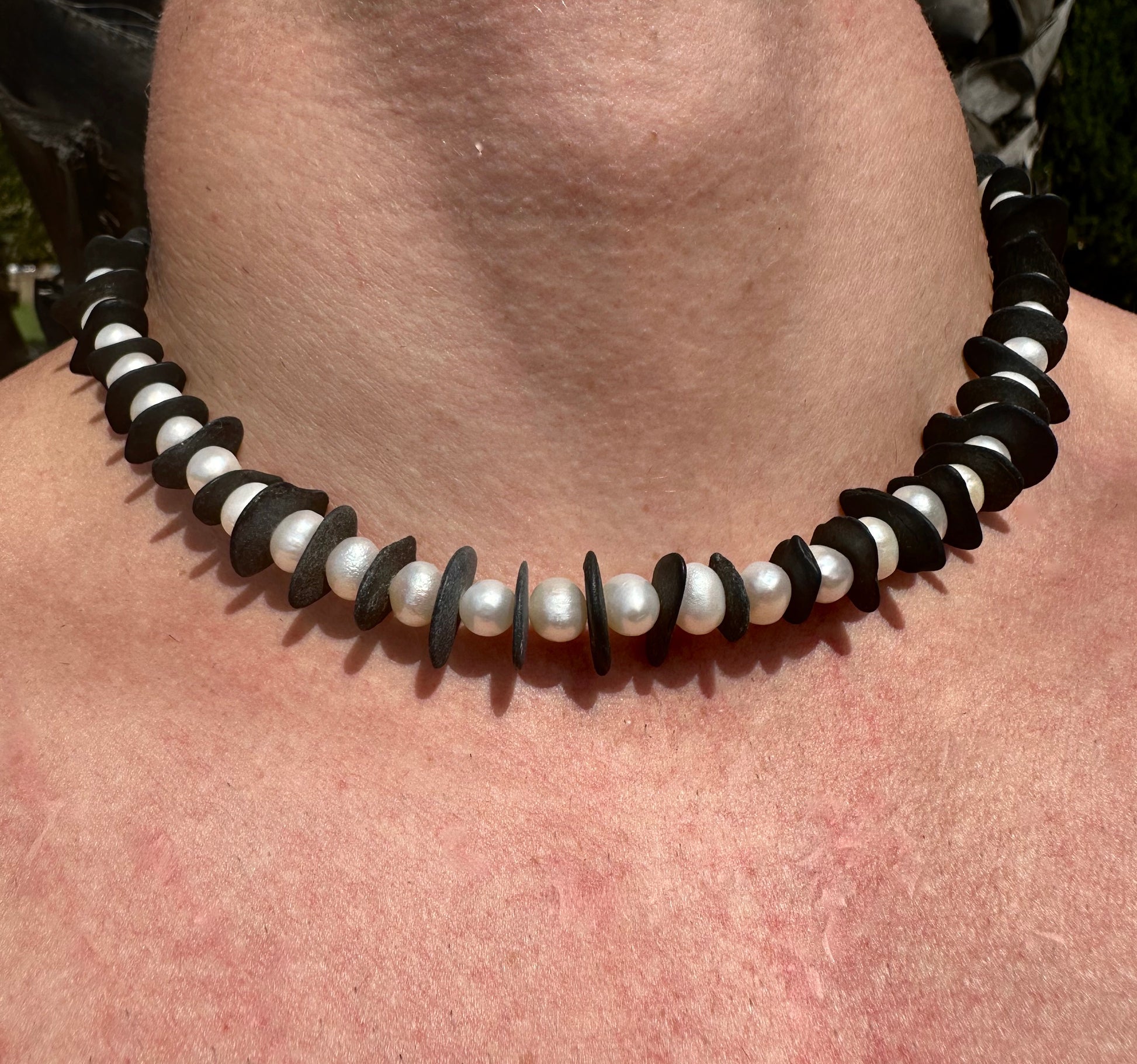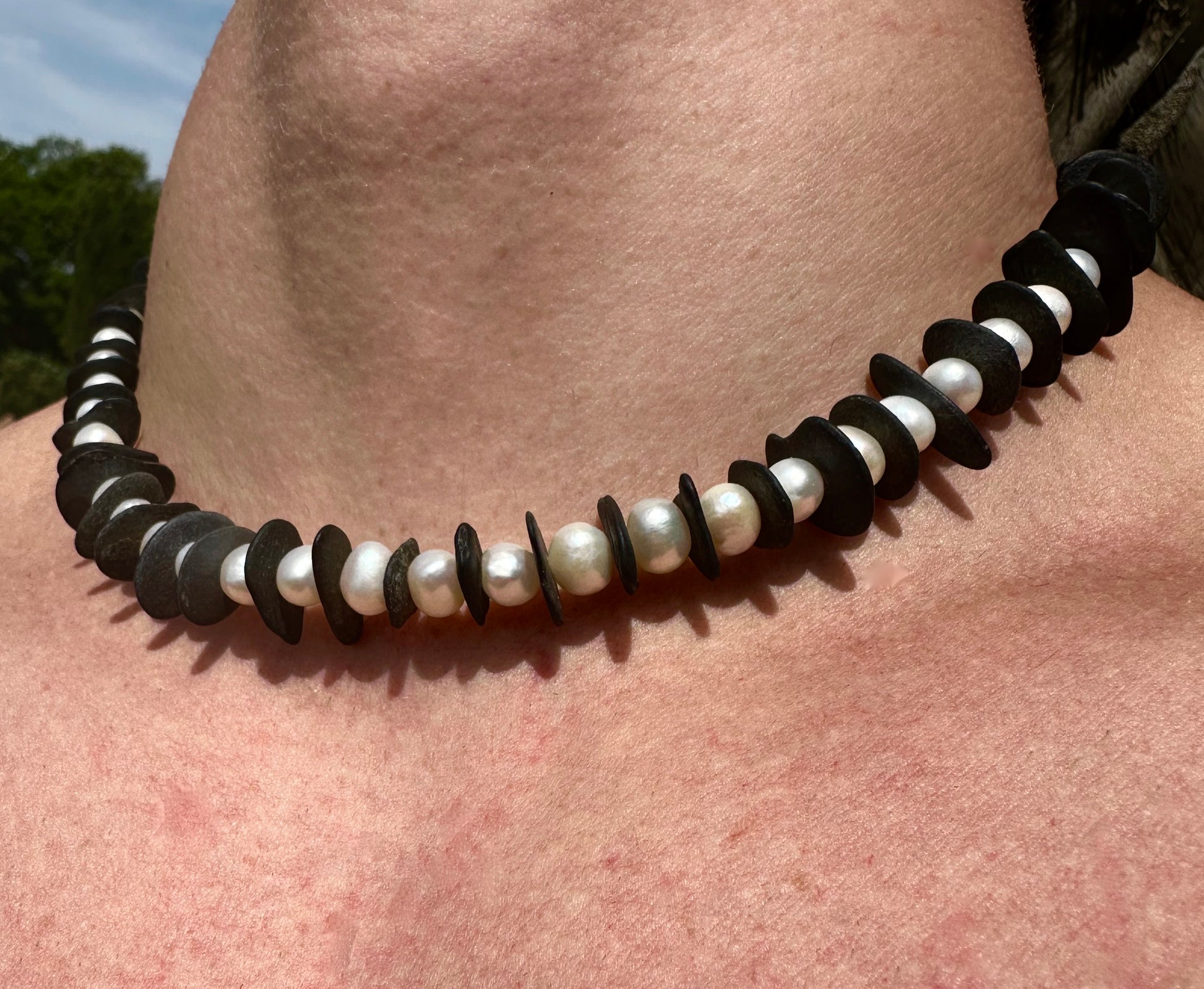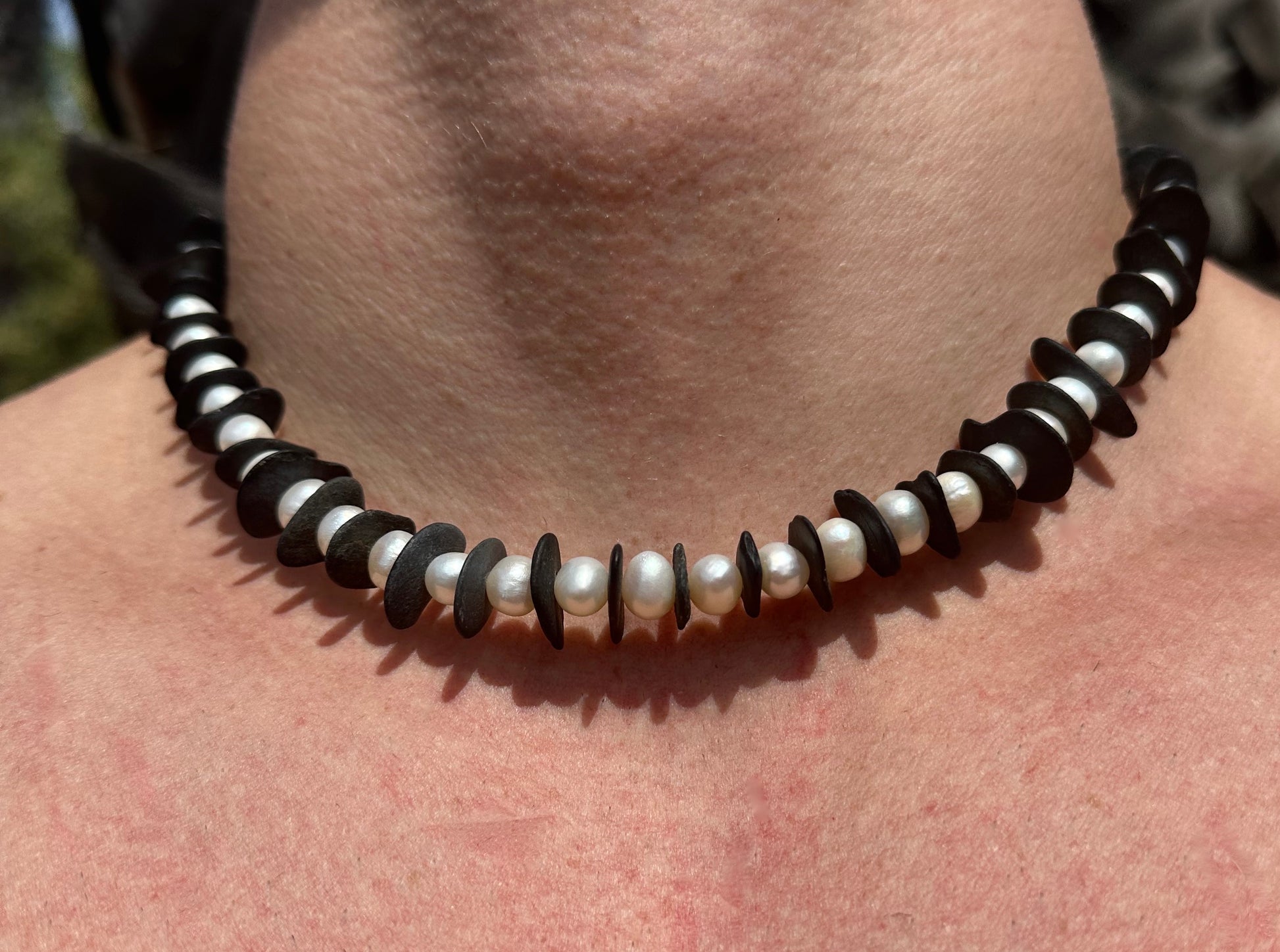 NOAH BIG· collar que combina pequeñas piedras de pizarra modeladas por el mar con perlas blancas de agua dulce.