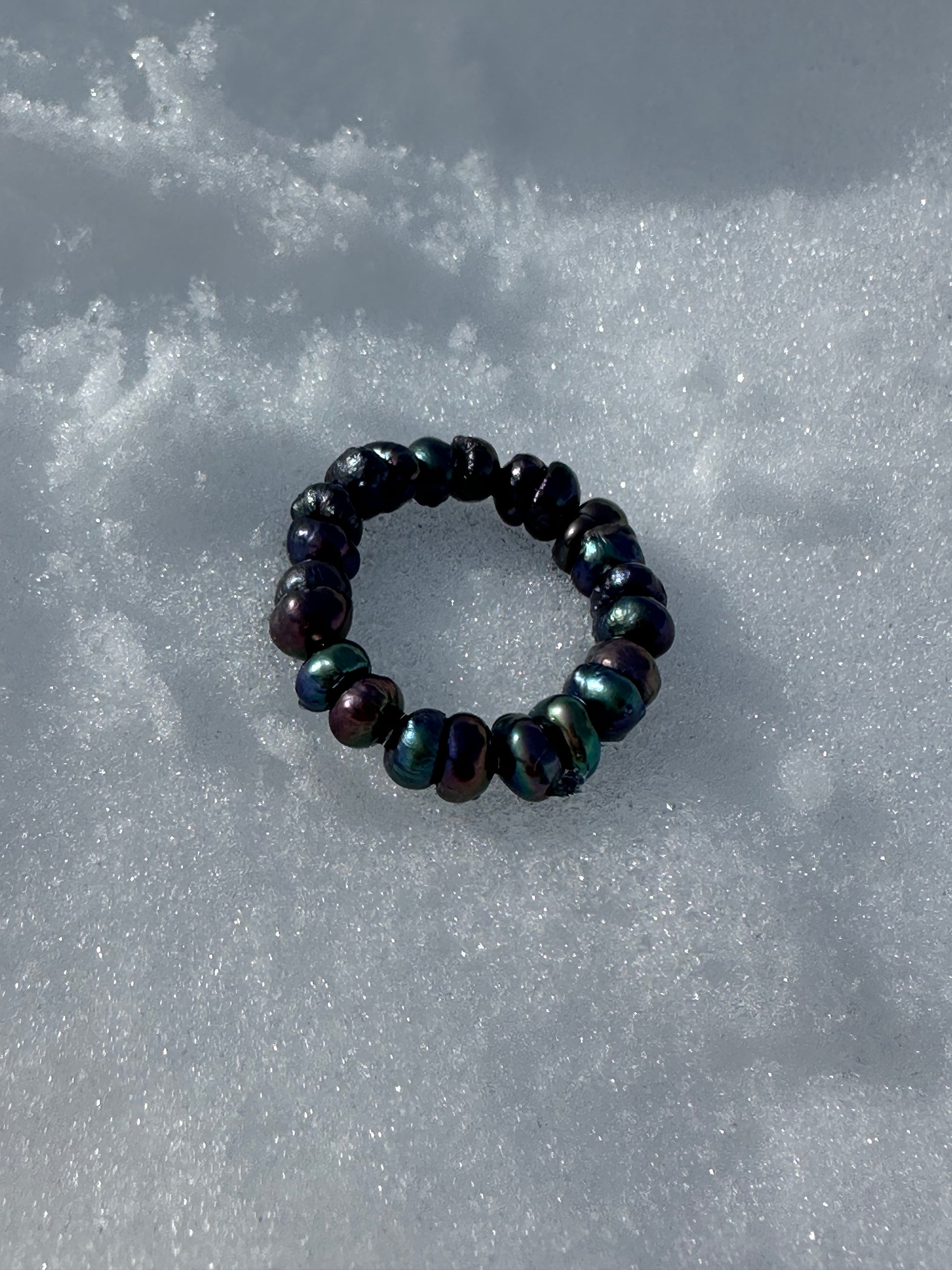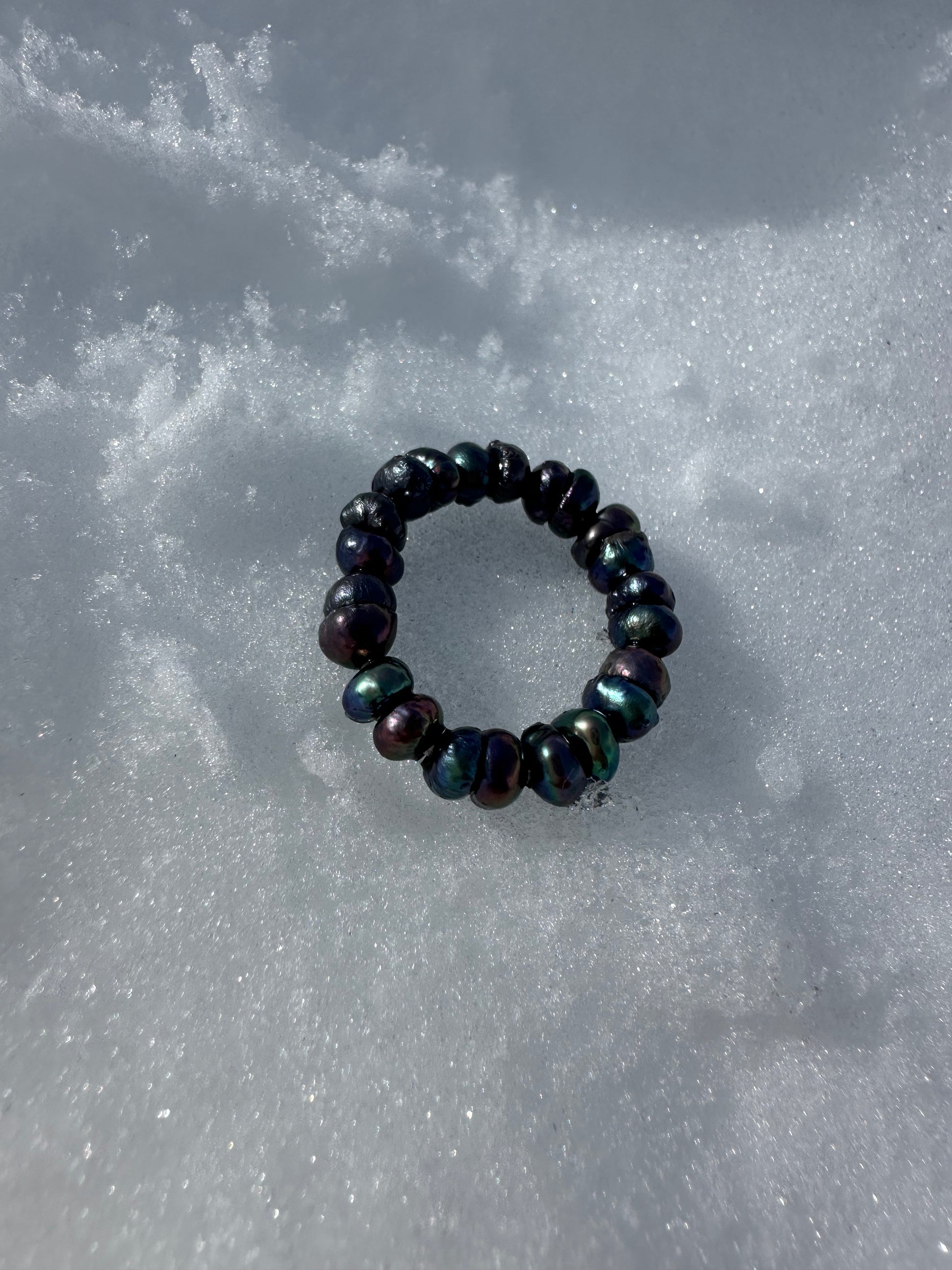 NOIR · anillo elástico con pequeñas perlas oscuras de agua dulce que, según la incidencia de la luz, revelan profundos matices verdes, azul oscuro y violetas.