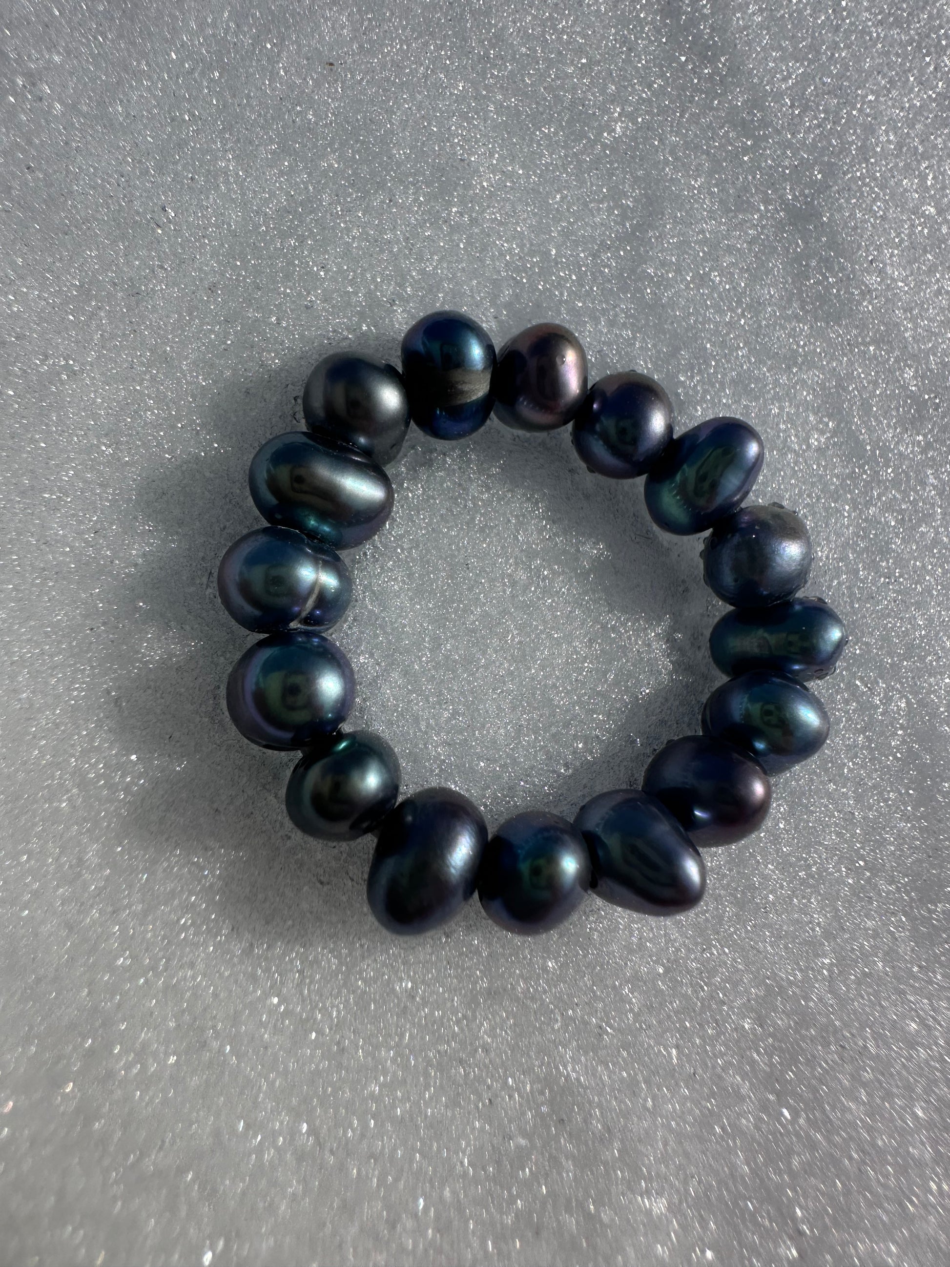 ORYN · anillo elástico con pequeñas perlas redondas de agua dulce que, según la incidencia de la luz, brillan en matices azulados, verdes y grises.