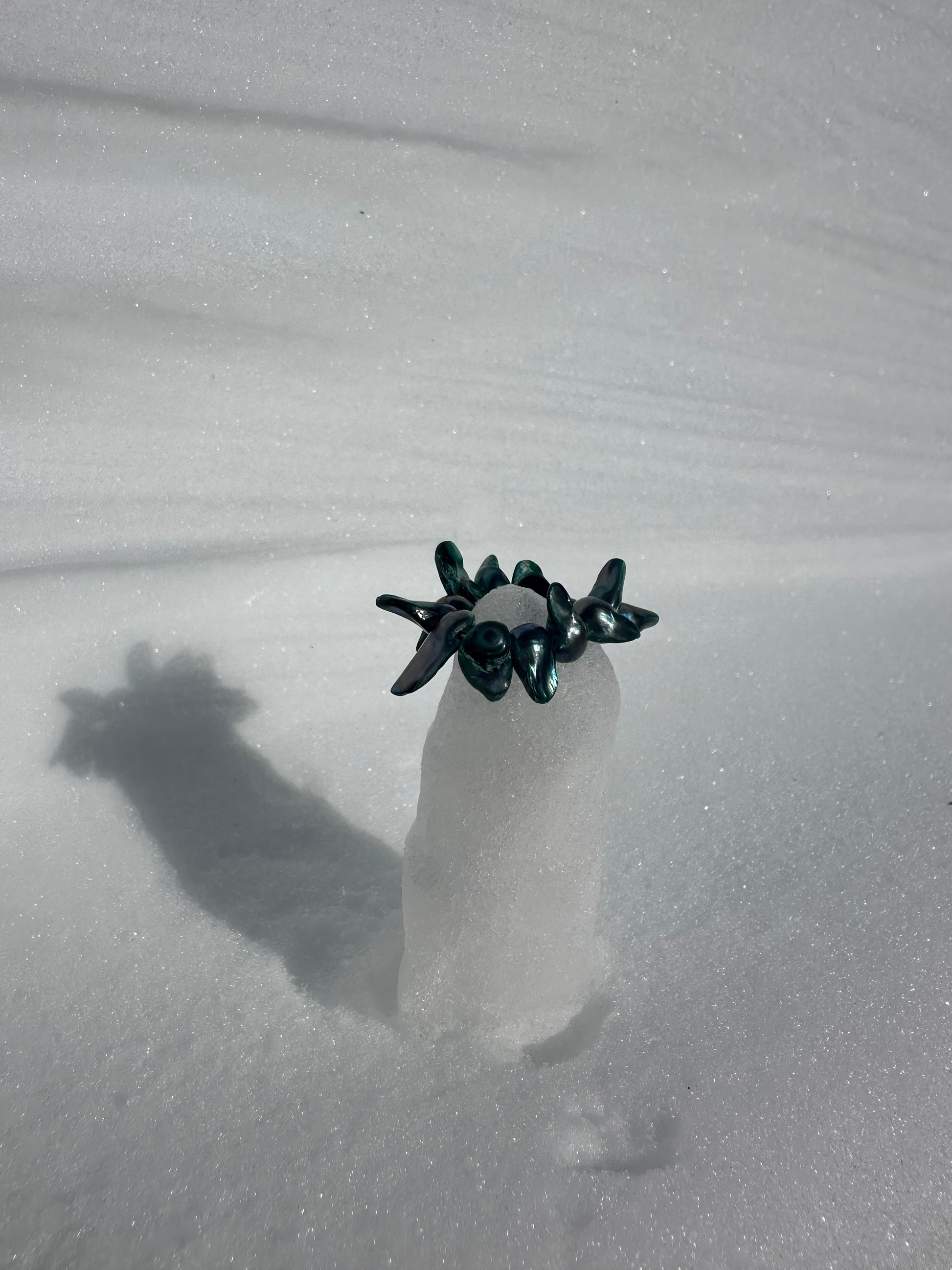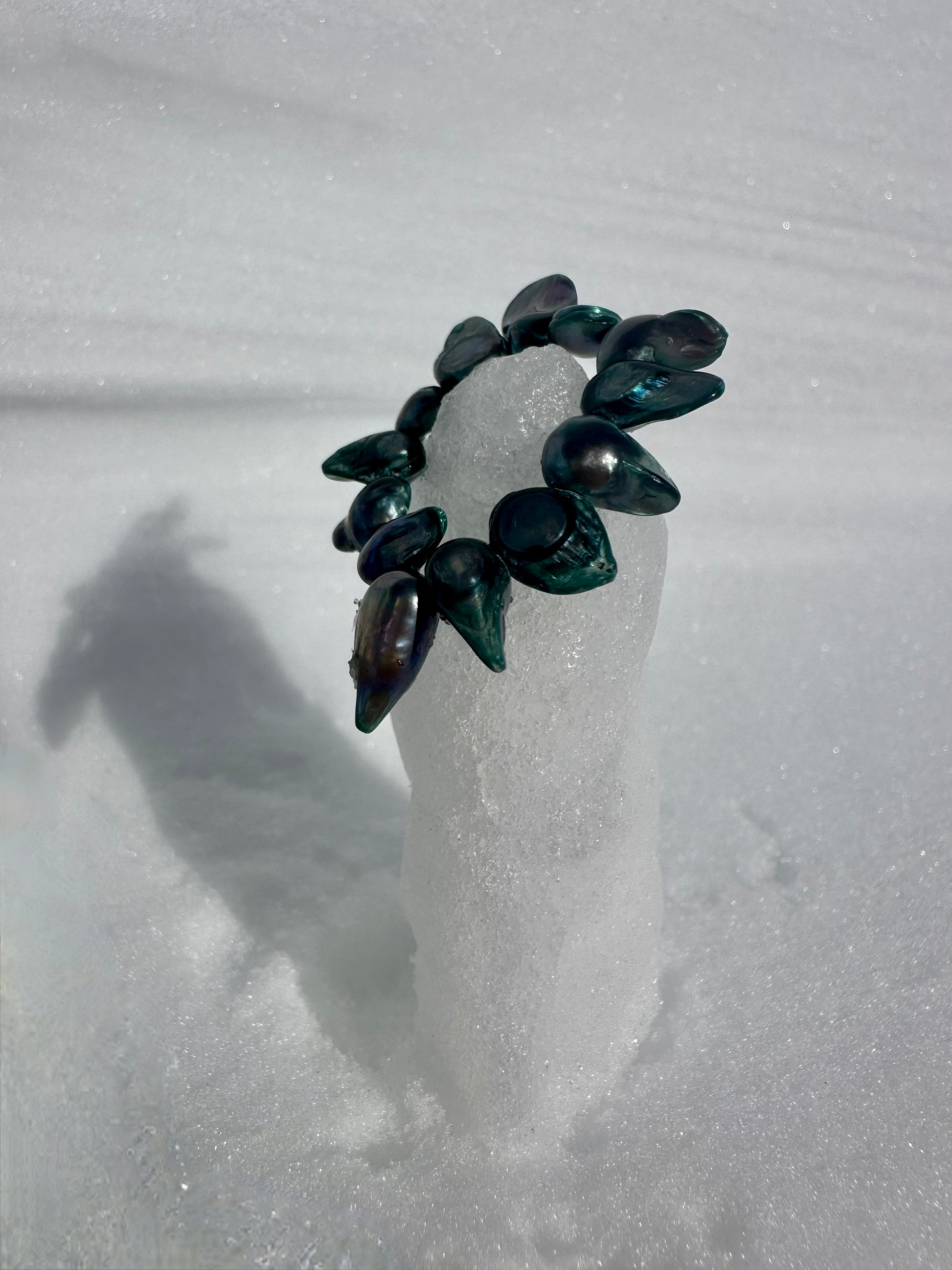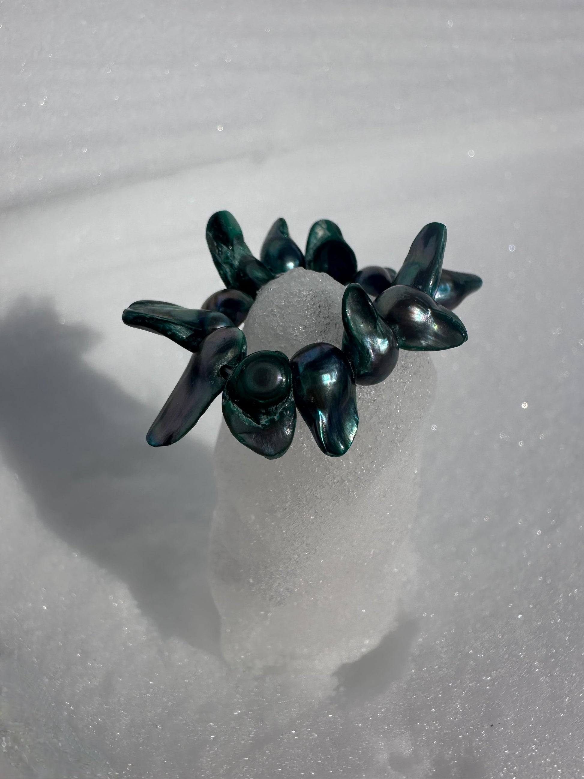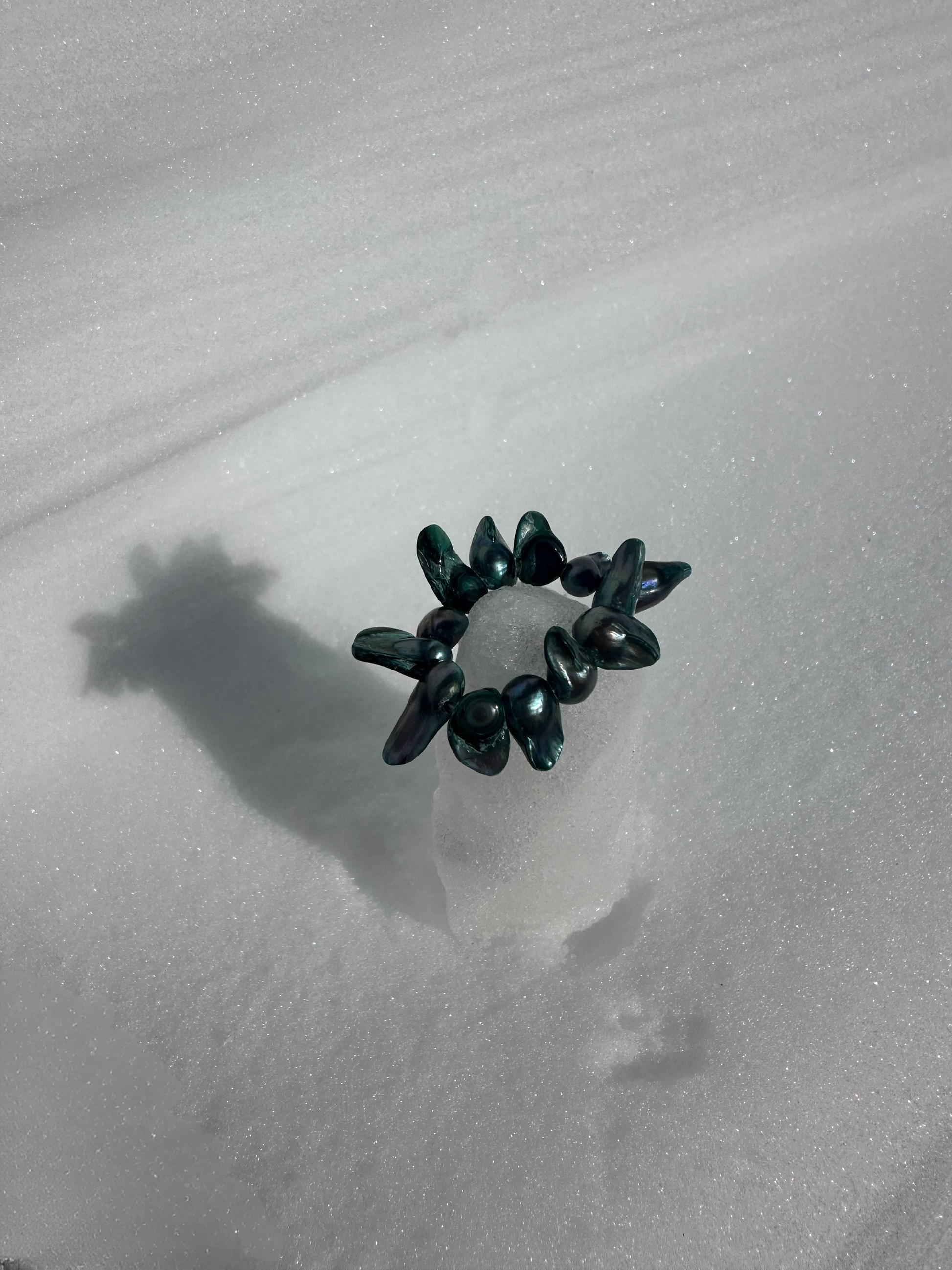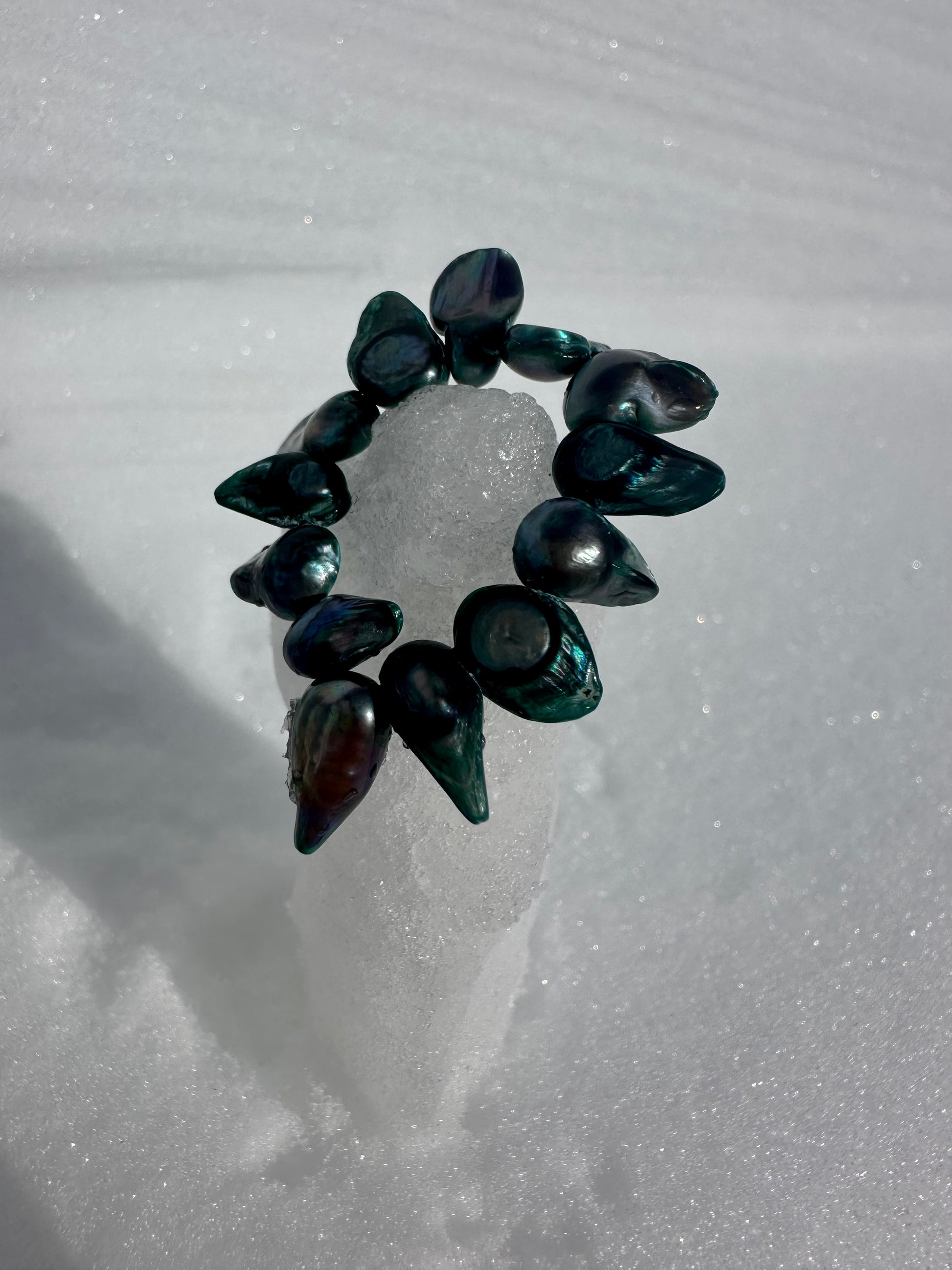 PEDRO · anillo elástico compuesto por perlas Keshi alargadas en profundos tonos petróleo.