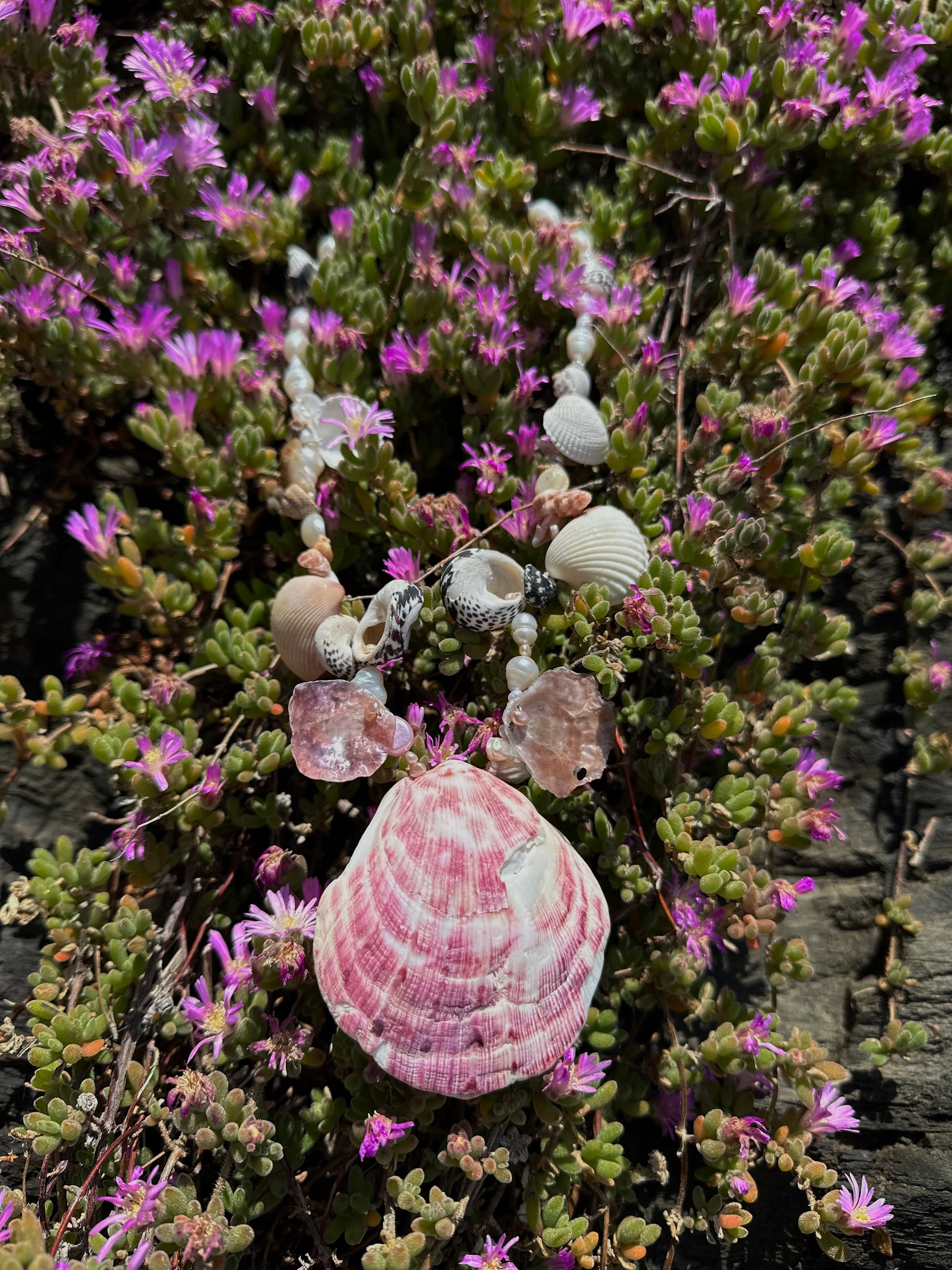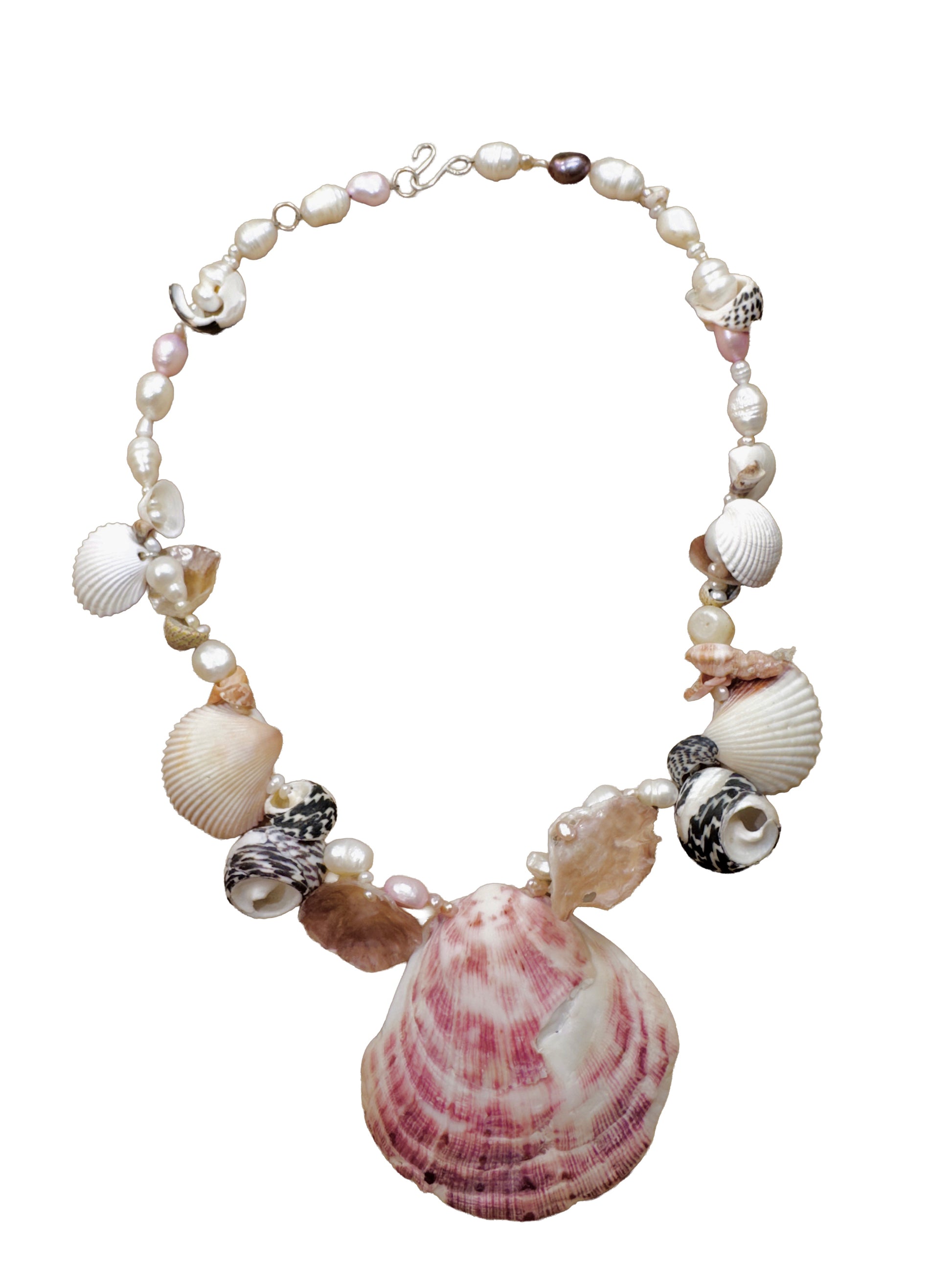 PINKY · collar con una concha rosa grande como protagonista en el centro, acompañada de varias conchas y caracolas marinas diferentes, combinadas delicadamente con pequeñas perlas de agua dulce.