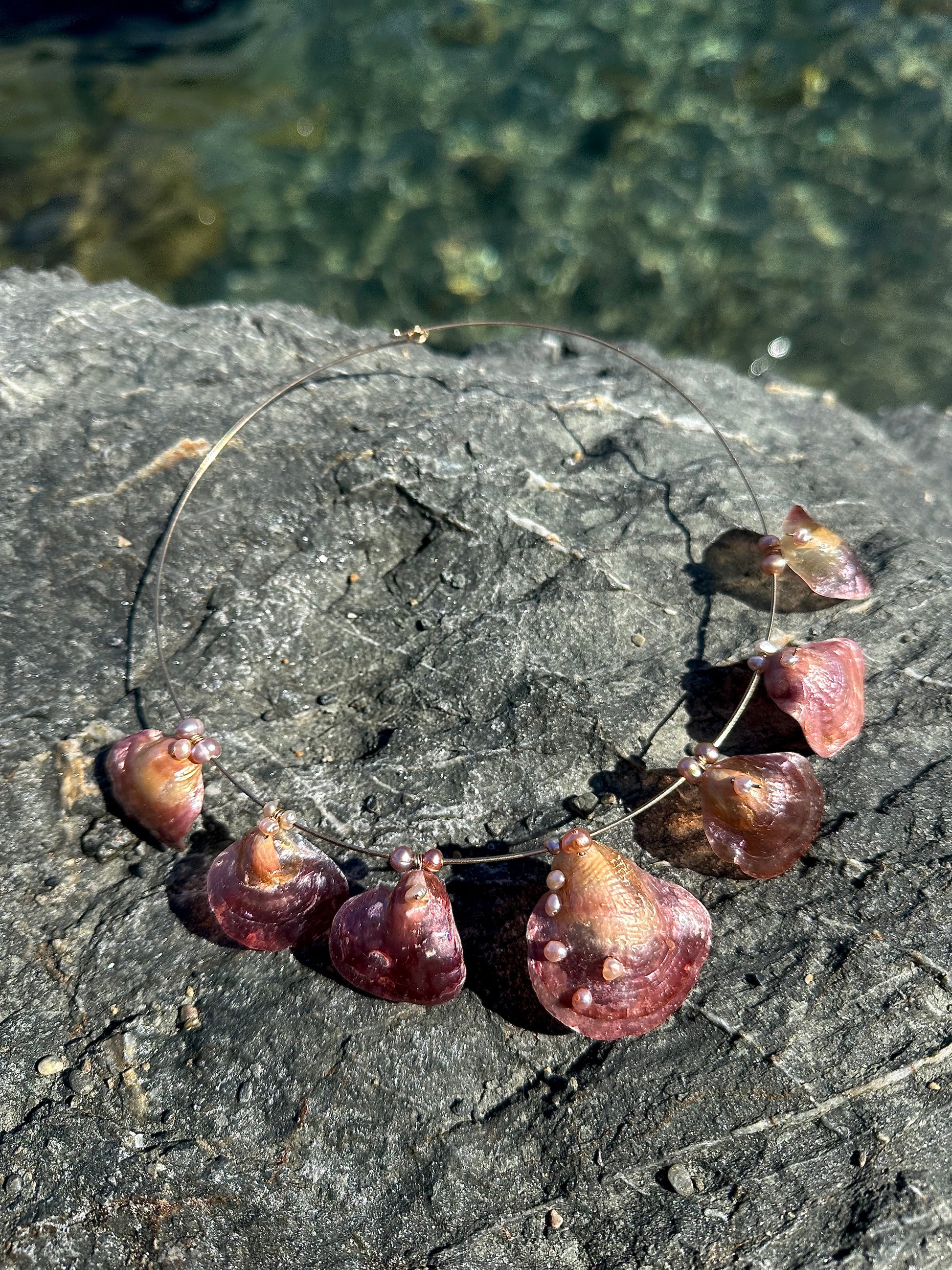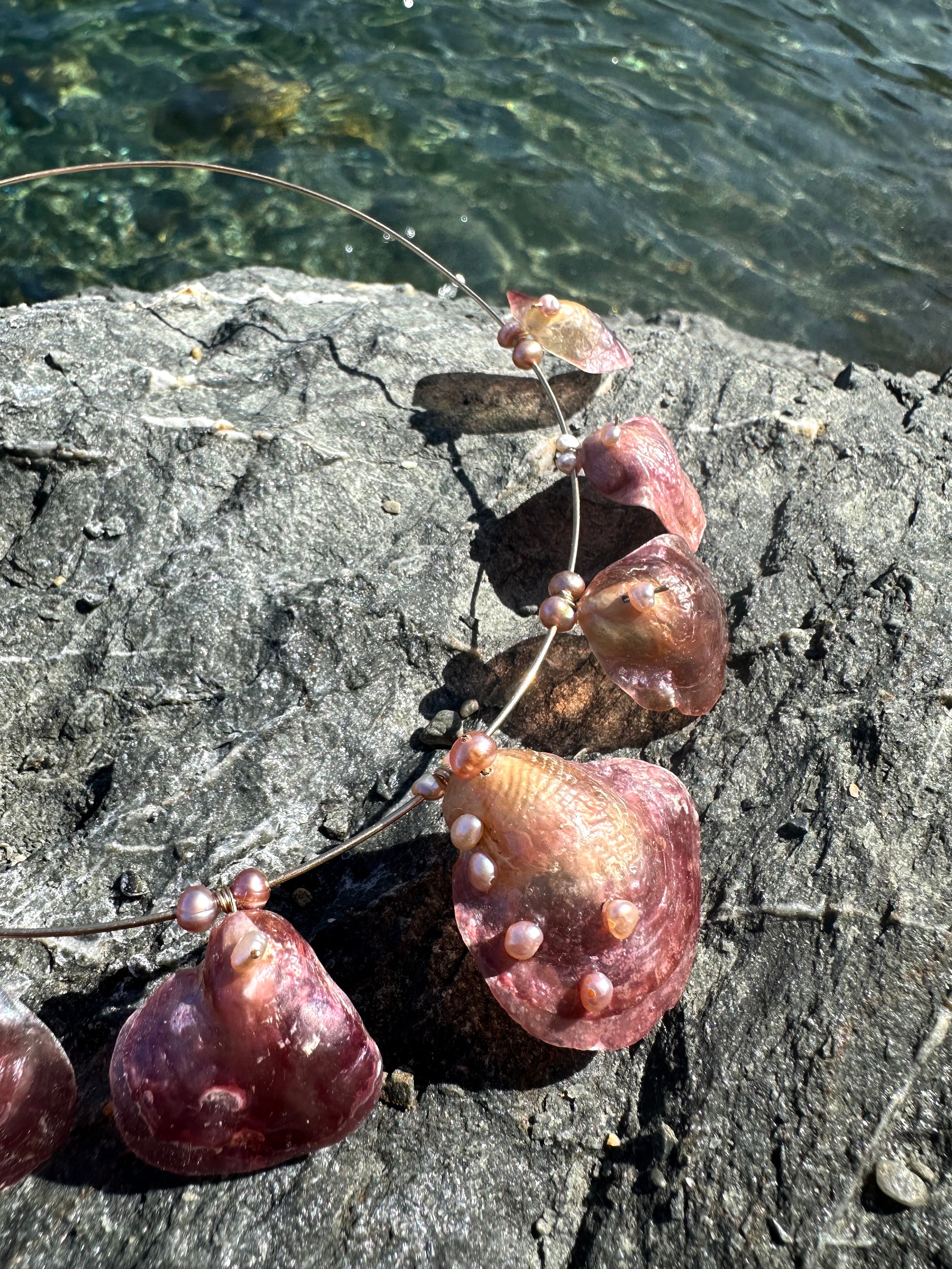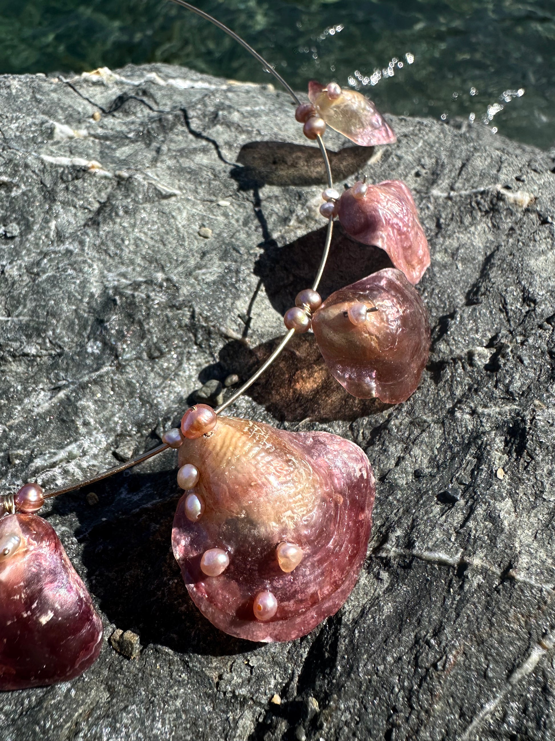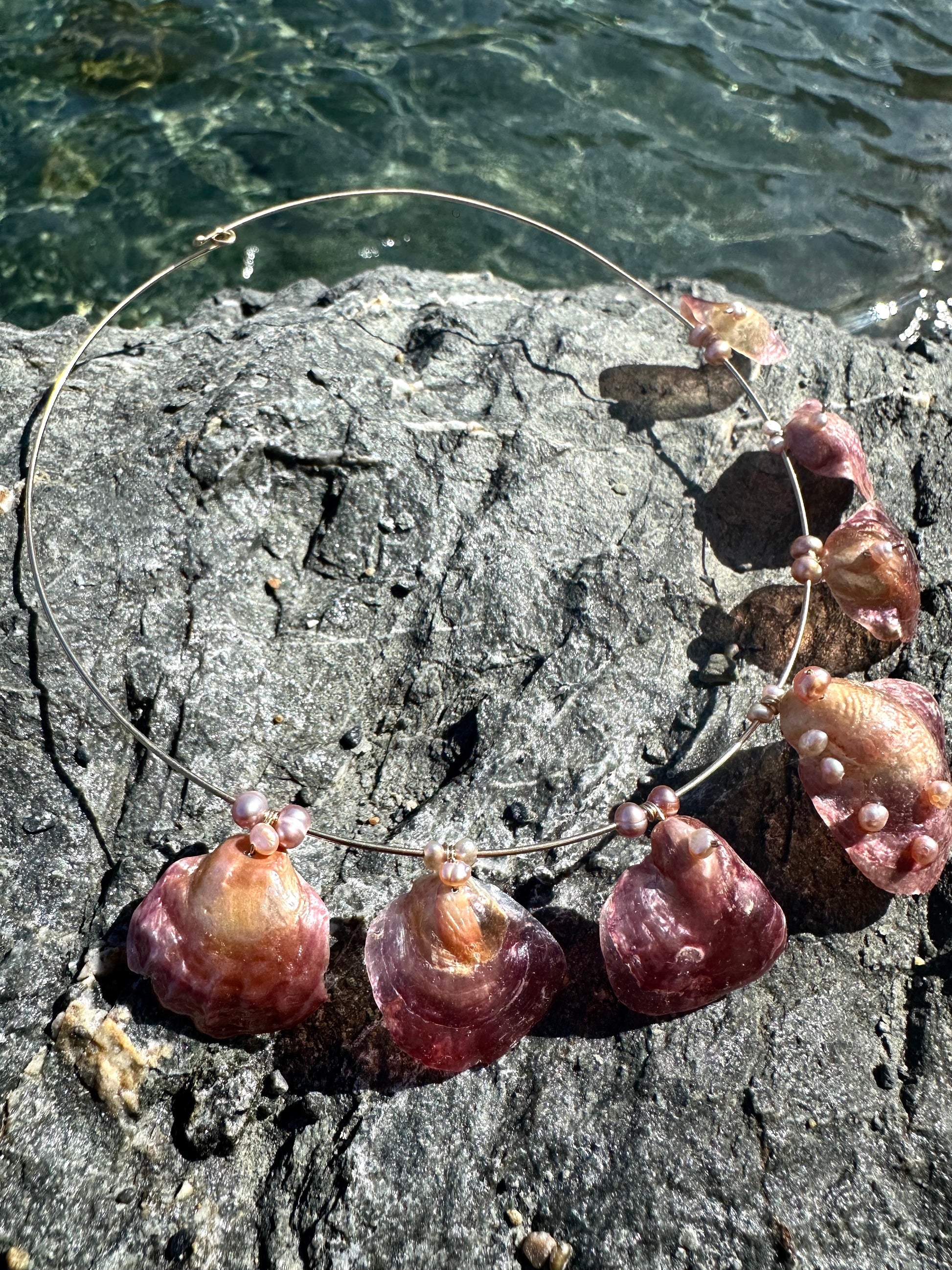 QUEEN · este delicado collier está compuesto por un gran aro de alambre gold filled de 14K, adornado con hermosas conchas en tonos rosé-dorado con brillo nacarado. Las conchas están acompañadas por perlas de agua dulce rosadas cuidadosamente dispuestas, que realzan la armonía y la elegancia natural de la pieza.