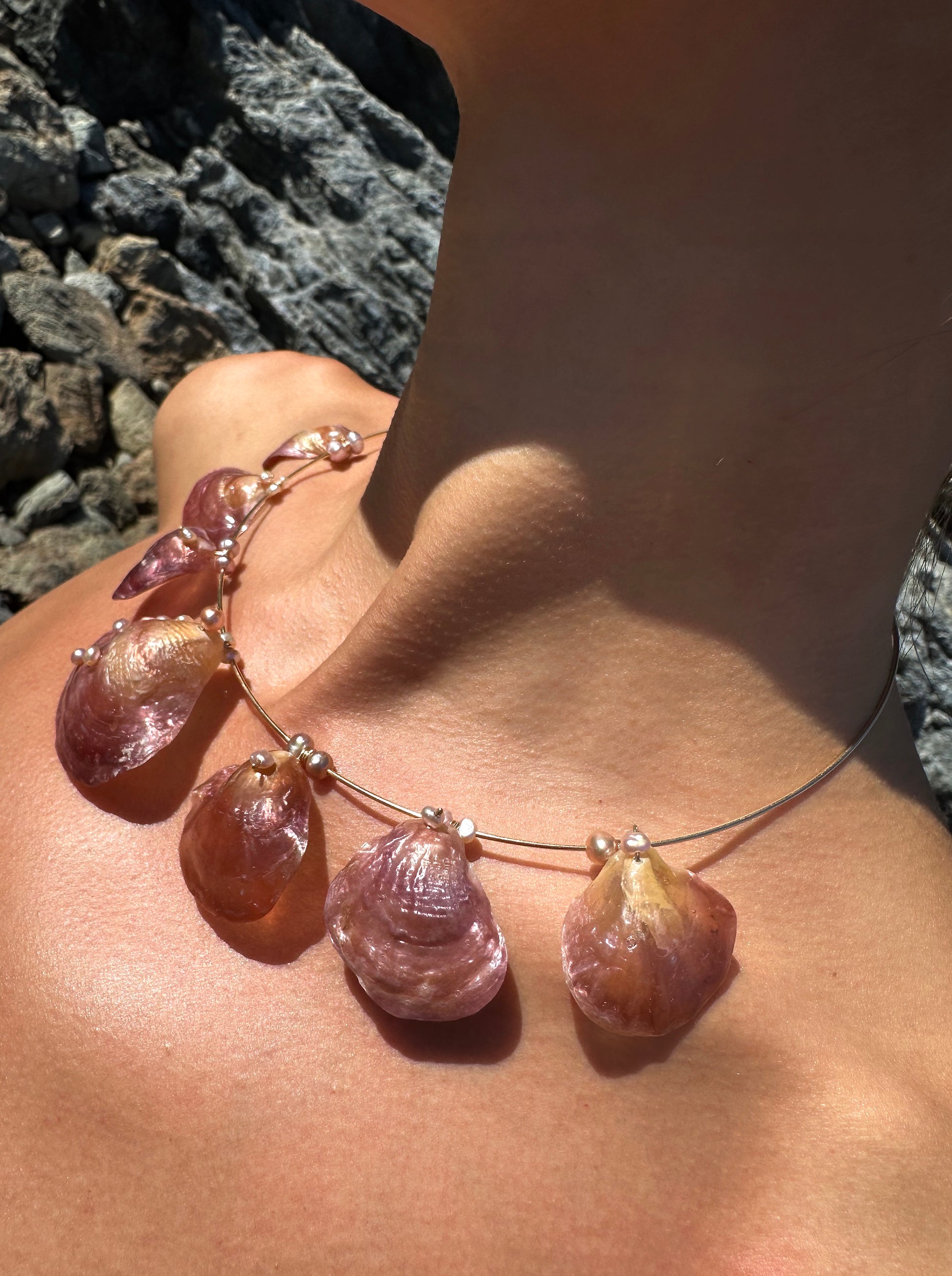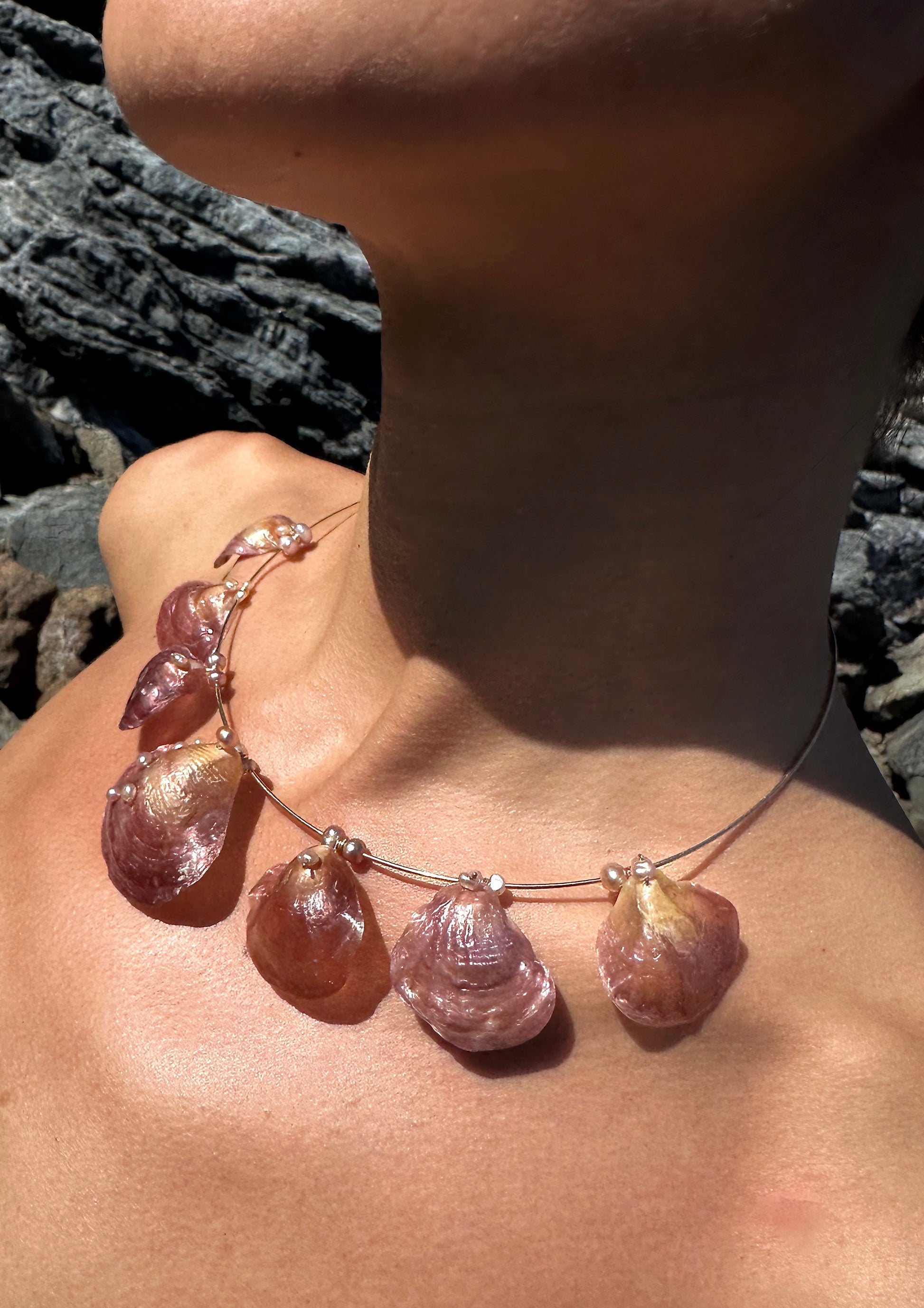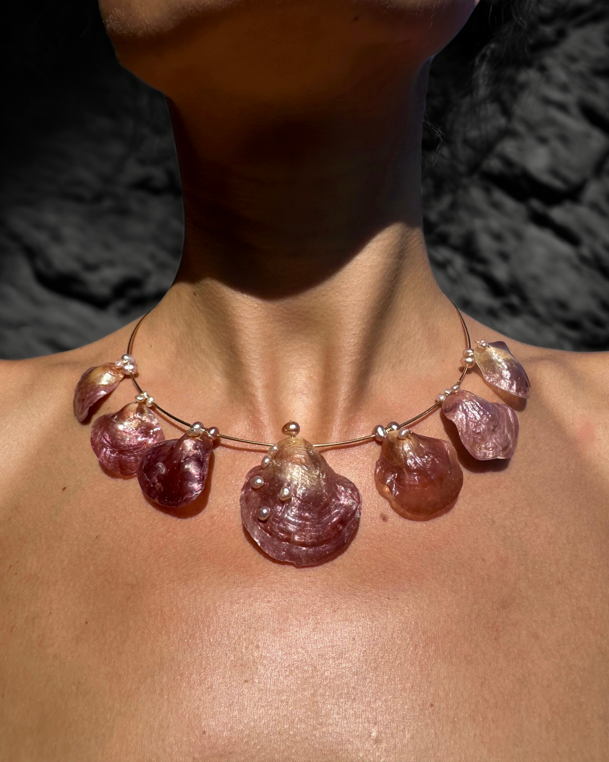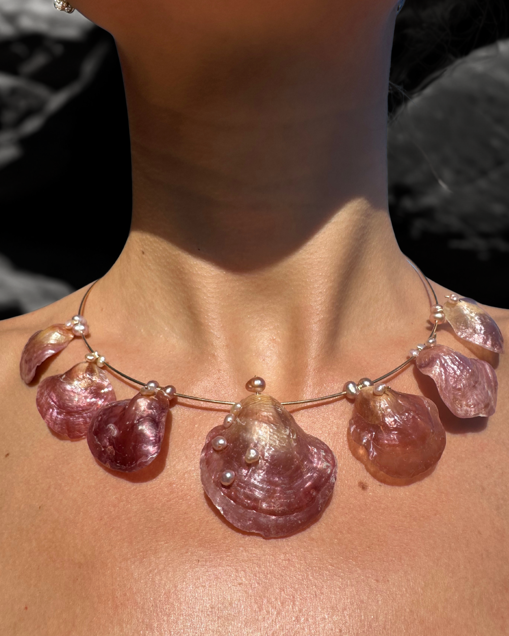 QUEEN · este delicado collier está compuesto por un gran aro de alambre gold filled de 14K, adornado con hermosas conchas en tonos rosé-dorado con brillo nacarado. Las conchas están acompañadas por perlas de agua dulce rosadas cuidadosamente dispuestas, que realzan la armonía y la elegancia natural de la pieza.