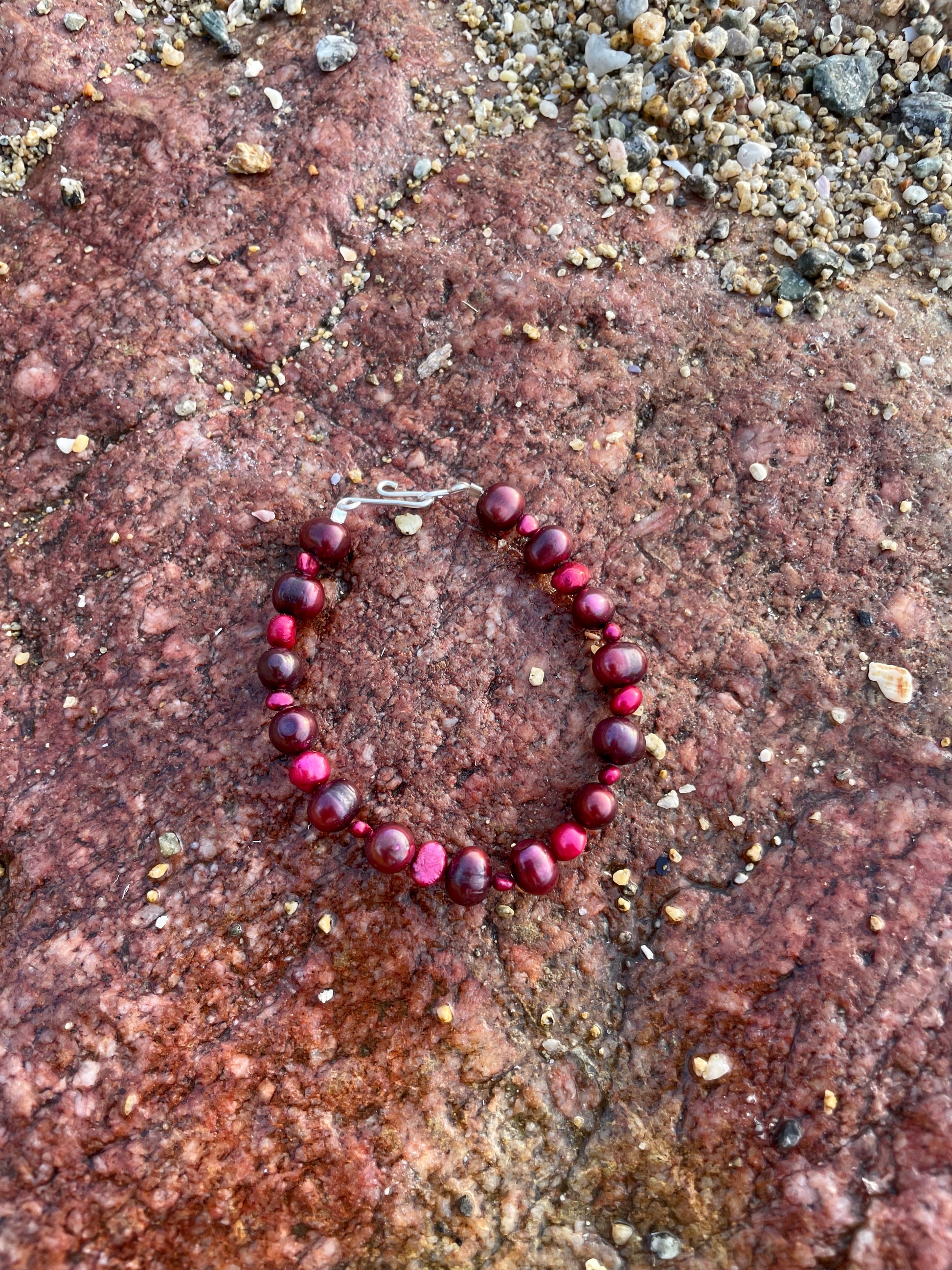 RAQUEL · esta pulsera está elaborada con perlas de agua dulce en una variedad de tonos rojos y tamaños variados, creando un diseño dinámico y lleno de vida. Una pieza vibrante y elegante que aporta color y carácter a cualquier conjunto.