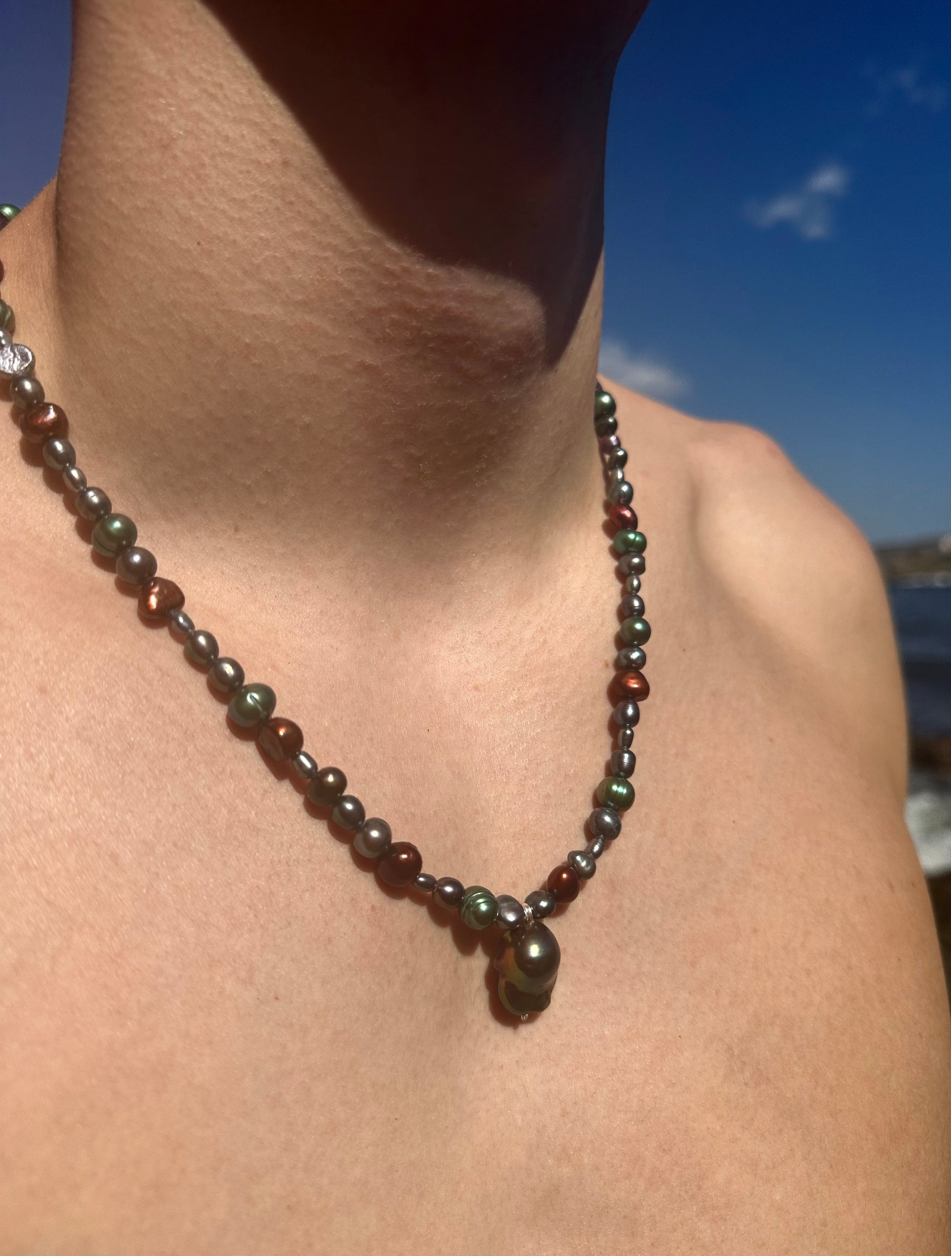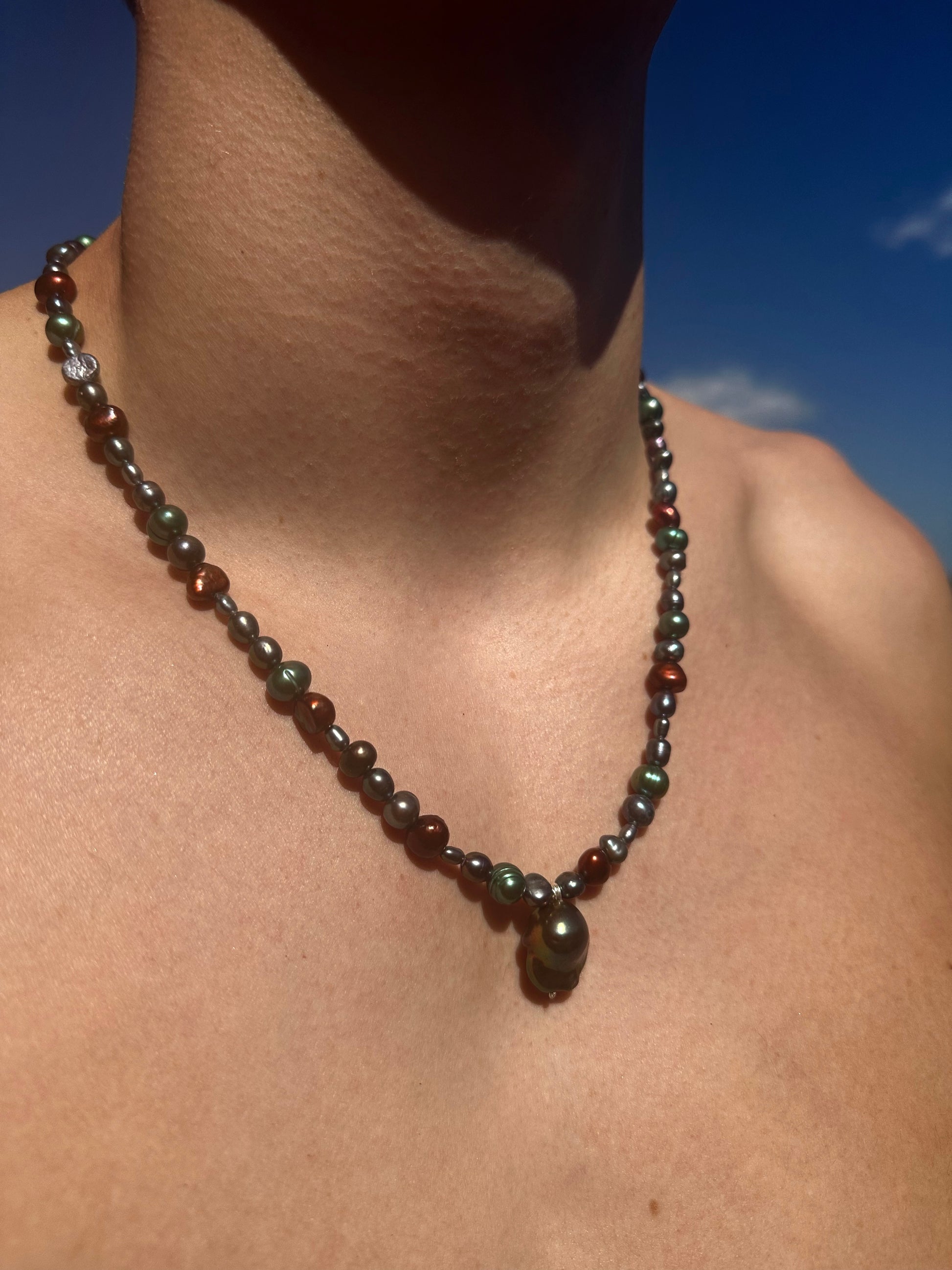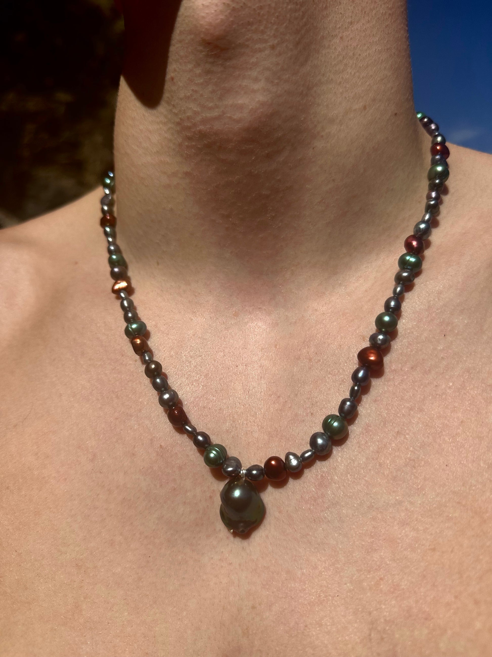 ROLAND · collar con una perla barroca oscura en el centro, que según la luz refleja tonos verdes o rojizos. Está rodeada de perlas de agua dulce en matices verdes, plateados y rojizos, creando una armonía de colores sutil y sofisticada.