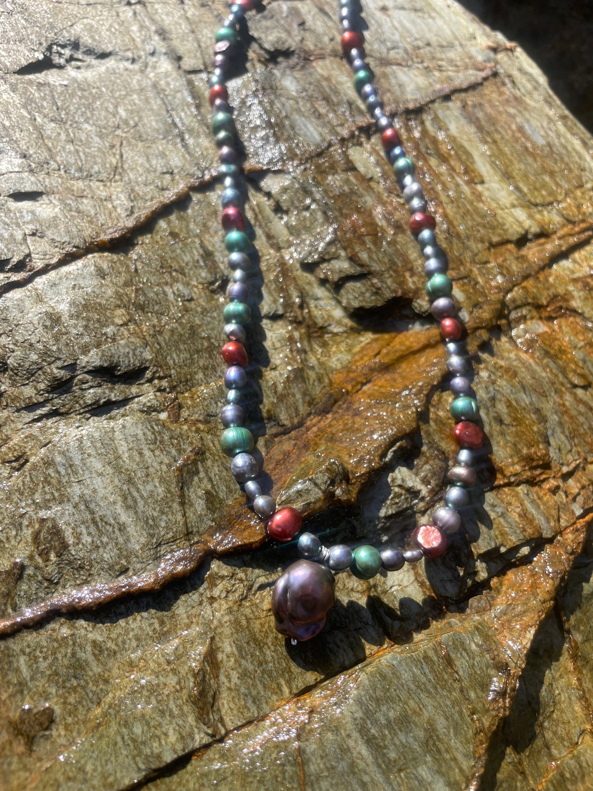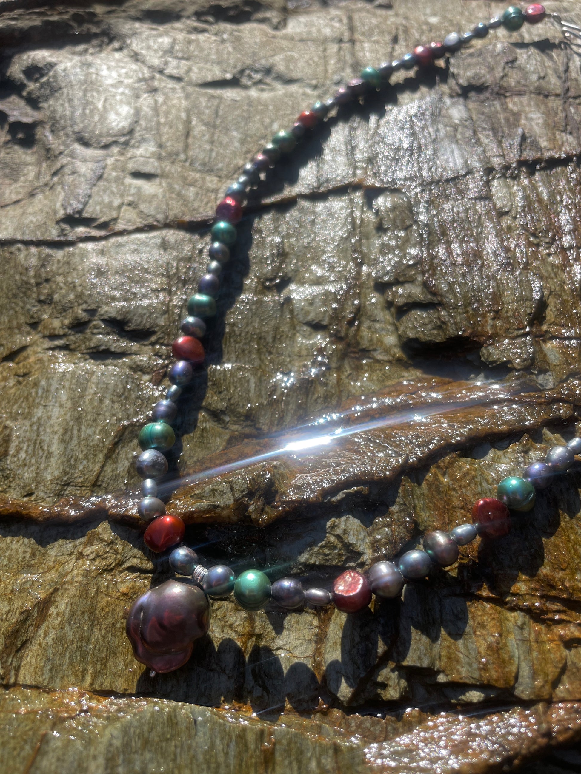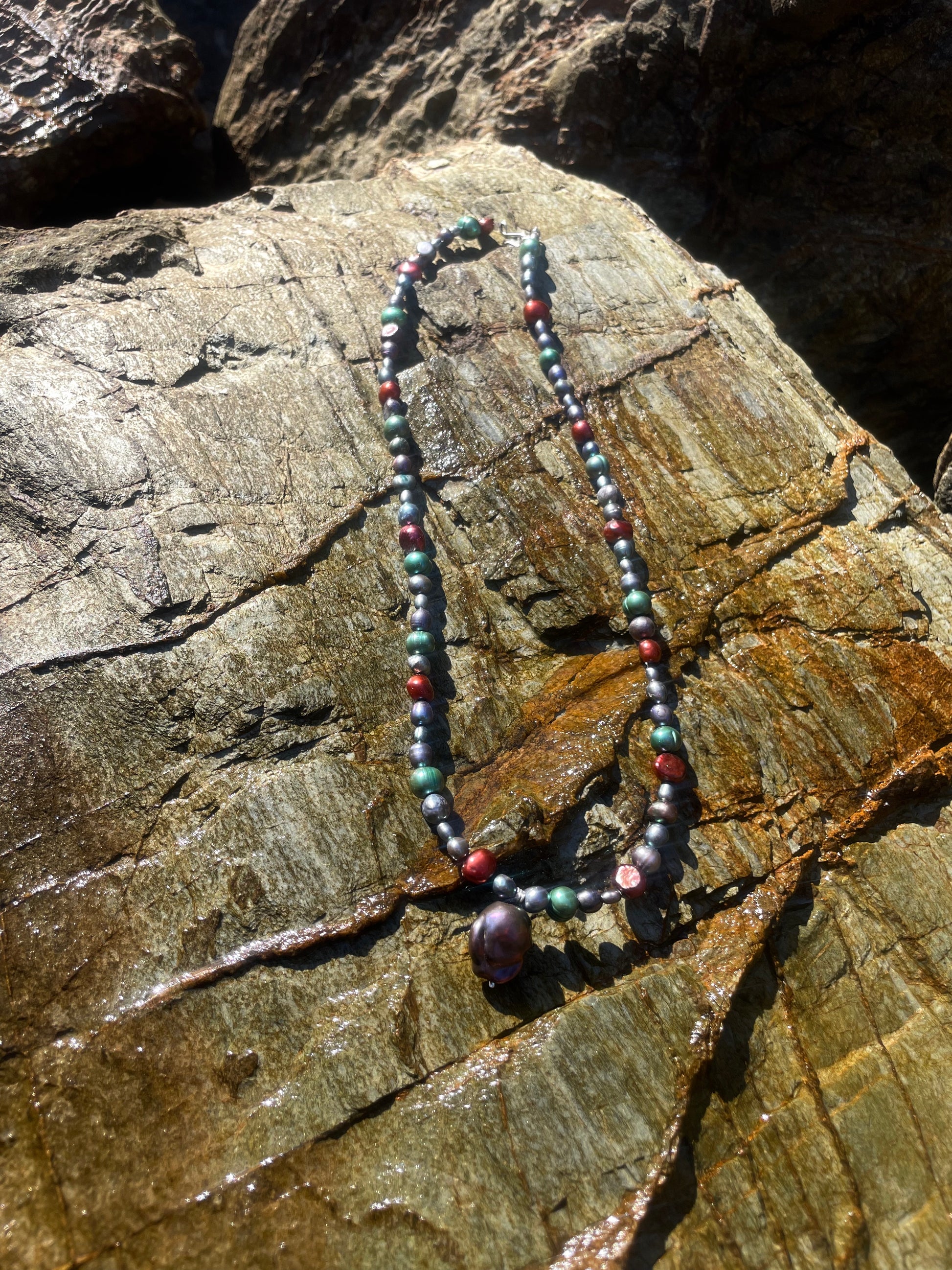 ROLAND · collar con una perla barroca oscura en el centro, que según la luz refleja tonos verdes o rojizos. Está rodeada de perlas de agua dulce en matices verdes, plateados y rojizos, creando una armonía de colores sutil y sofisticada.