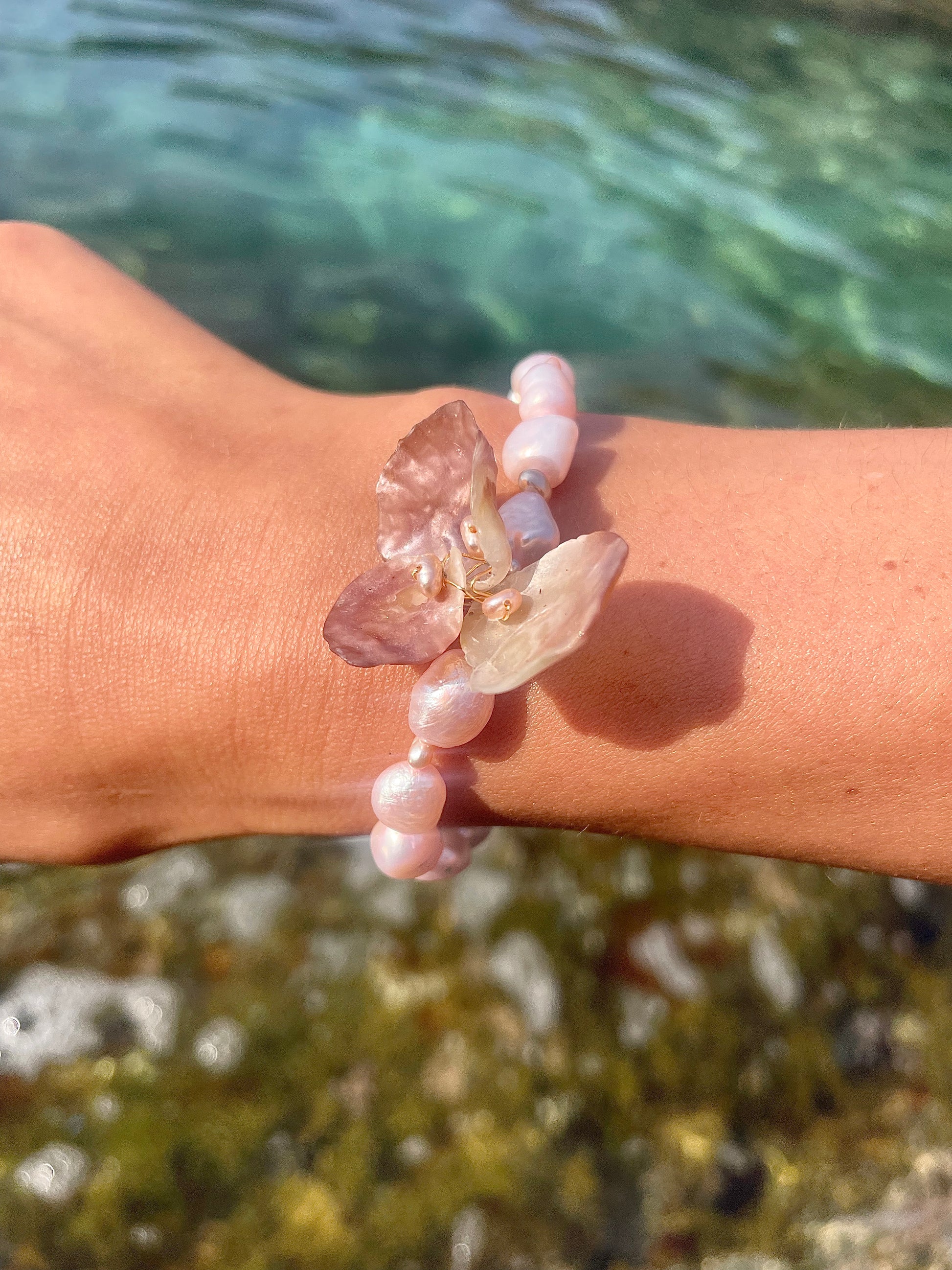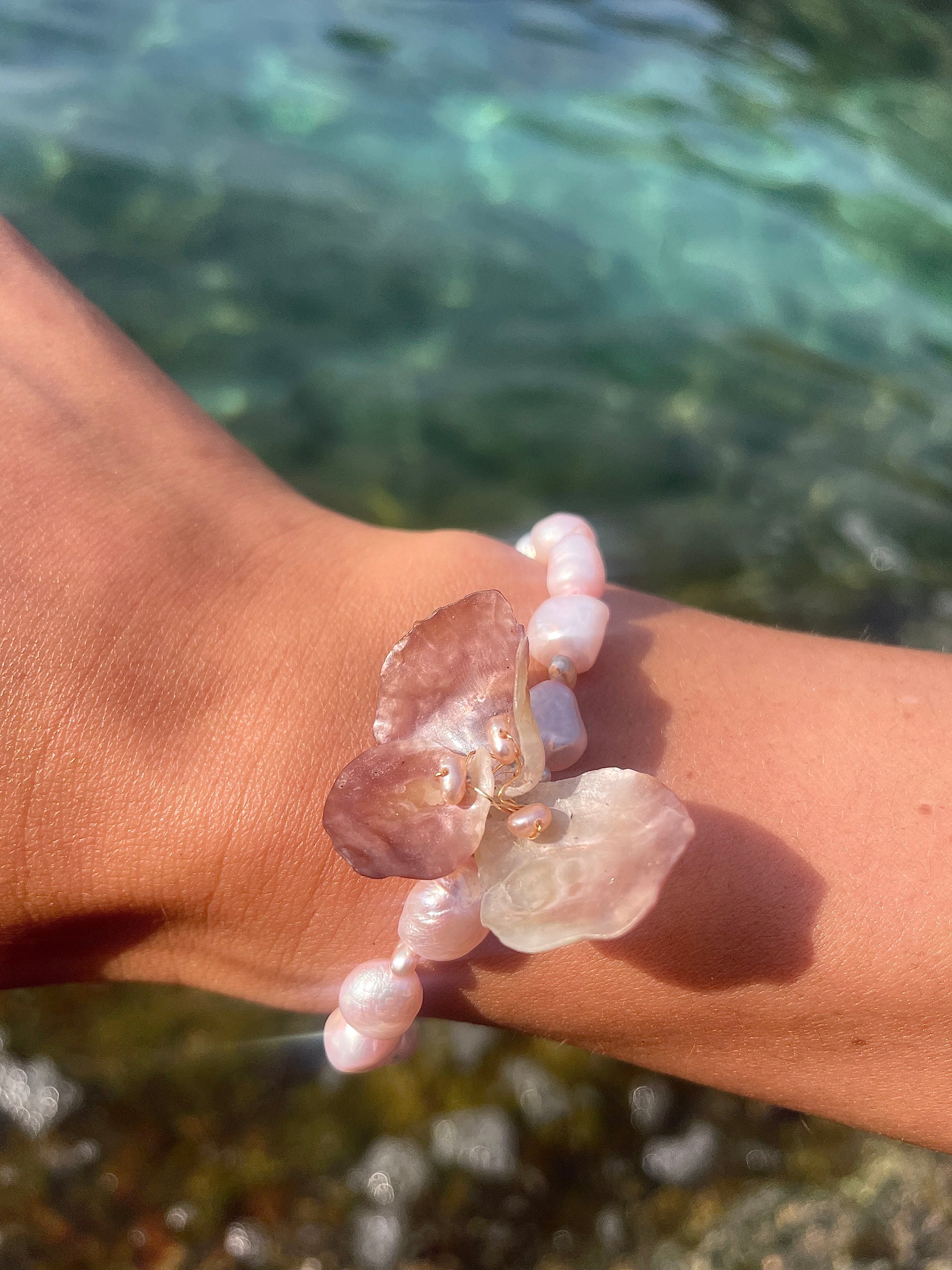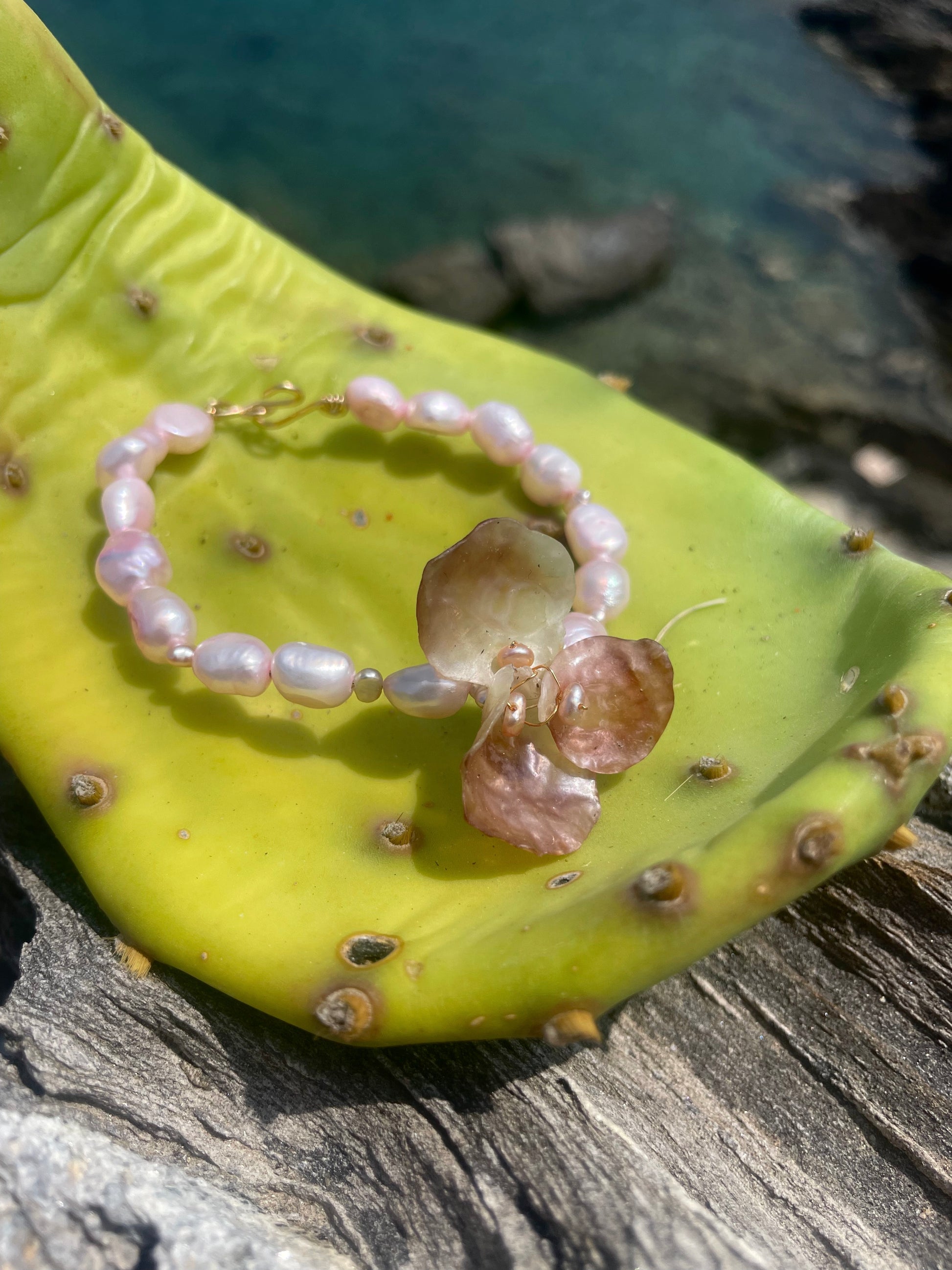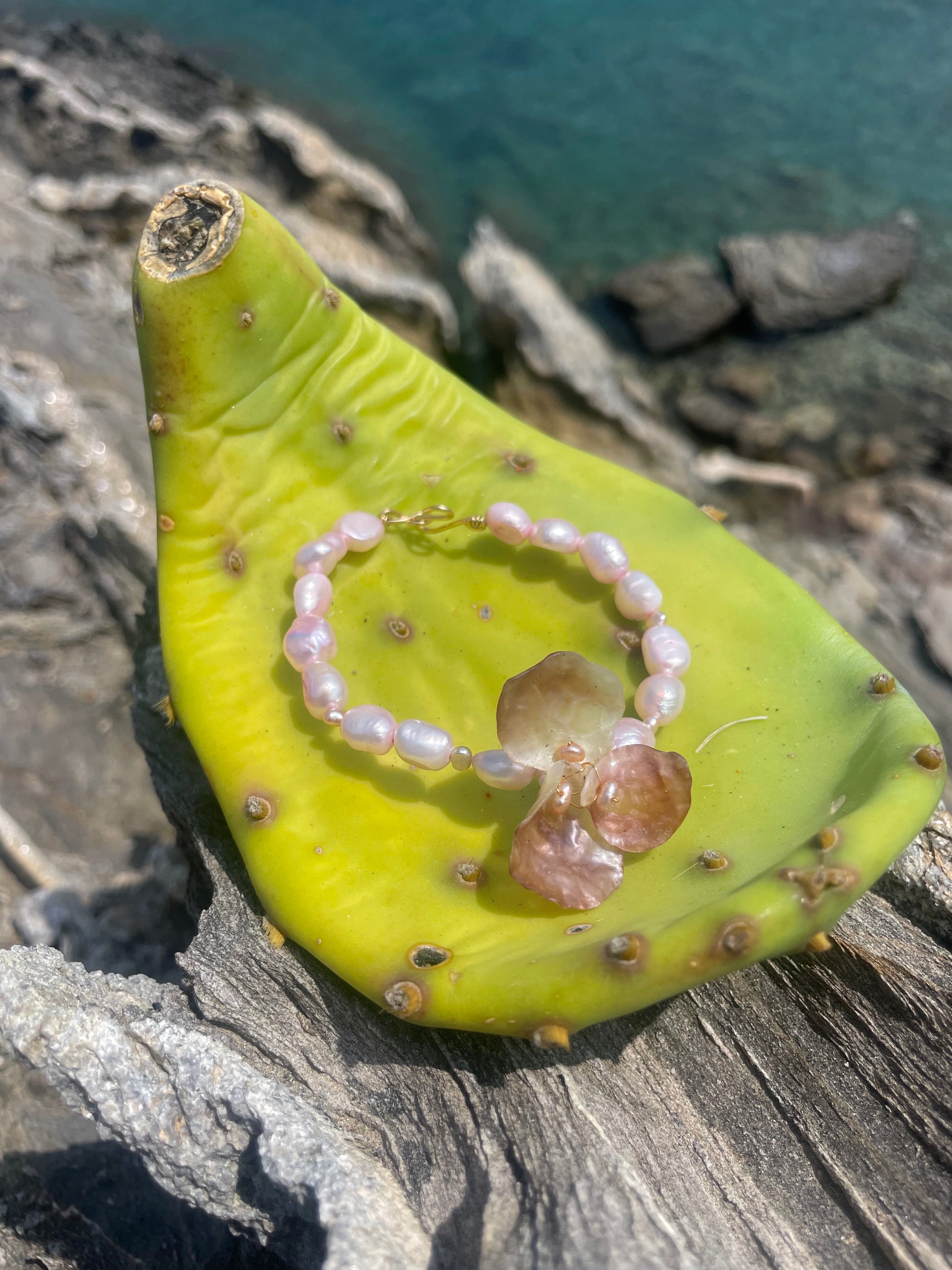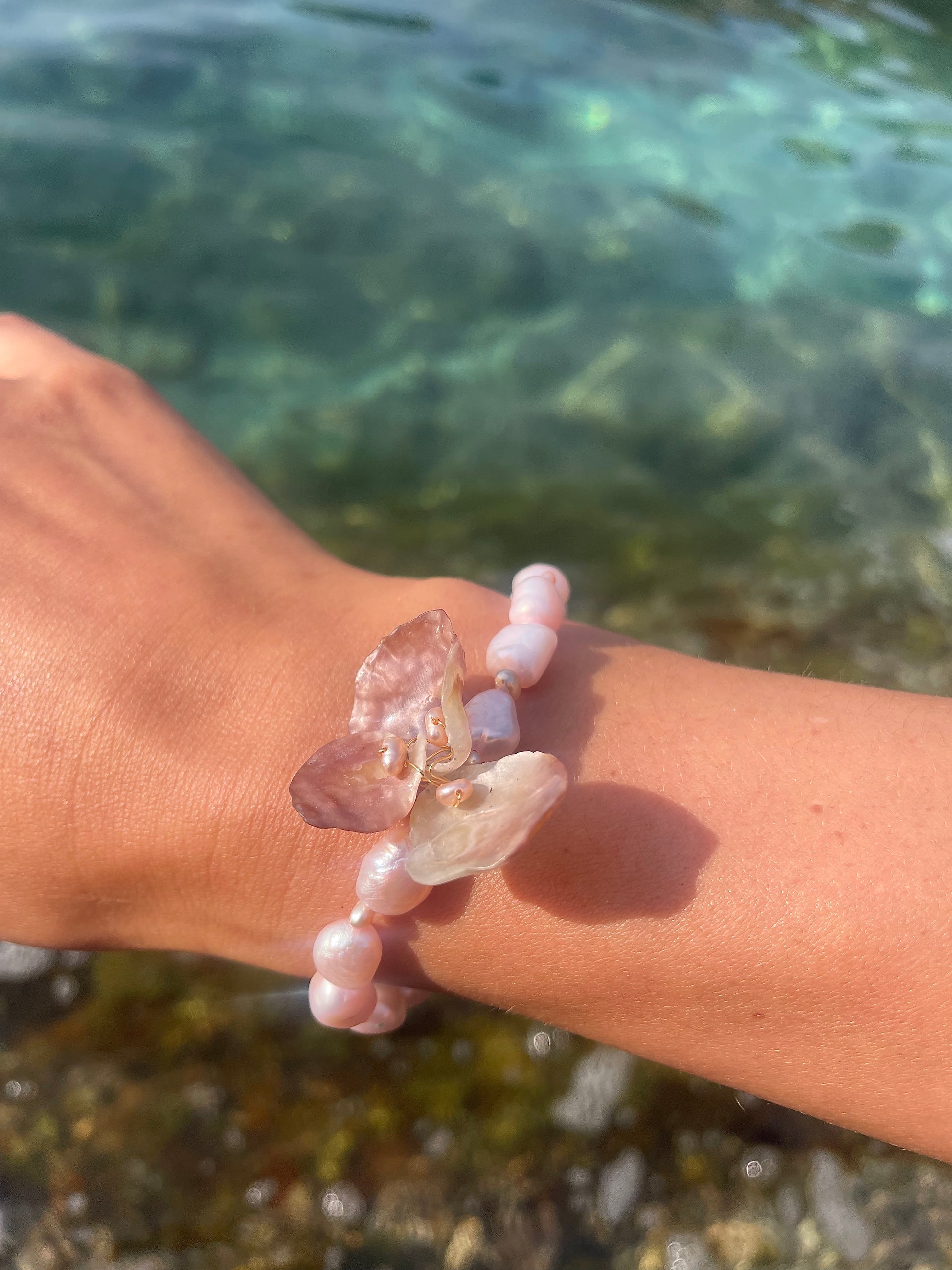 ROSE · flor elaborada con conchas en tonos rosados, rodeada por perlas rosadas de distintos tamaños y sutiles detalles dorados