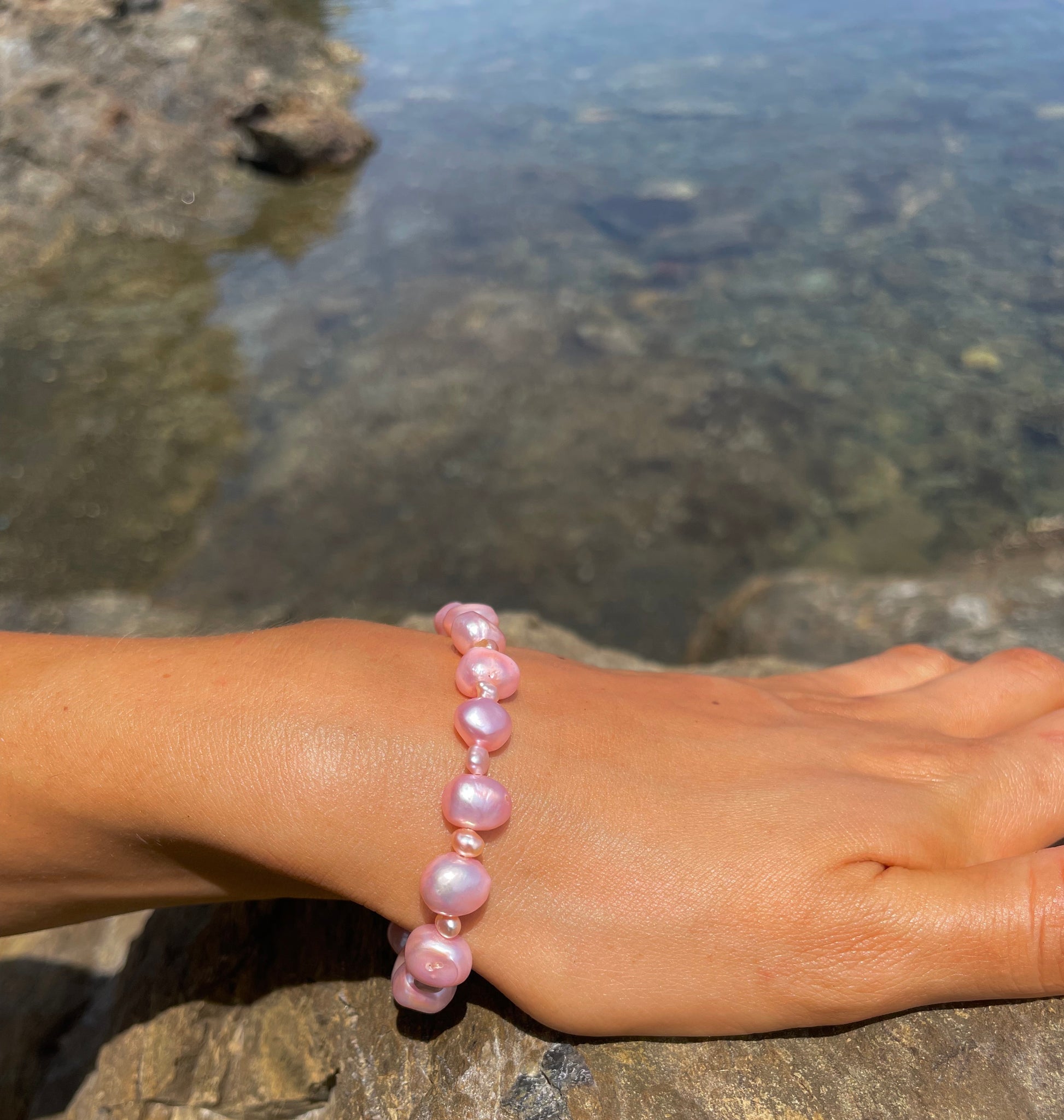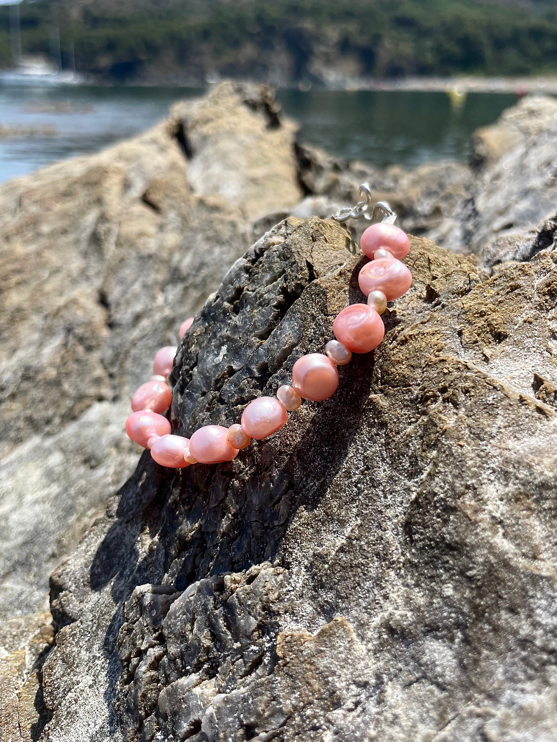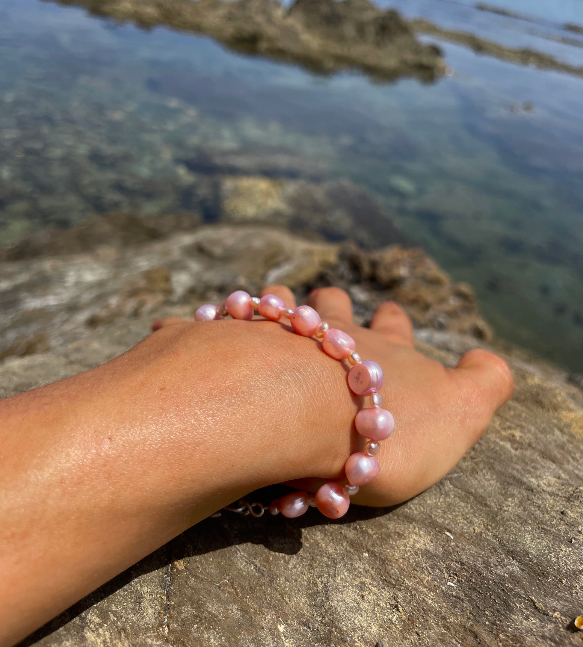ROSI · pulsera compuesta por perlas de agua dulce en tonos rosados, alternando entre perlas grandes y pequeñas.