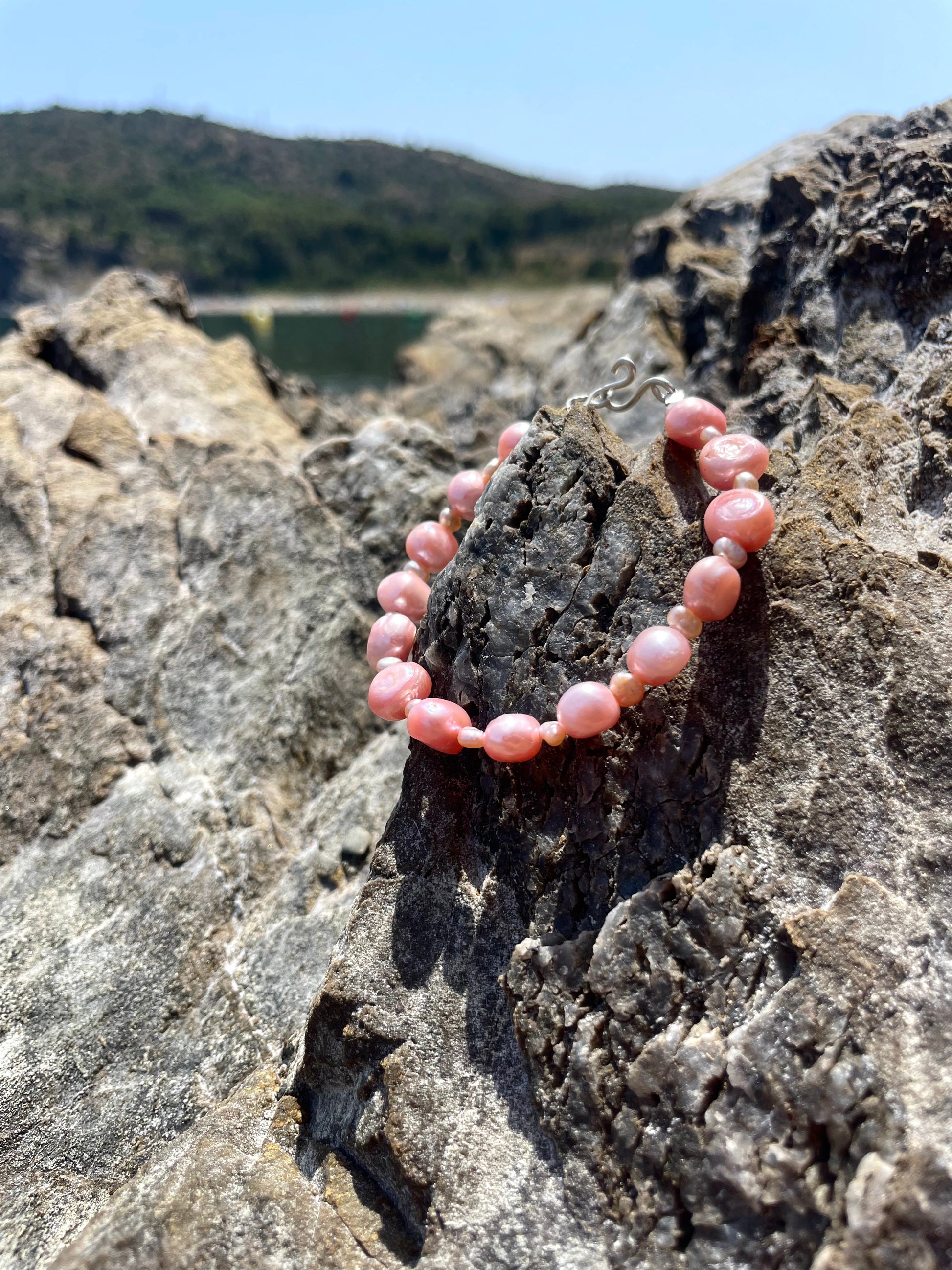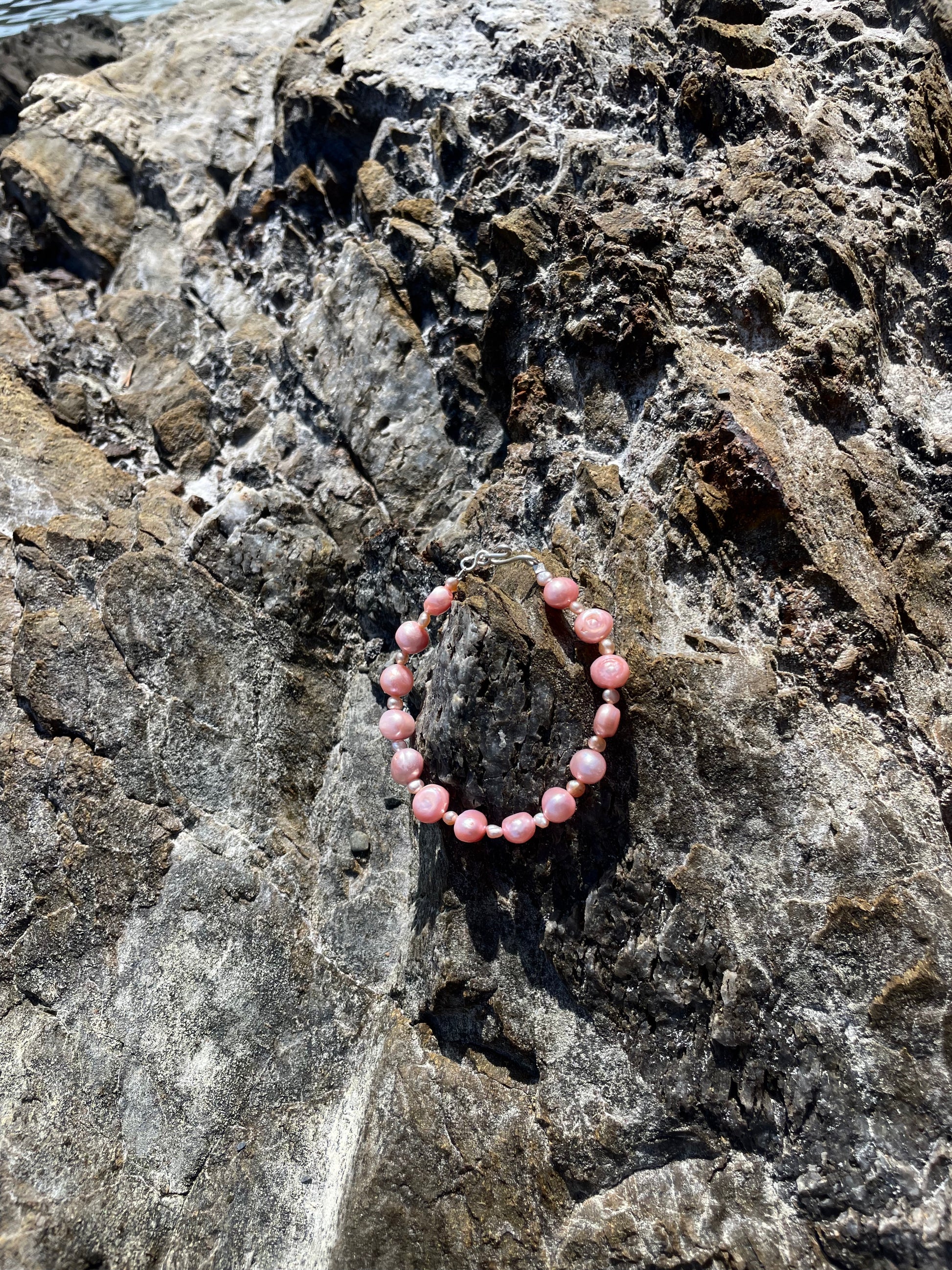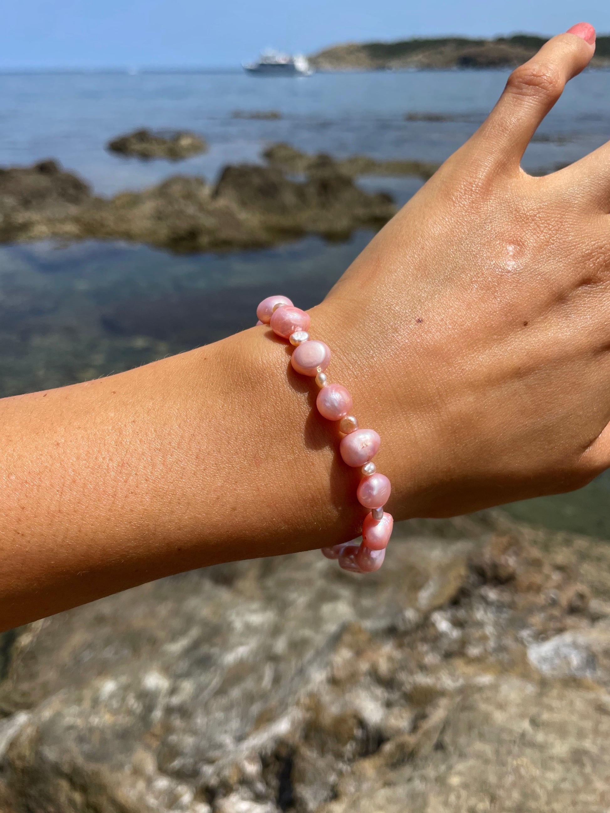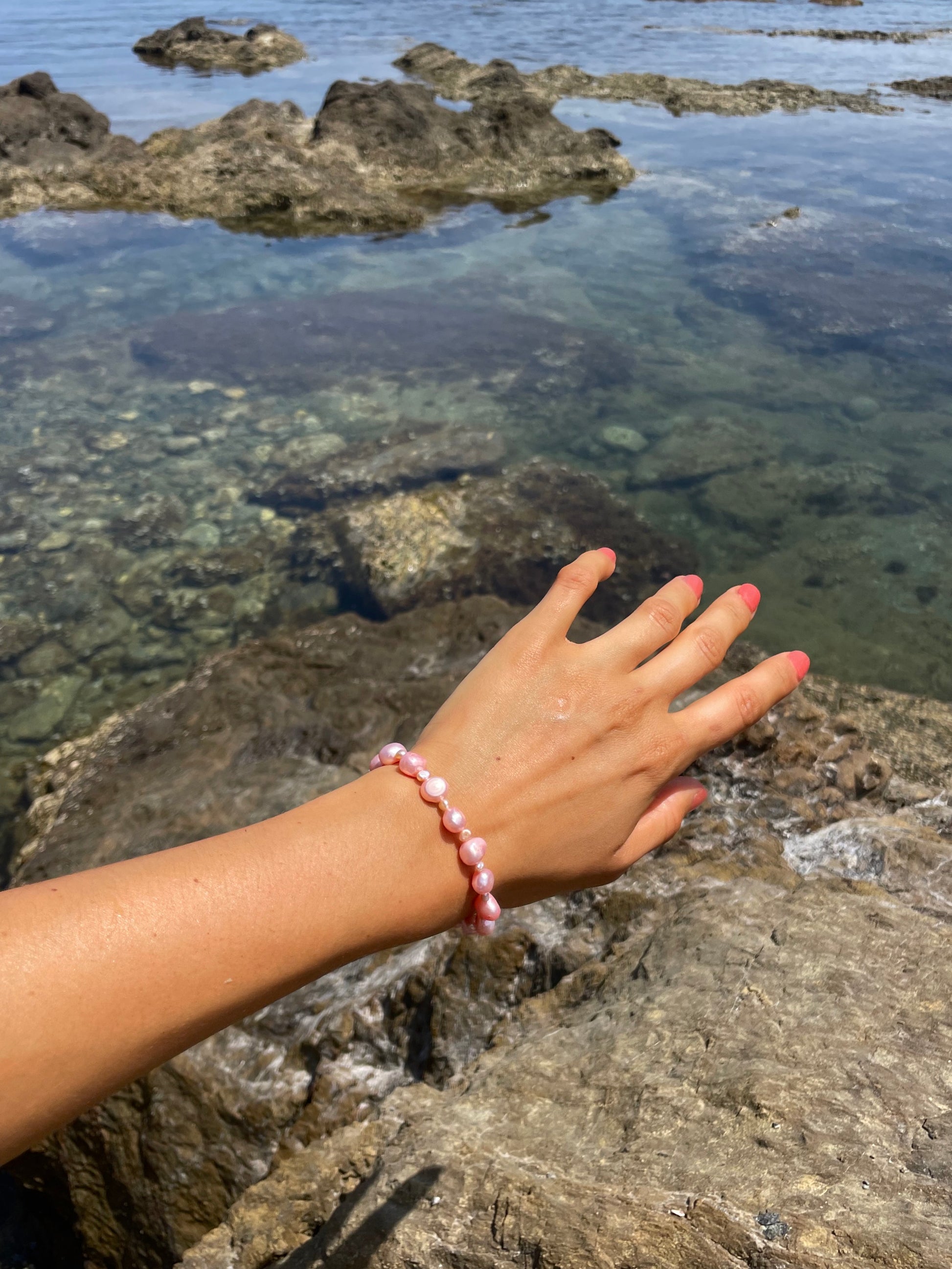 ROSI · pulsera compuesta por perlas de agua dulce en tonos rosados, alternando entre perlas grandes y pequeñas.