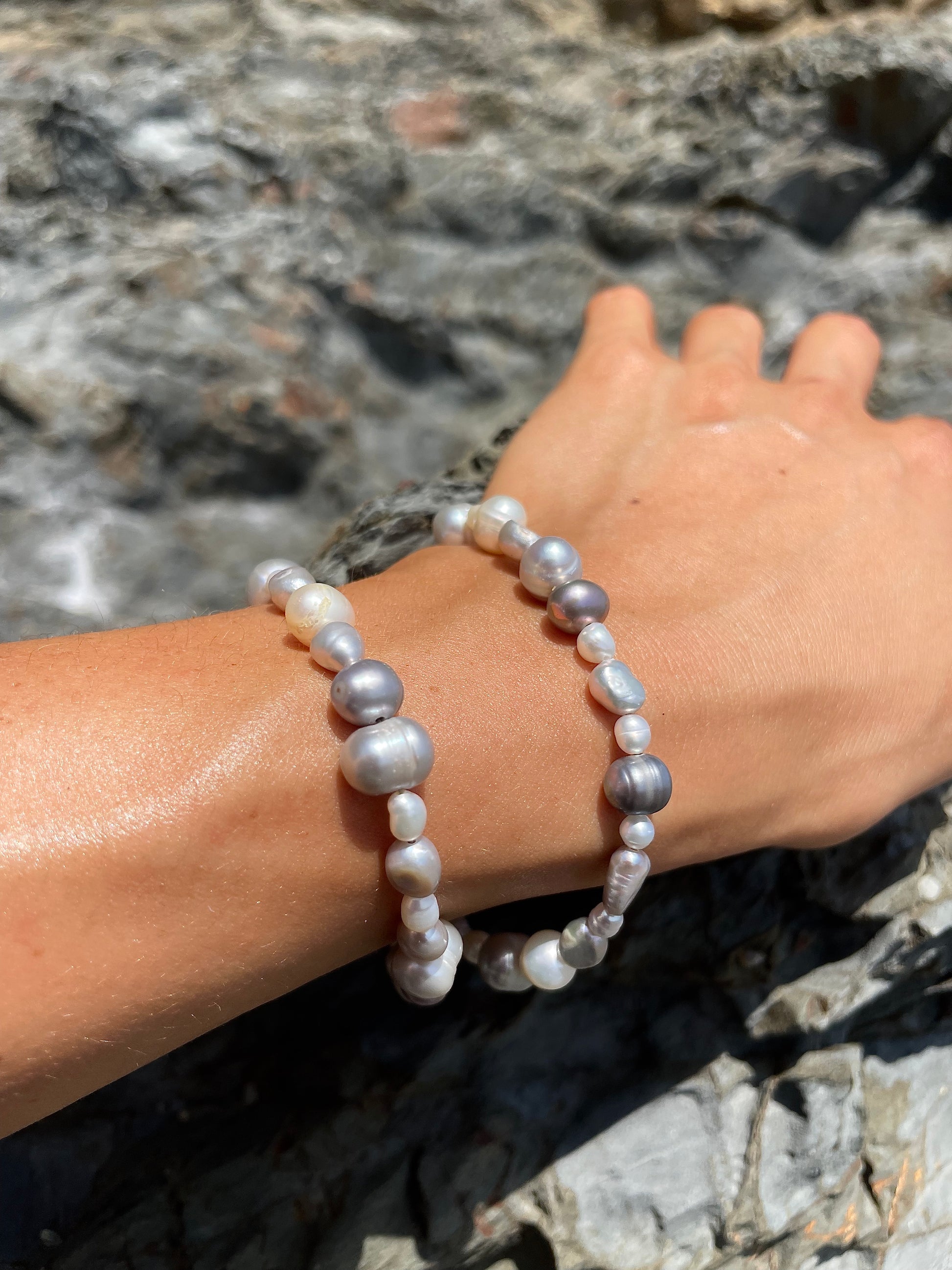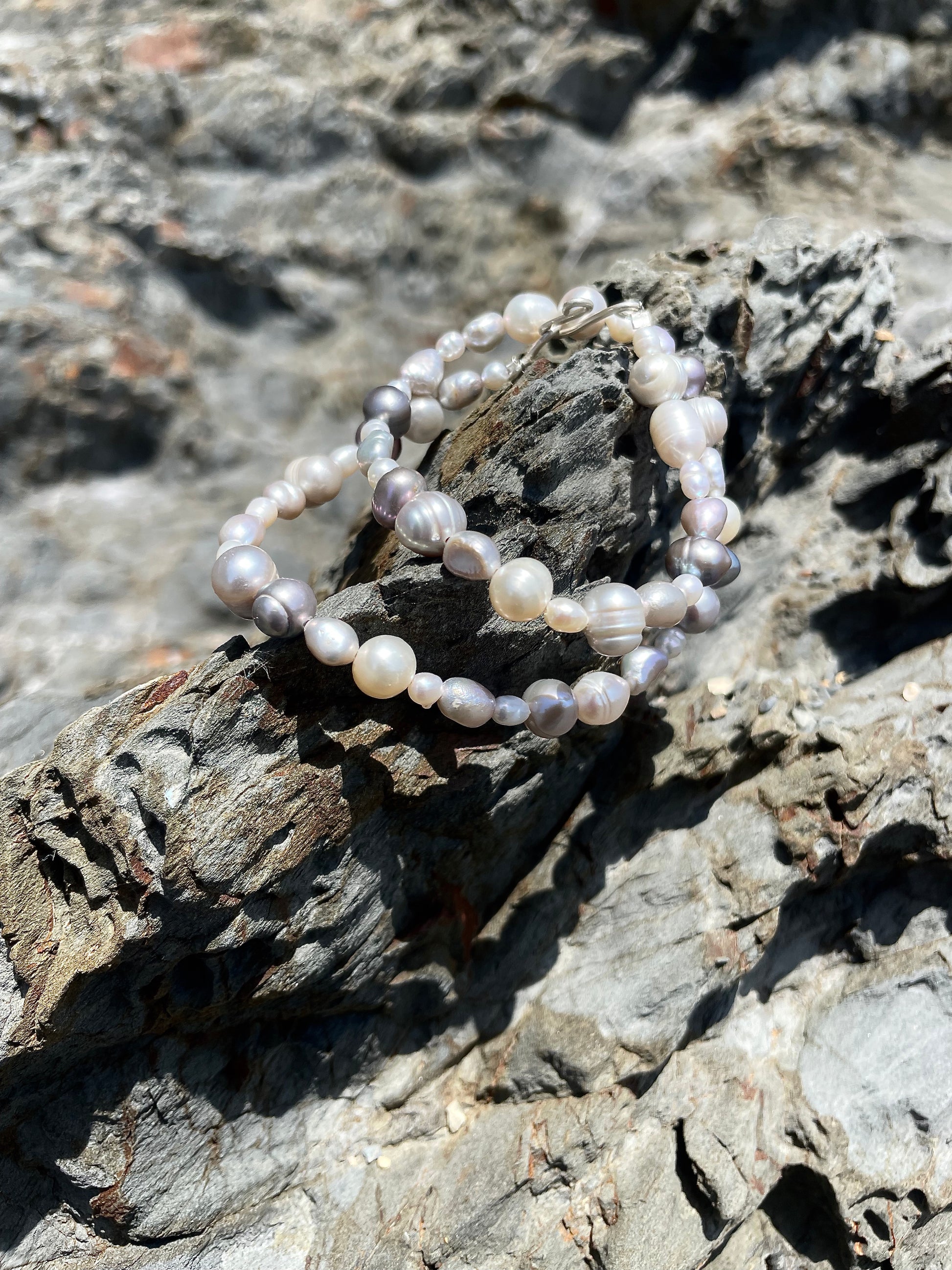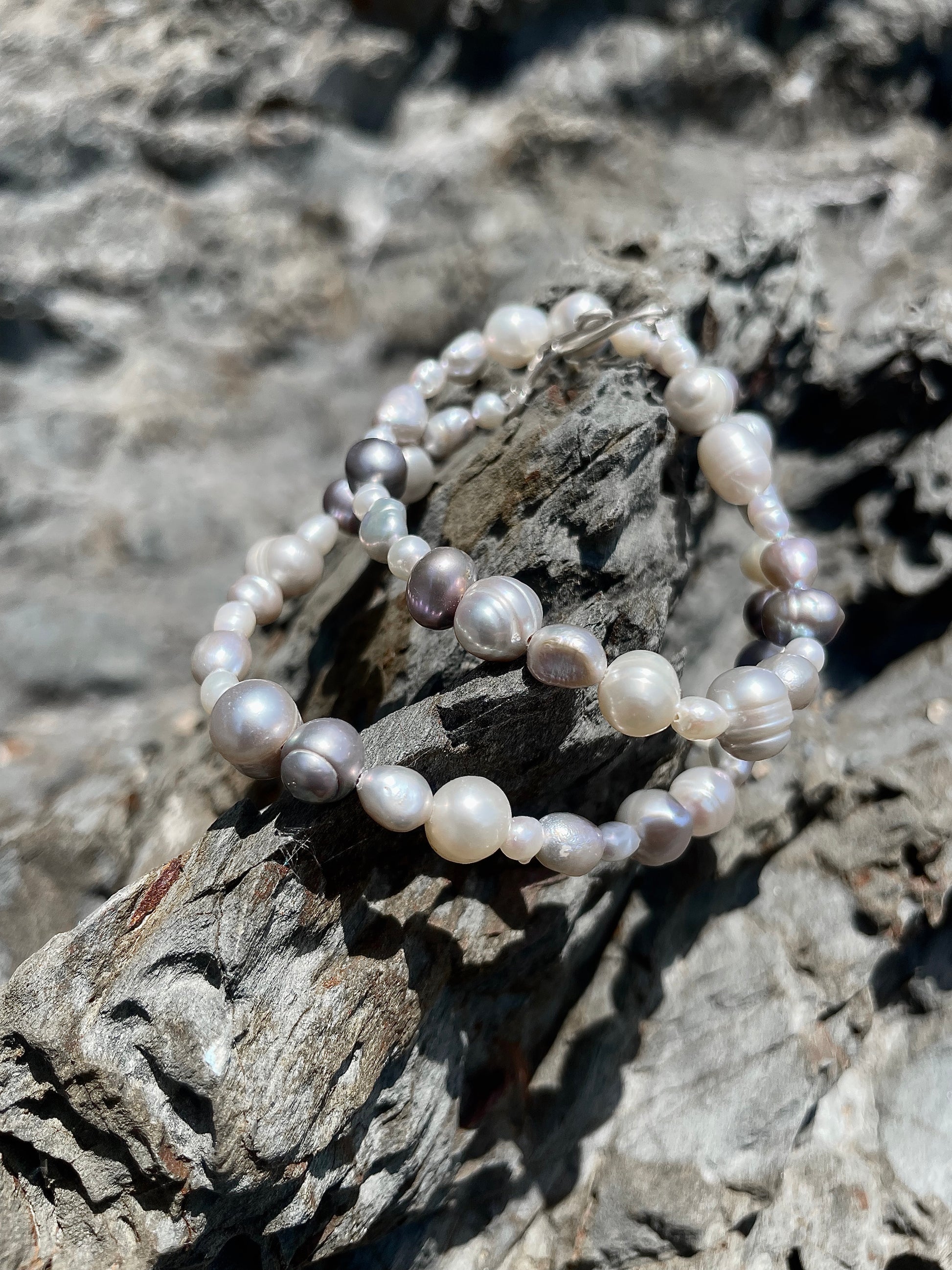 SILVA· pulsera doble que también puedes llevar como collar, hecha de perlas de agua dulce en tonos blancos y plateados.