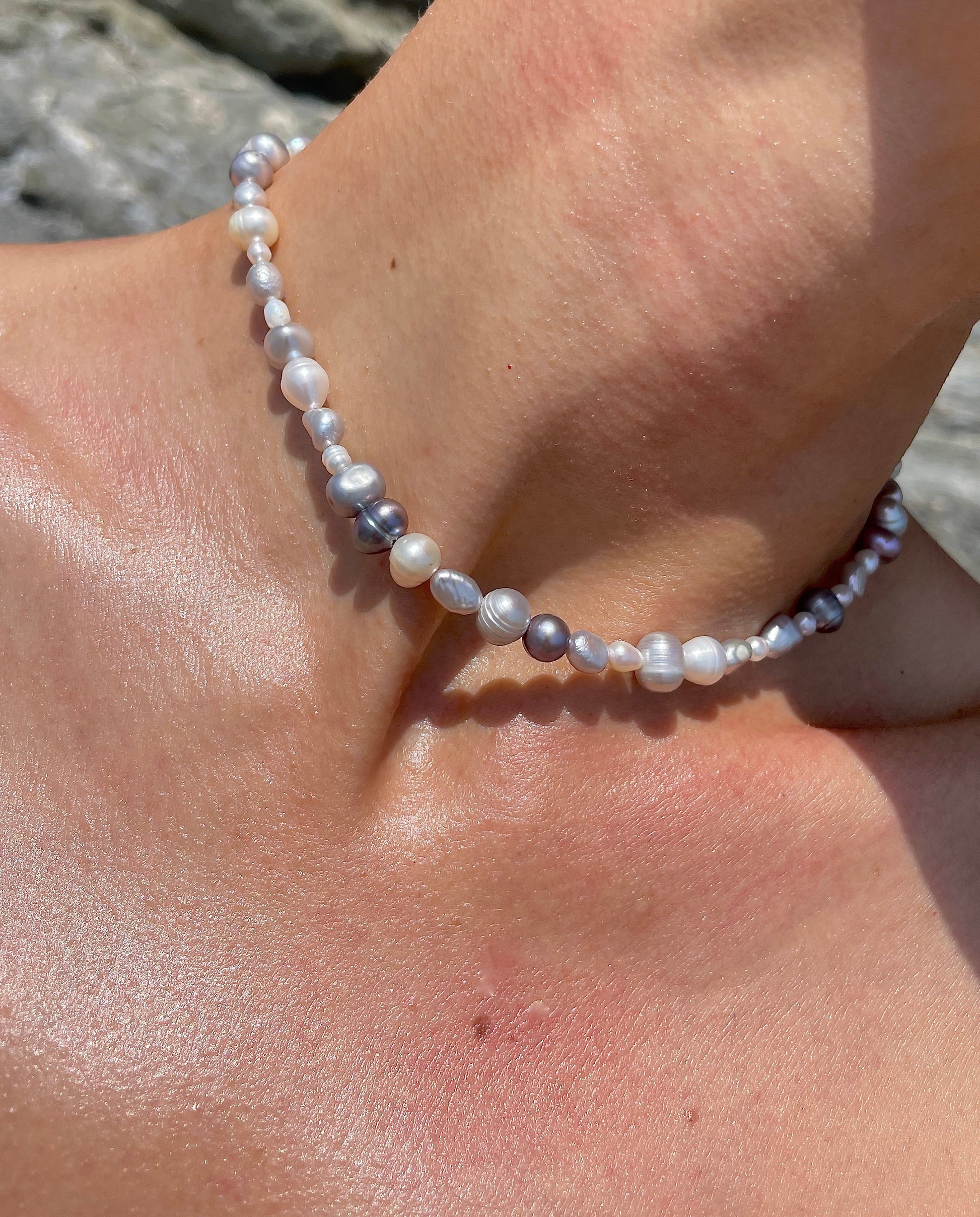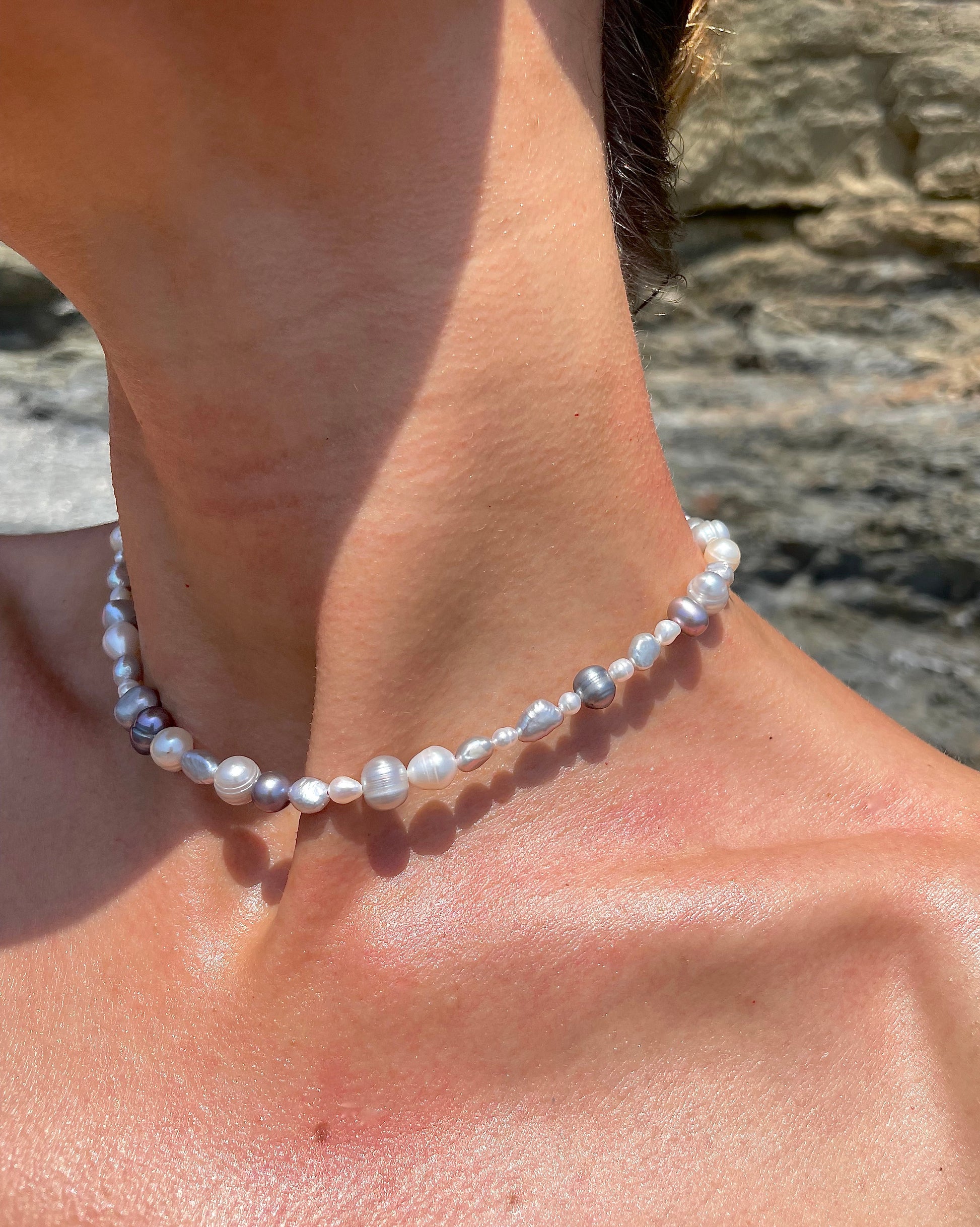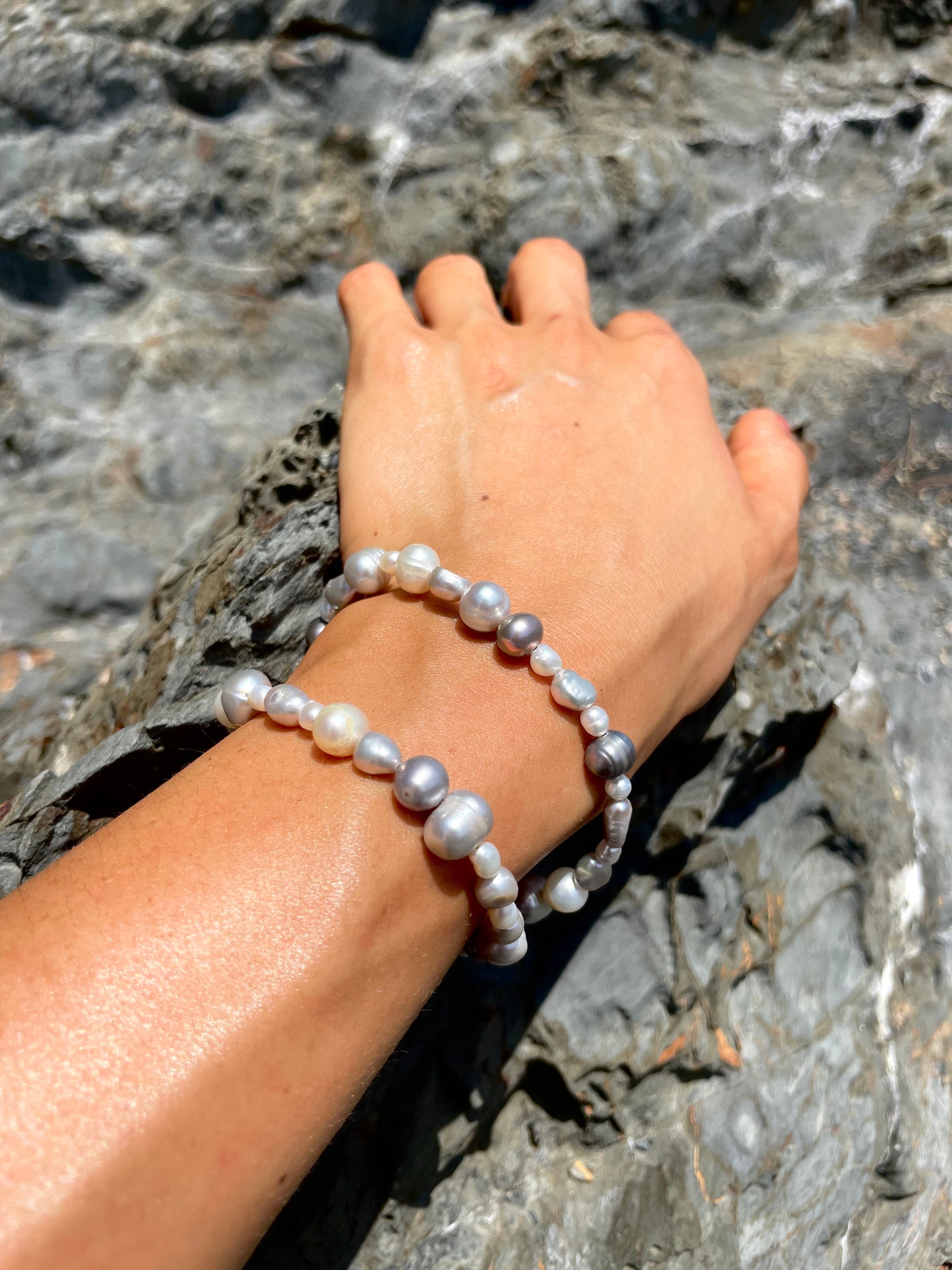 SILVA· pulsera doble que también puedes llevar como collar, hecha de perlas de agua dulce en tonos blancos y plateados.