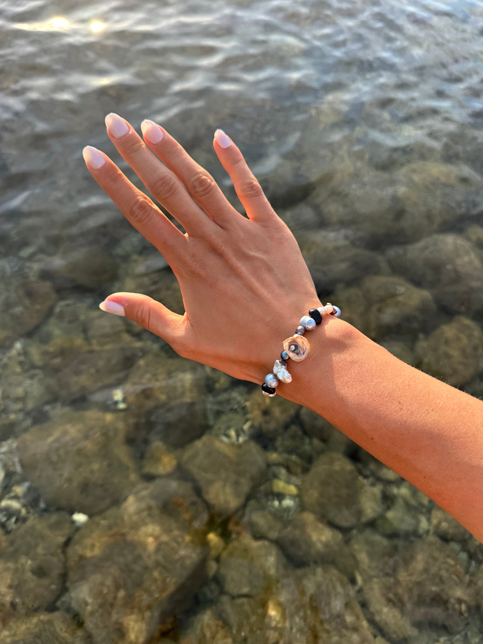SIRENA · en el centro de esta pulsera destaca una perla keshi clara de reflejos nacarados, coronada por una pequeña perla keshi azul que crea un delicado efecto floral.