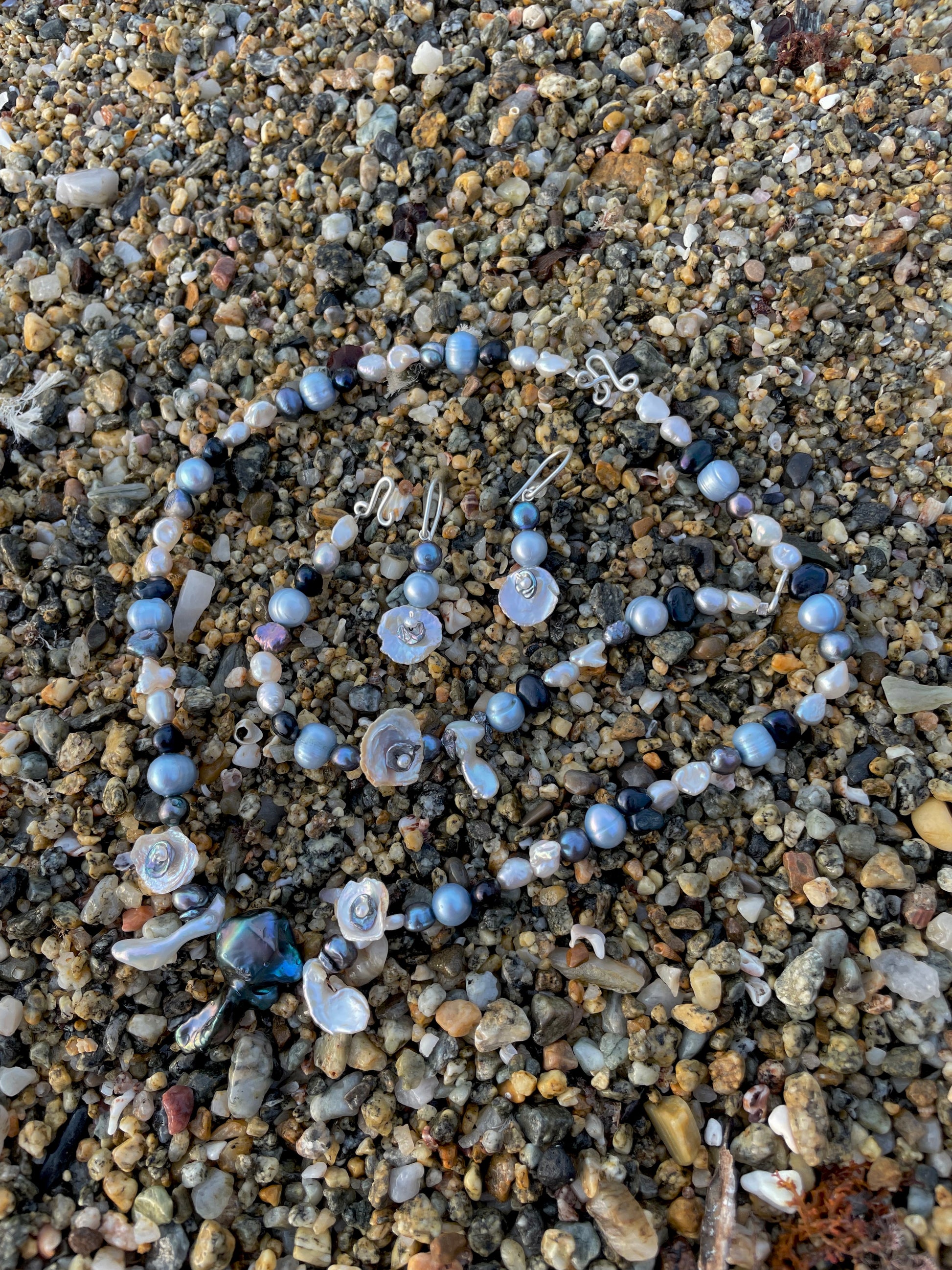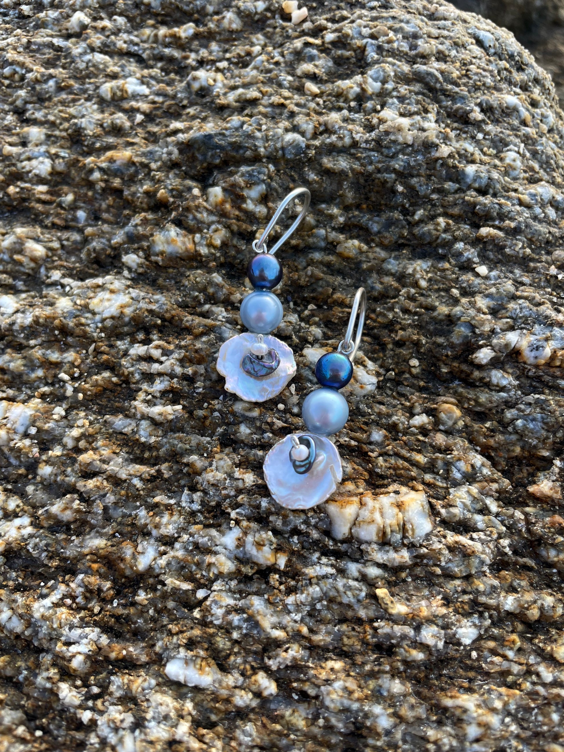 SIRENA · estos pendientes únicos presentan como base una perla keshi clara de destellos nacarados, sobre la cual reposa una pequeña perla keshi azul que aporta un delicado efecto floral.