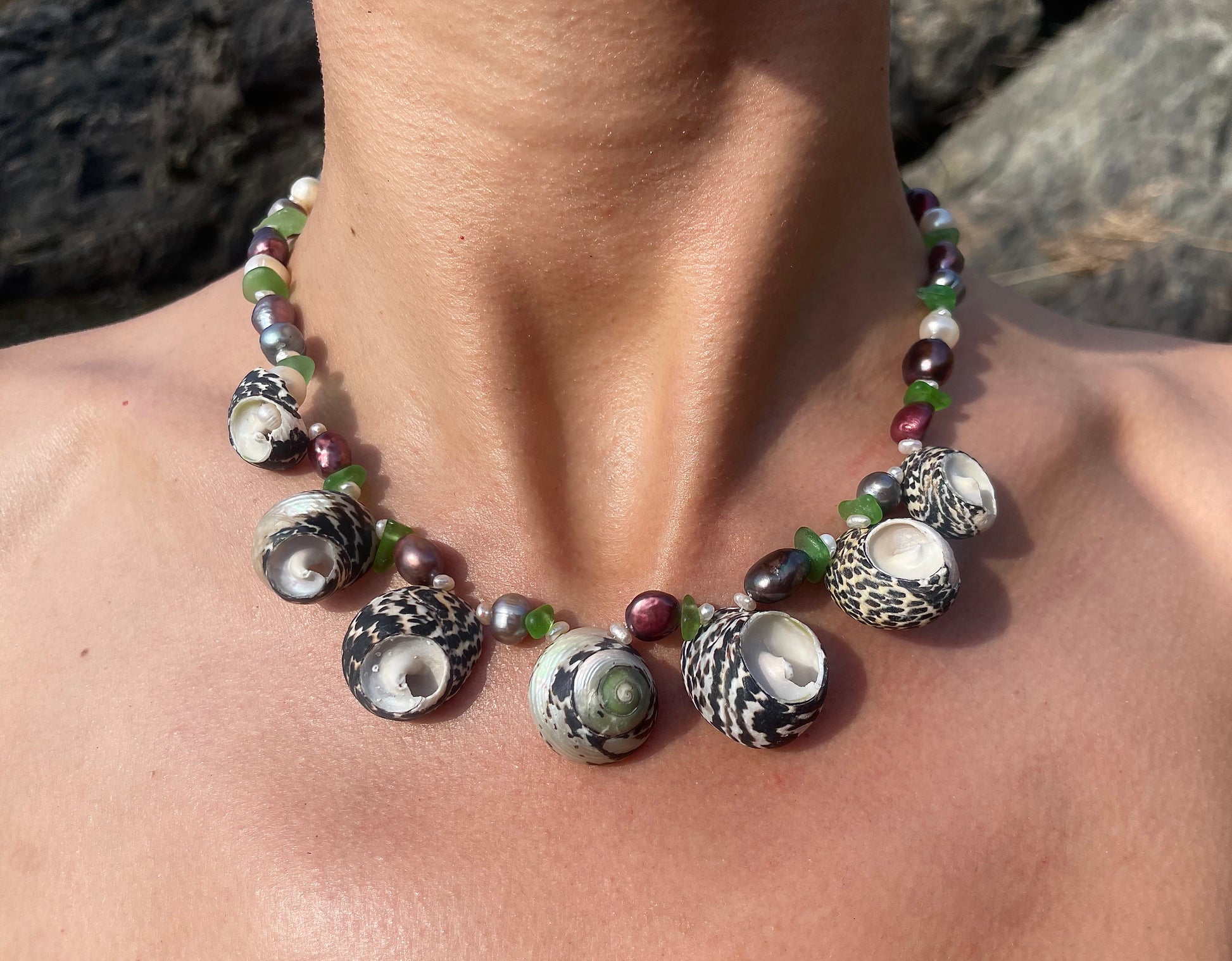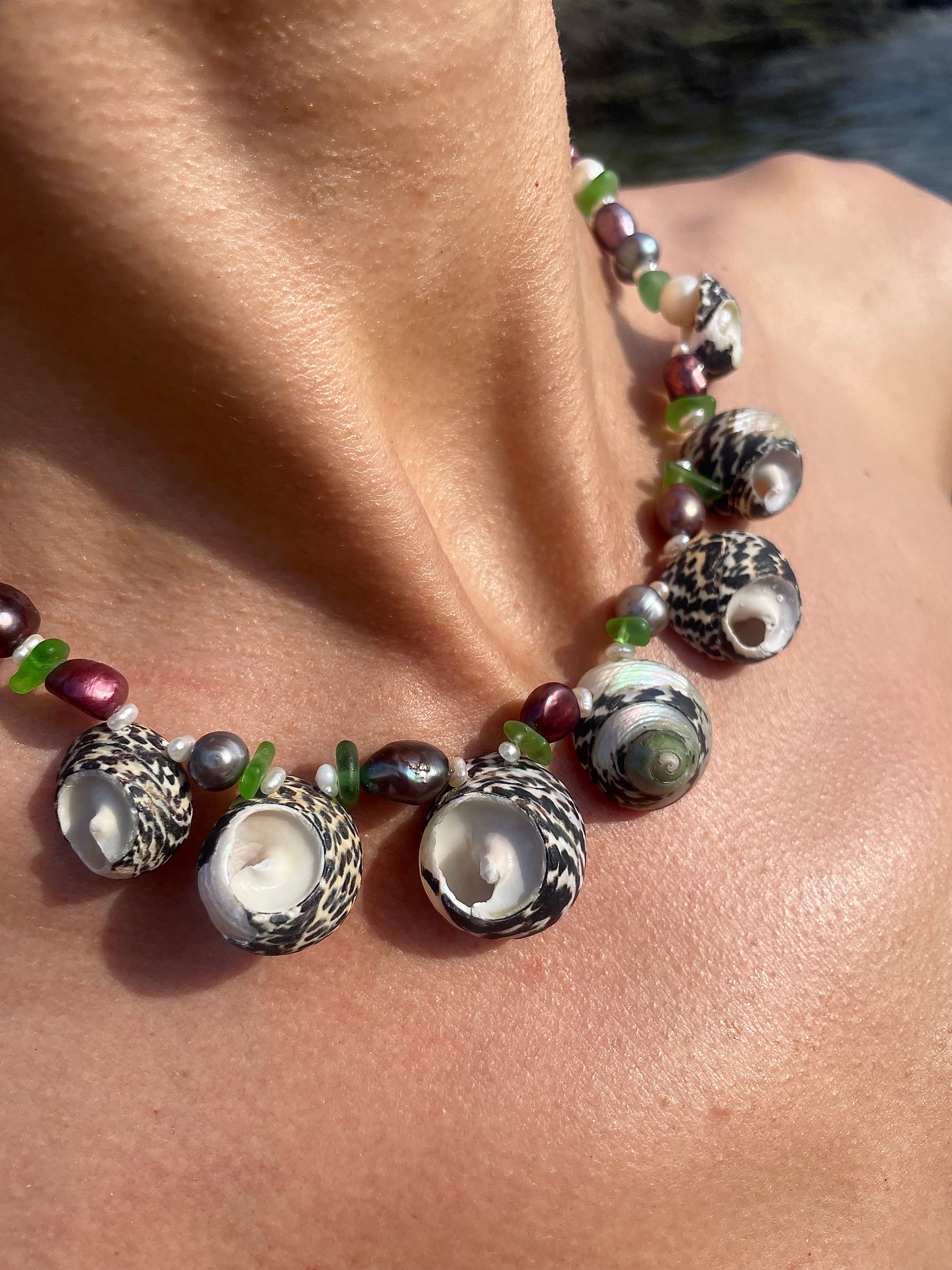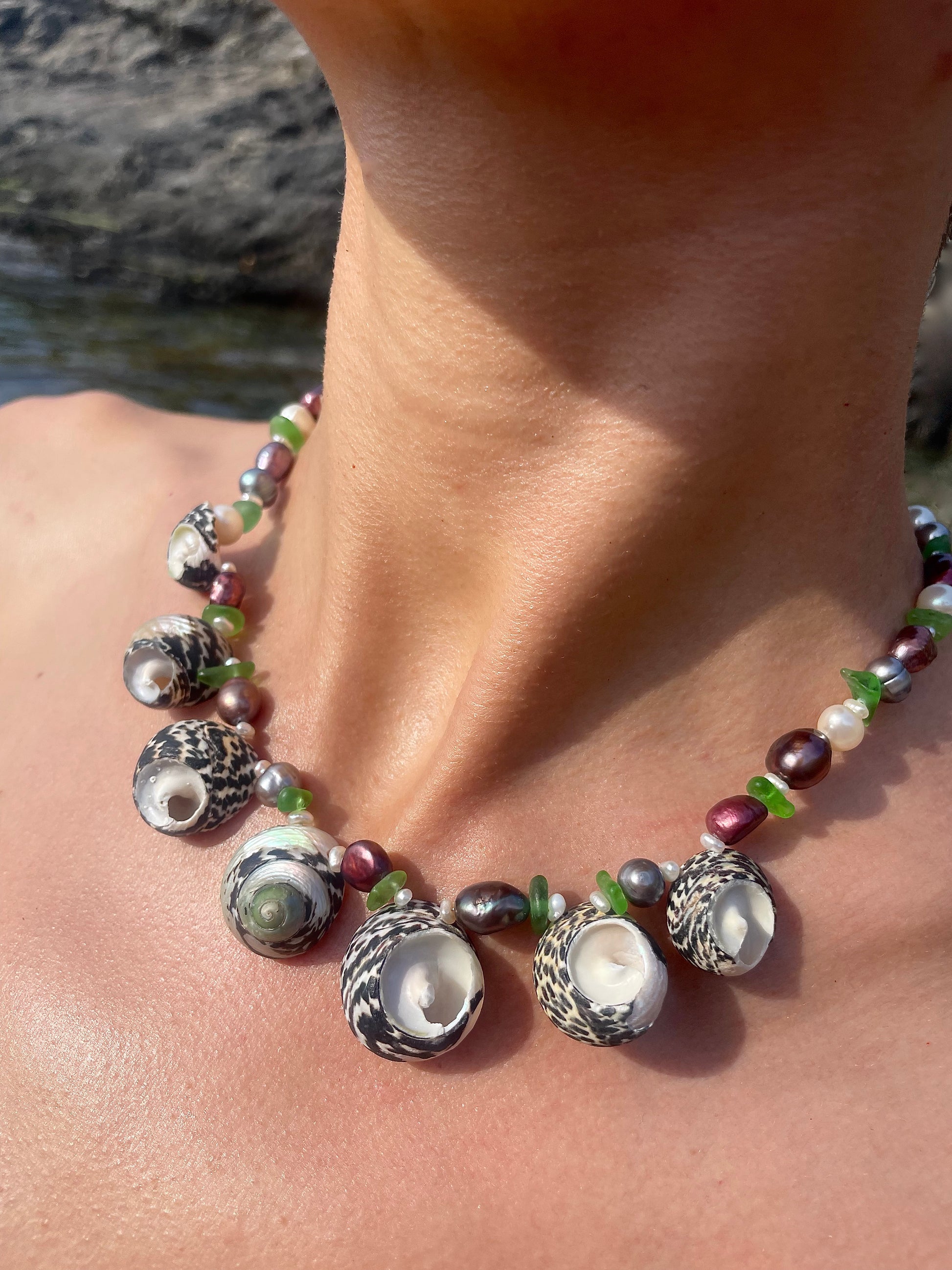 SNAILS · collar compuesto por varias caracolas marinas oscuras y una caracola nacarada clara en el centro, rodeadas de vidrio marino verde y diversas perlas de agua dulce en tonos oscuros y bronceados
