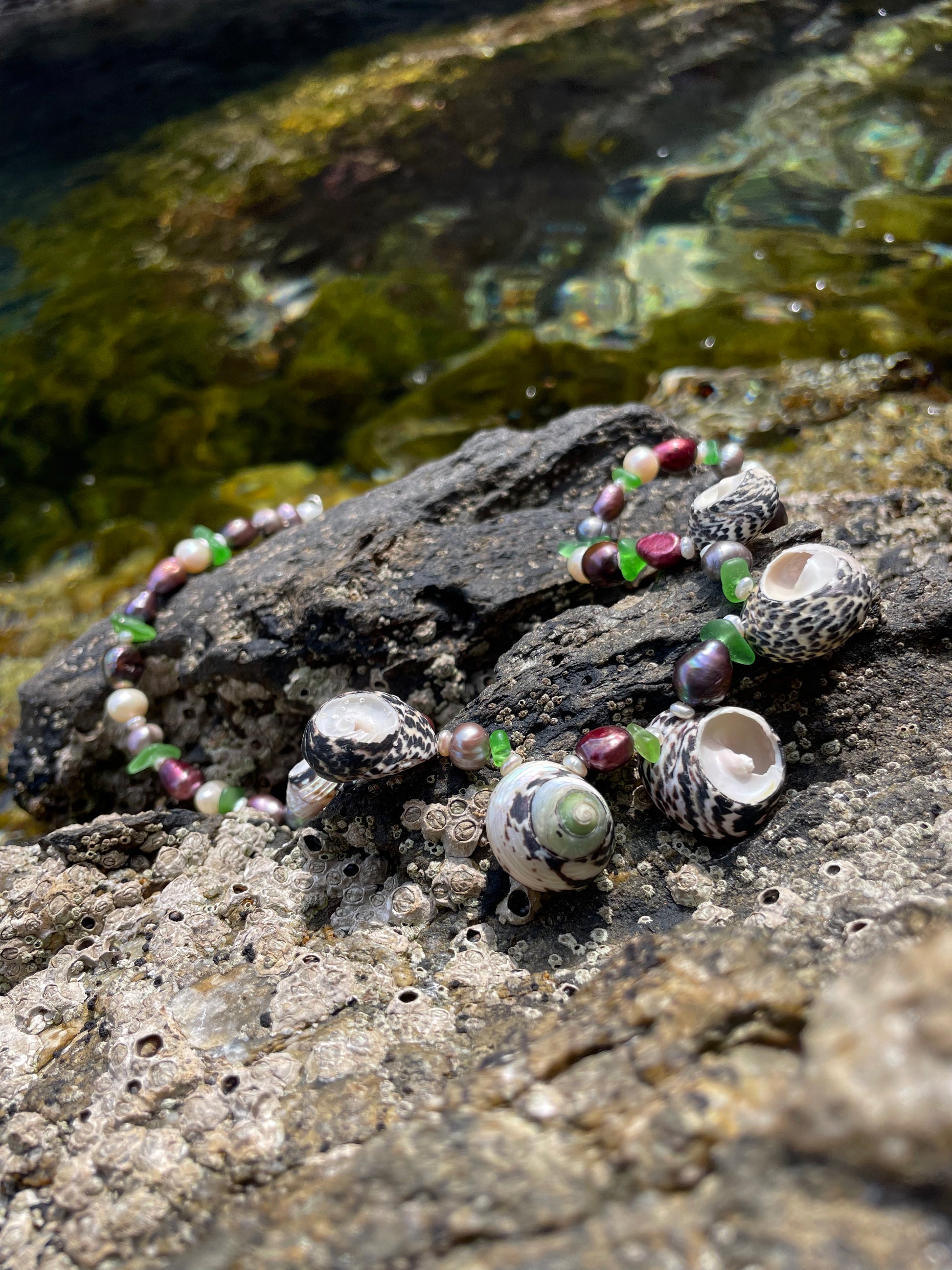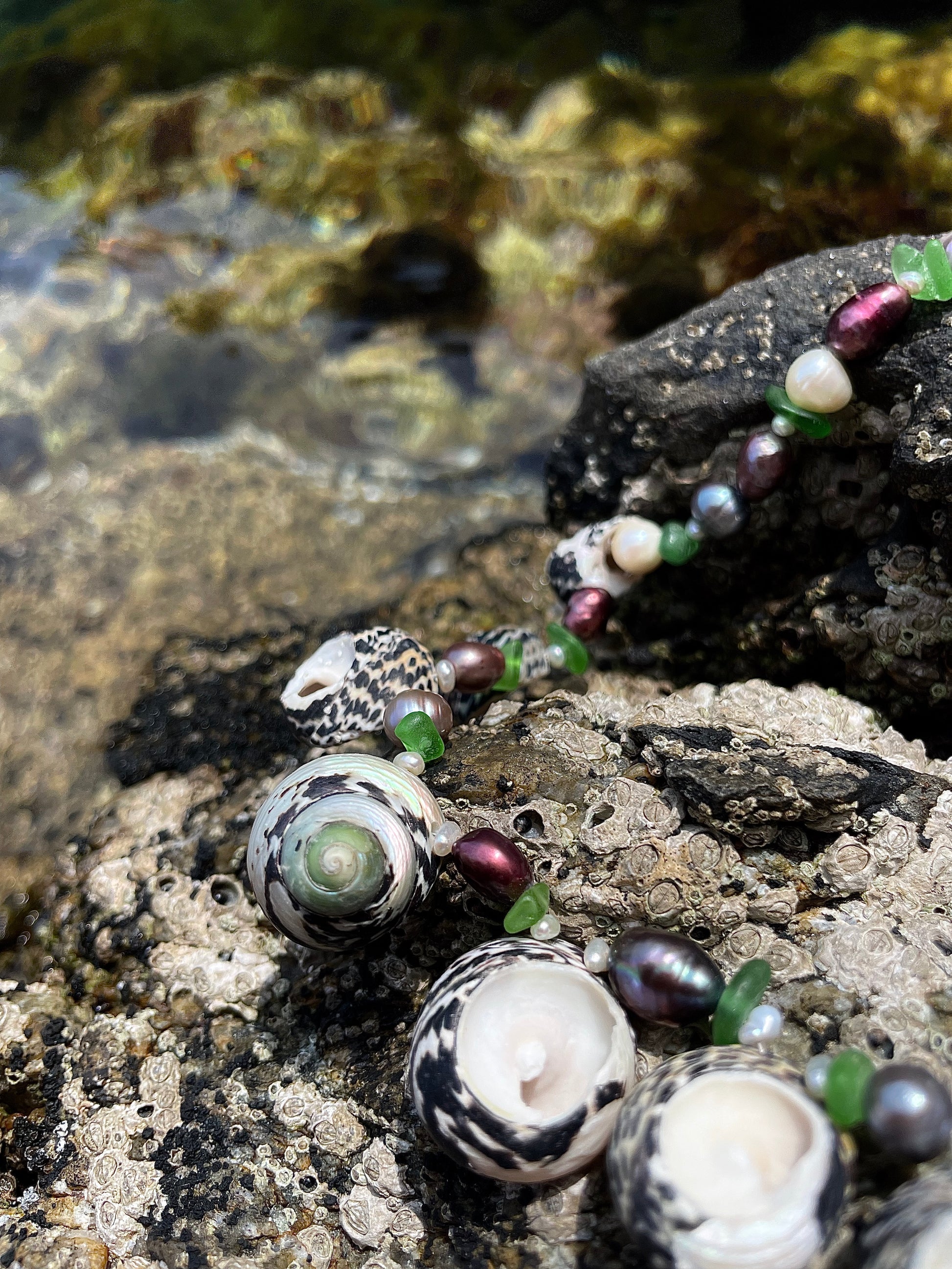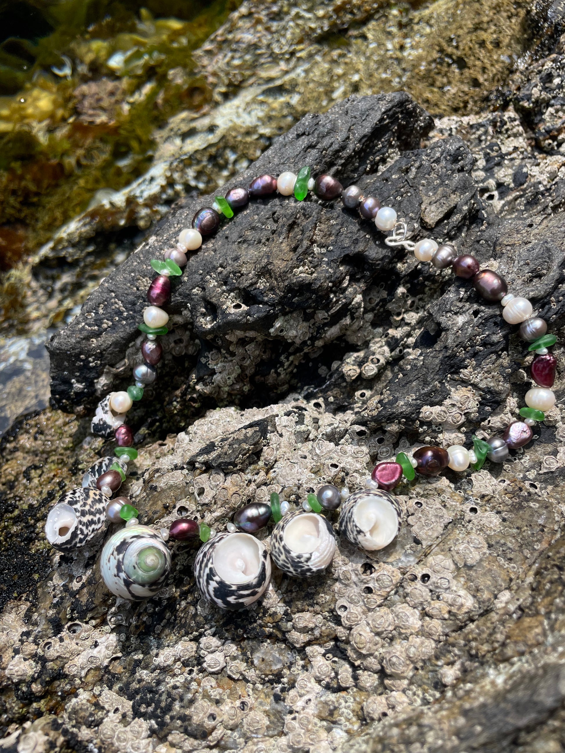 SNAILS · collar compuesto por varias caracolas marinas oscuras y una caracola nacarada clara en el centro, rodeadas de vidrio marino verde y diversas perlas de agua dulce en tonos oscuros y bronceados