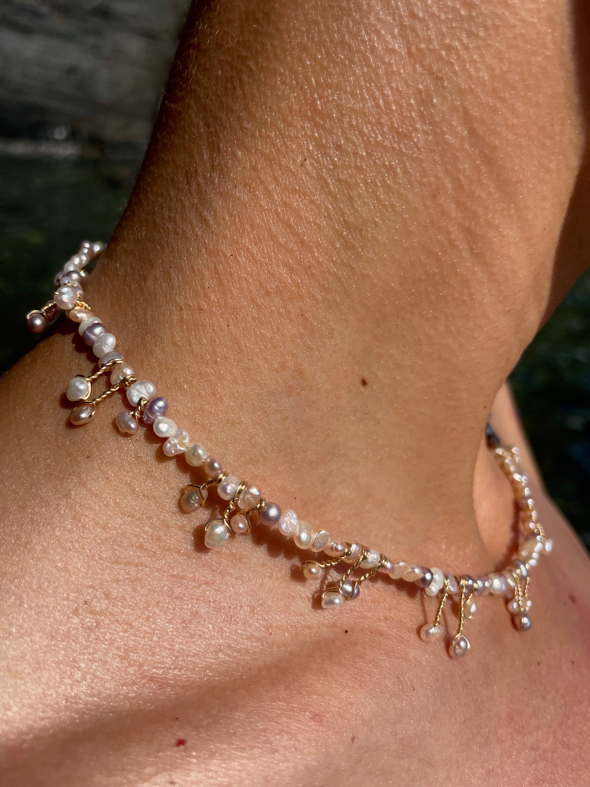perlas cultivadas de agua dulce blancas y teñidas · alambre gold filled 14k · interior: alambre gold filled 14k · cierre: alambre gold filled 14k