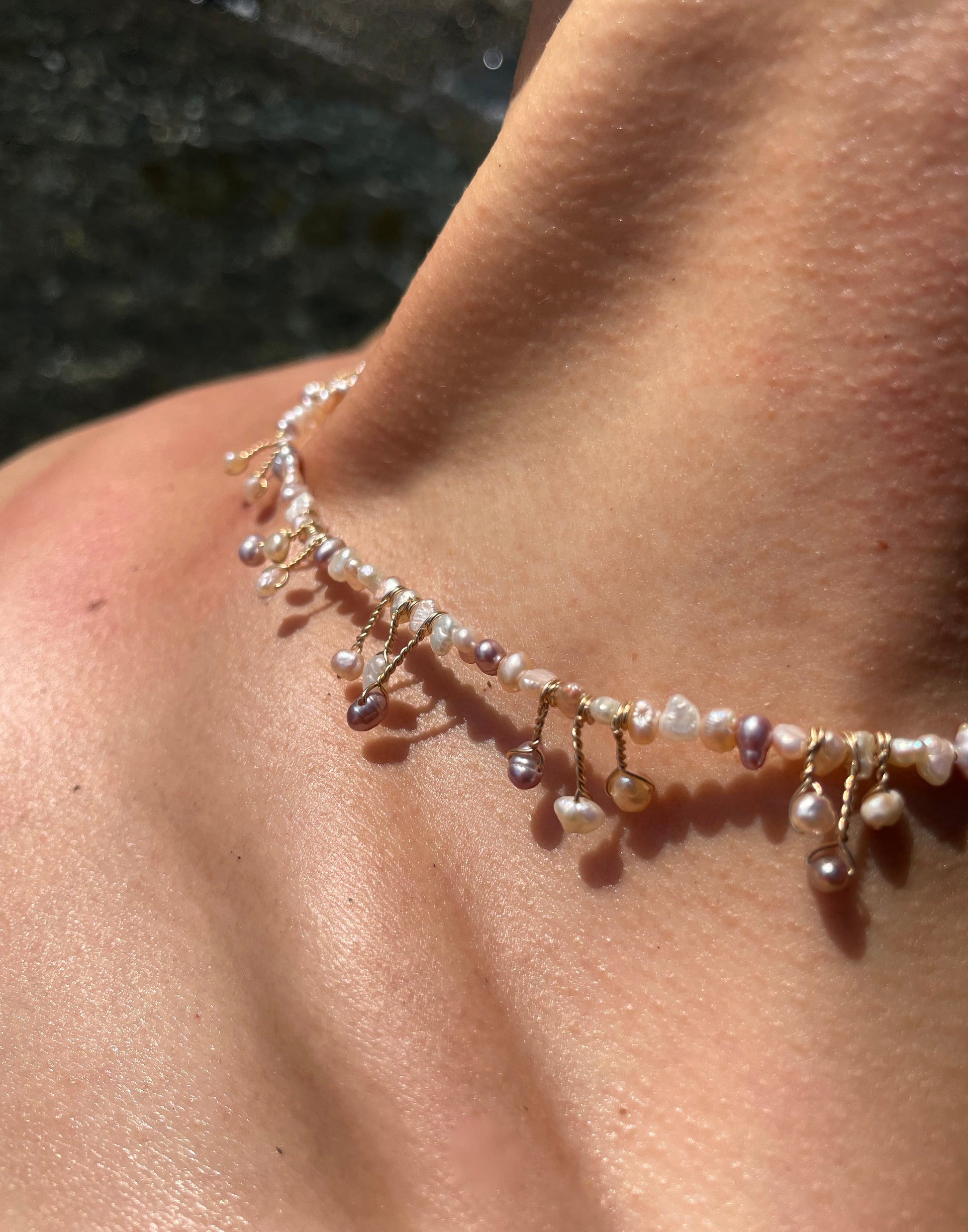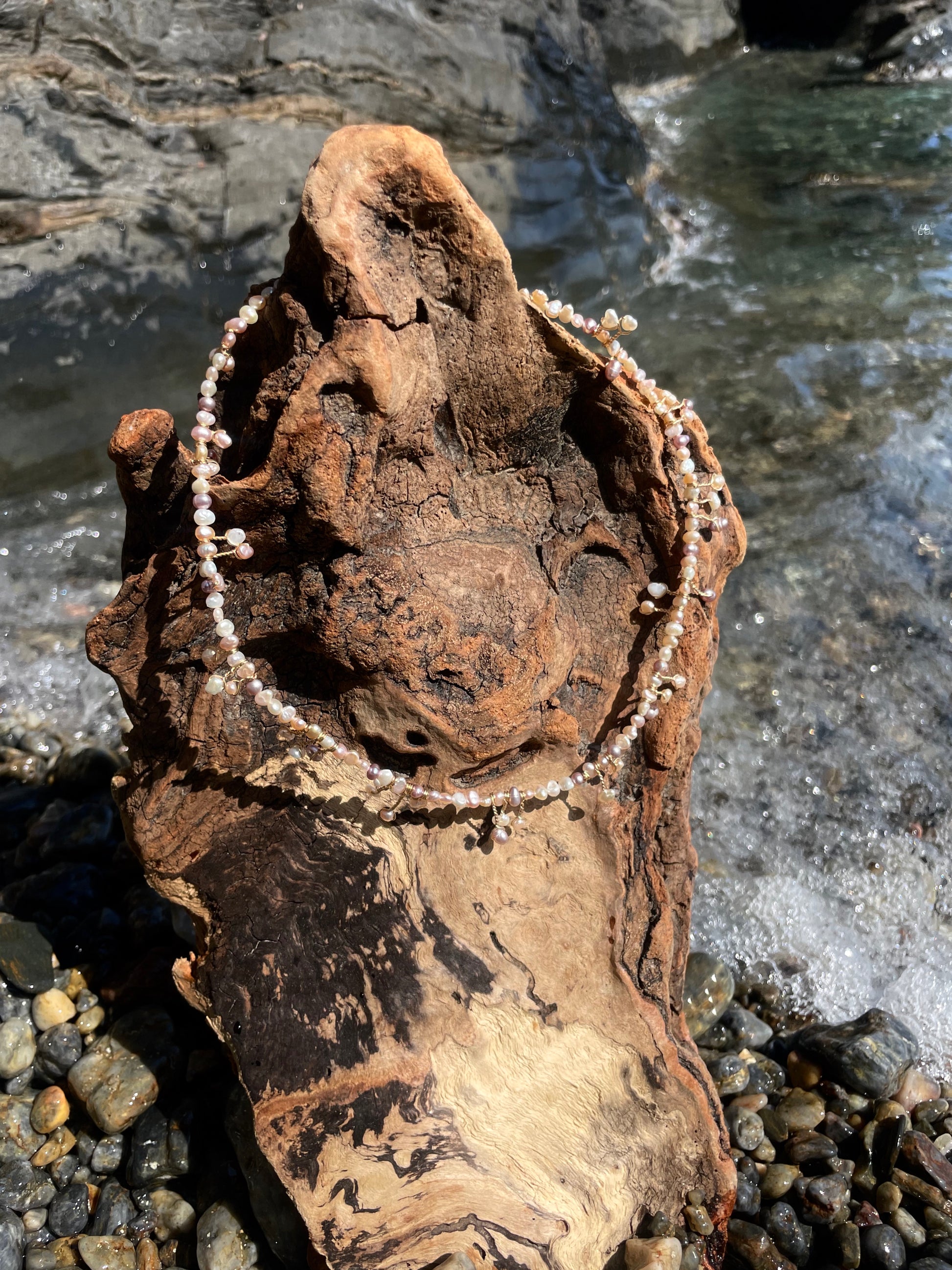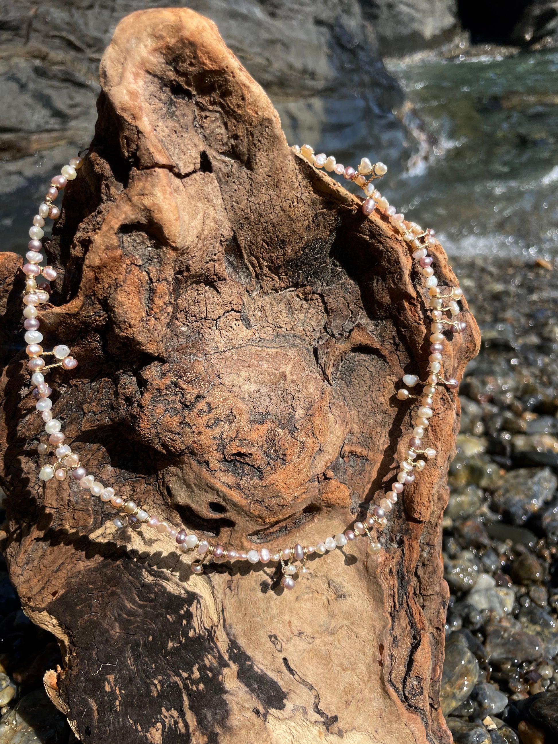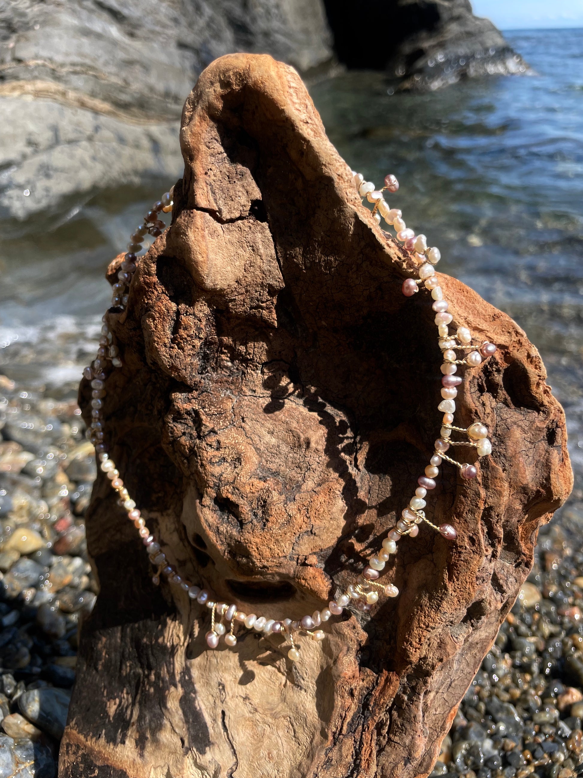 SOPHIA · delicado collar confeccionado con pequeñas perlas de agua dulce en tonos rosé y blanco, entrelazadas con fino hilo de oro laminado.