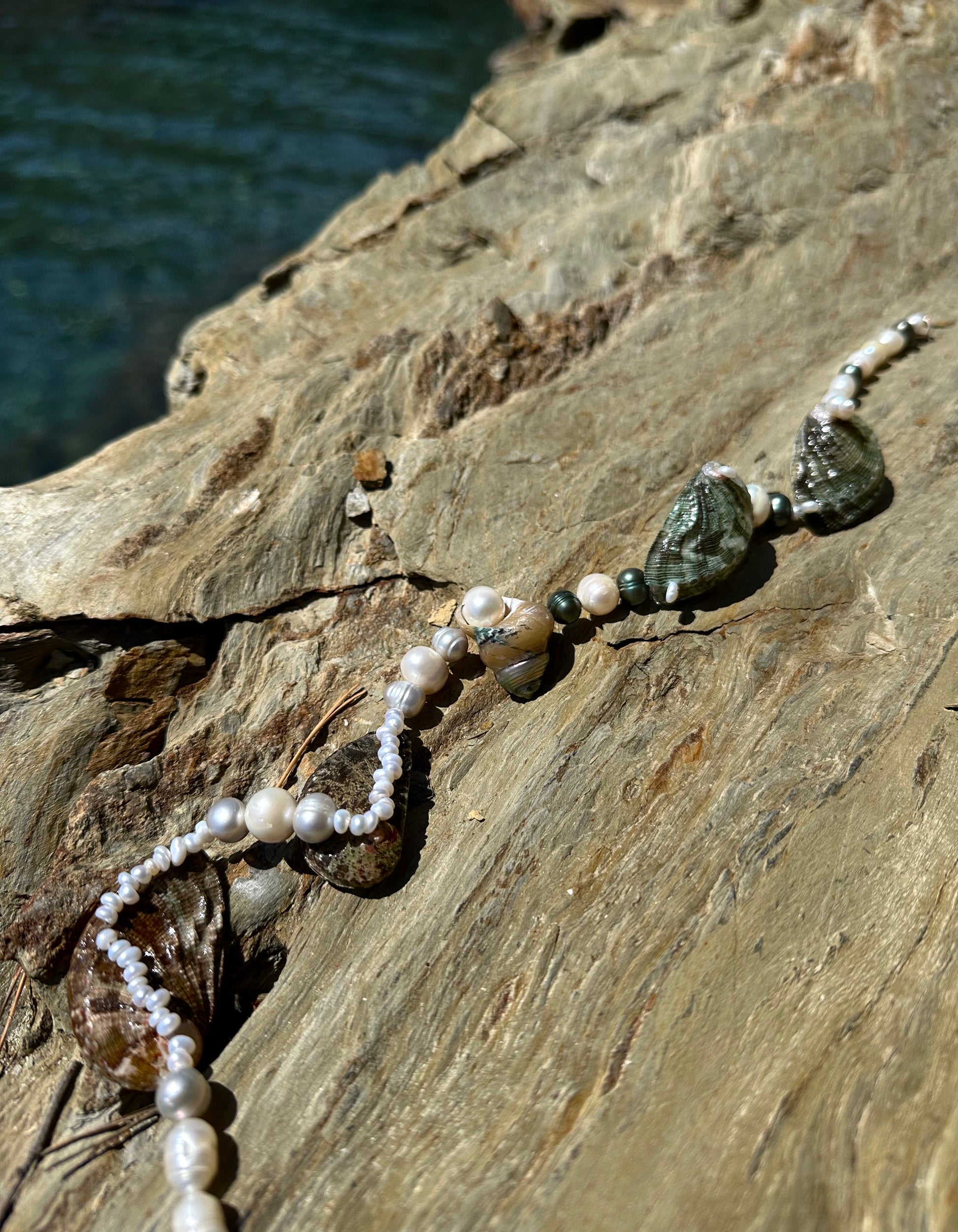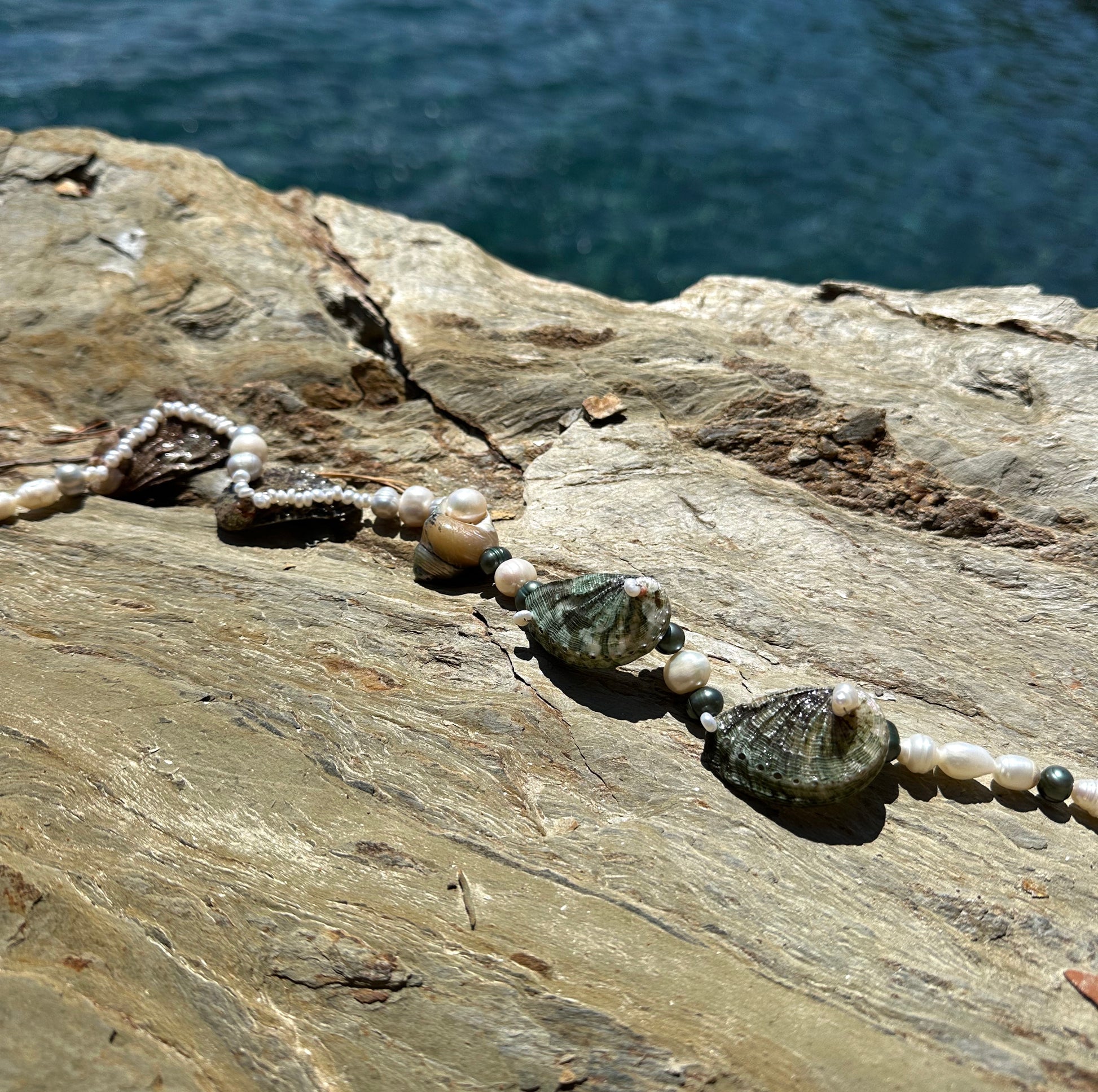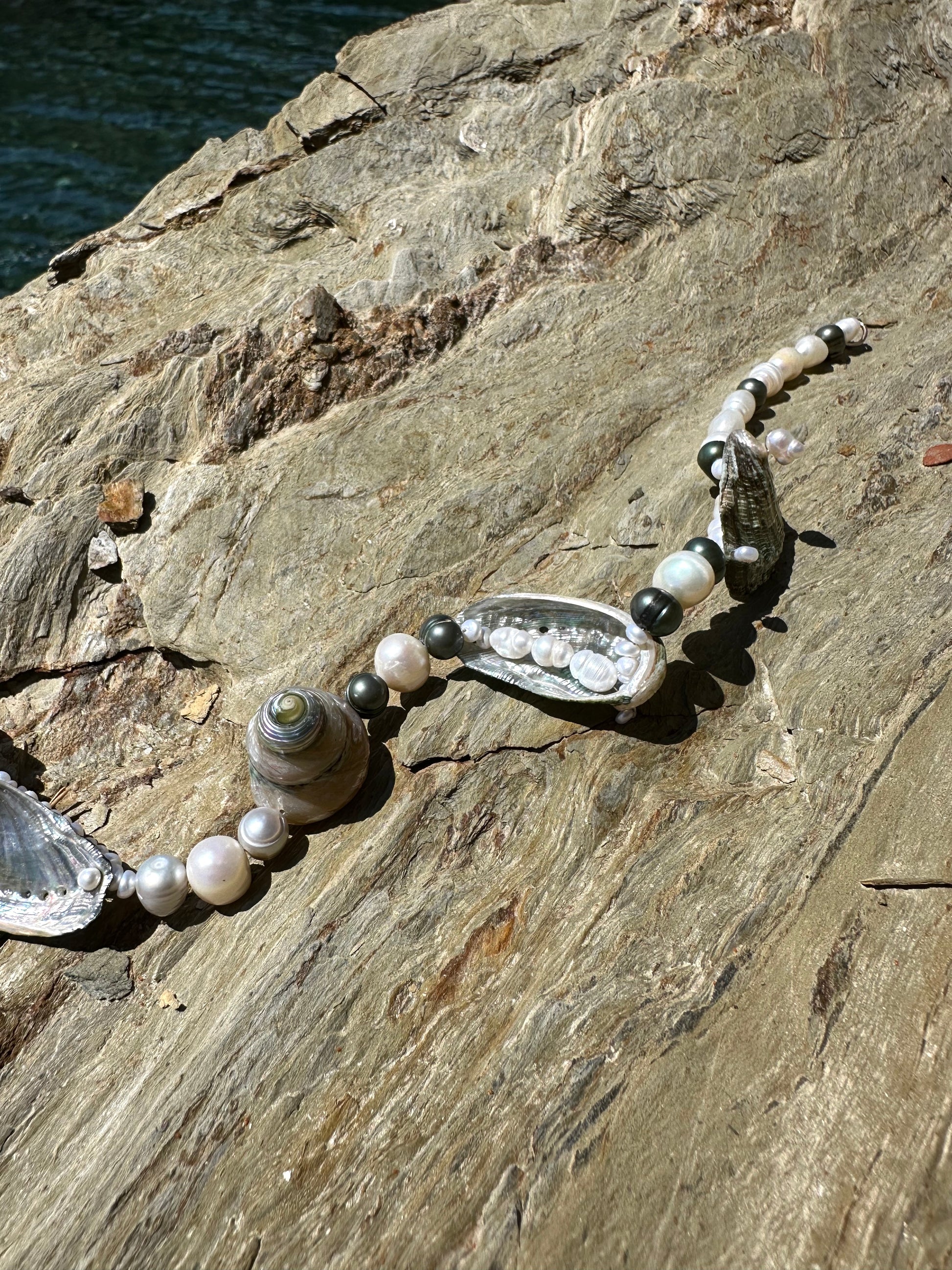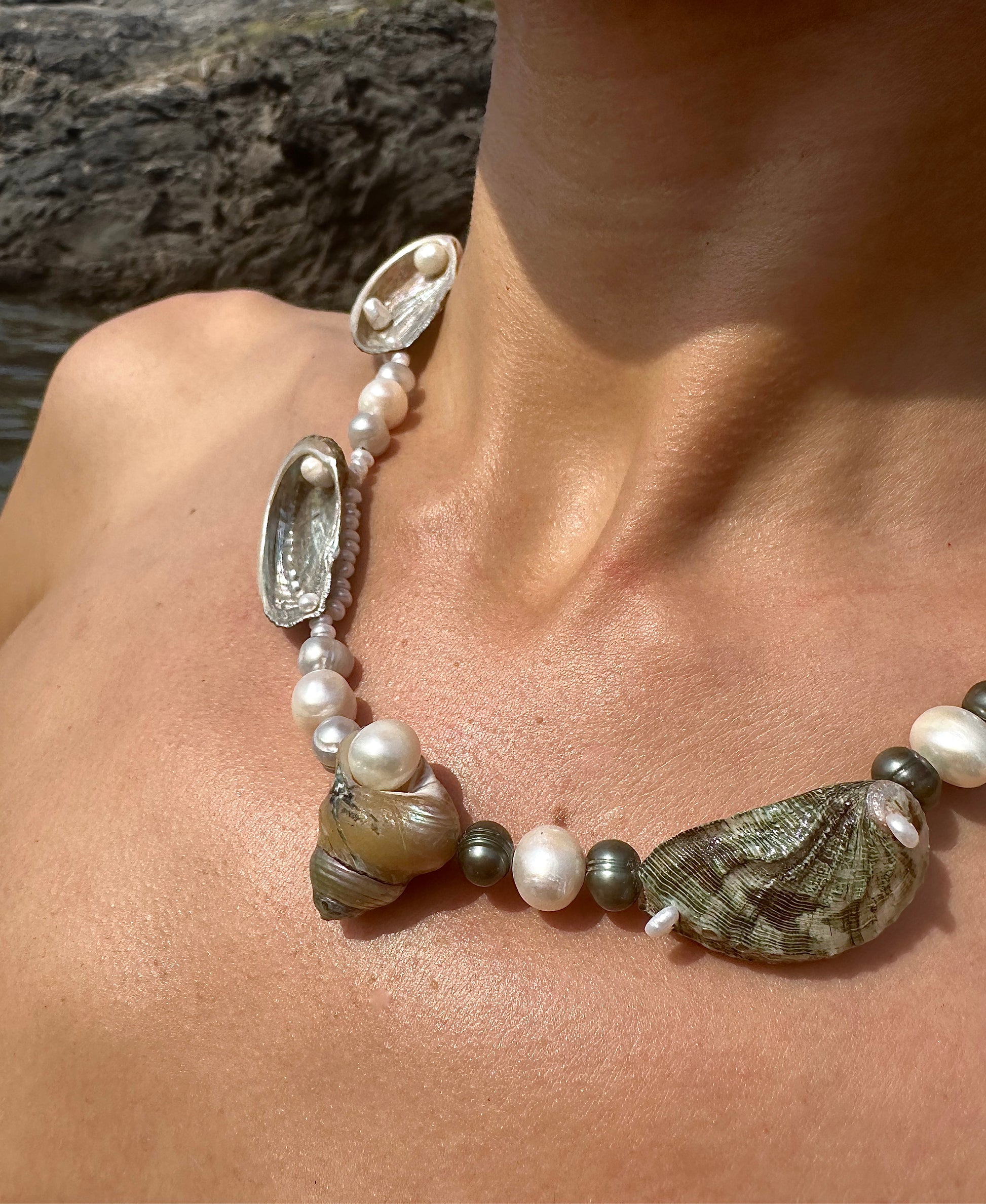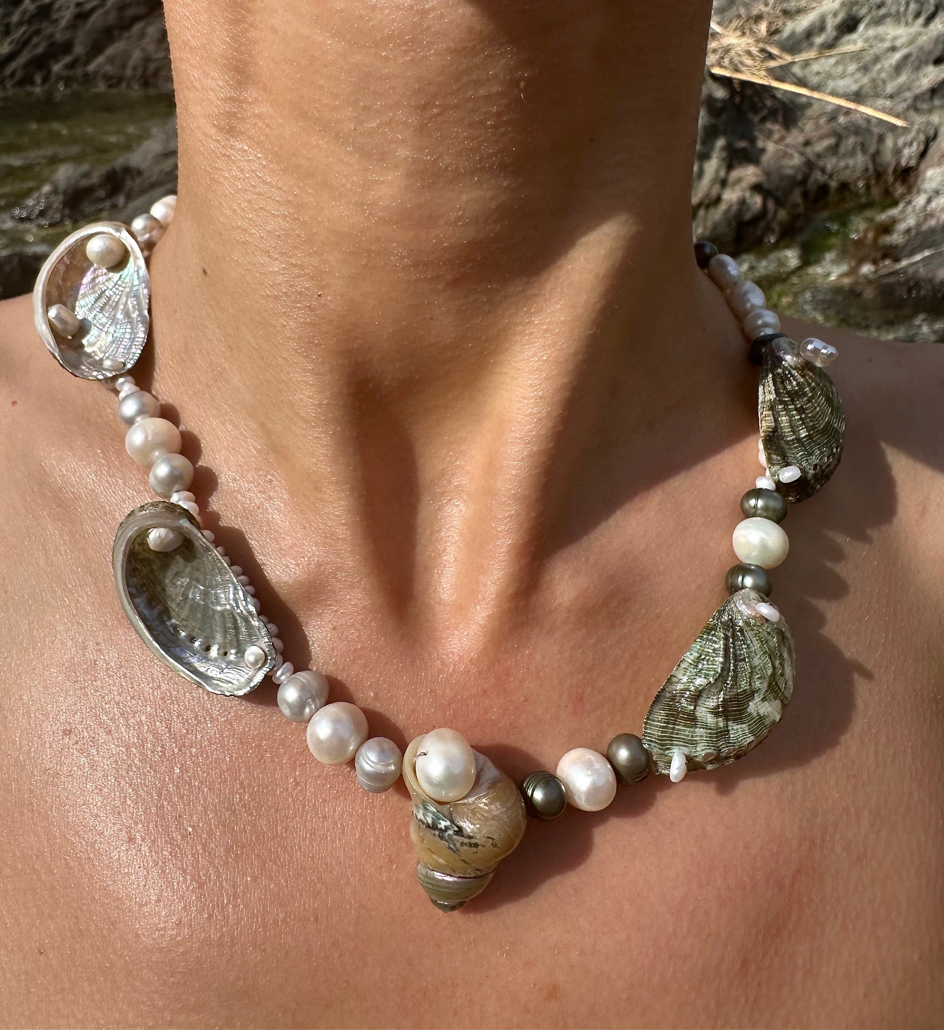 SUSANNA · collar reversible con un caracol de nácar en el centro, rodeado de varias conchas de abulón. Se puede llevar de modo que se muestren los tonos verdes y marrones por fuera, o dado la vuelta para mostrar el nácar en el interior. Las conchas están combinadas con perlas de agua dulce plateadas y blancas en un lado, y en tonos verdes y blancos en el otro.
