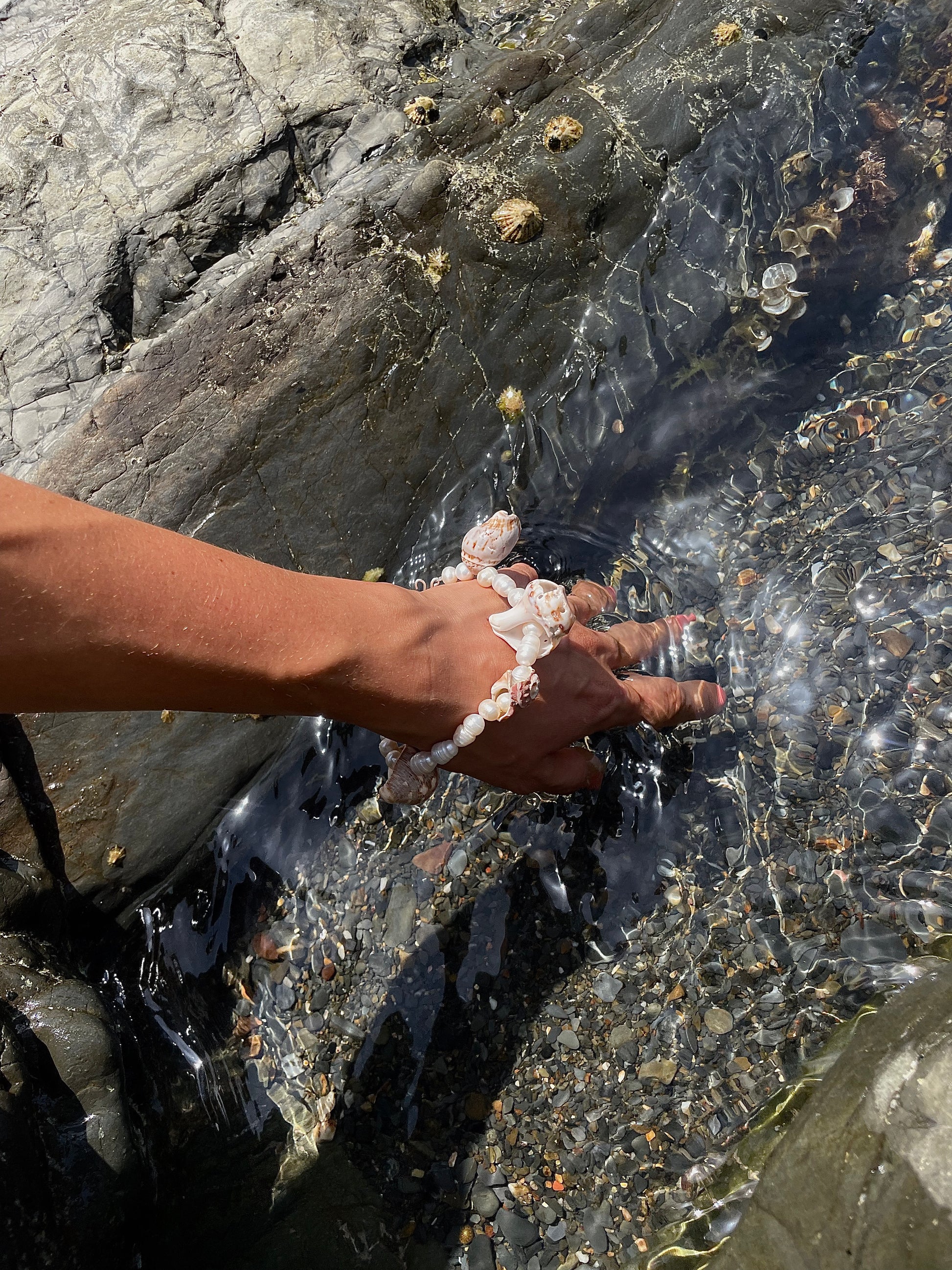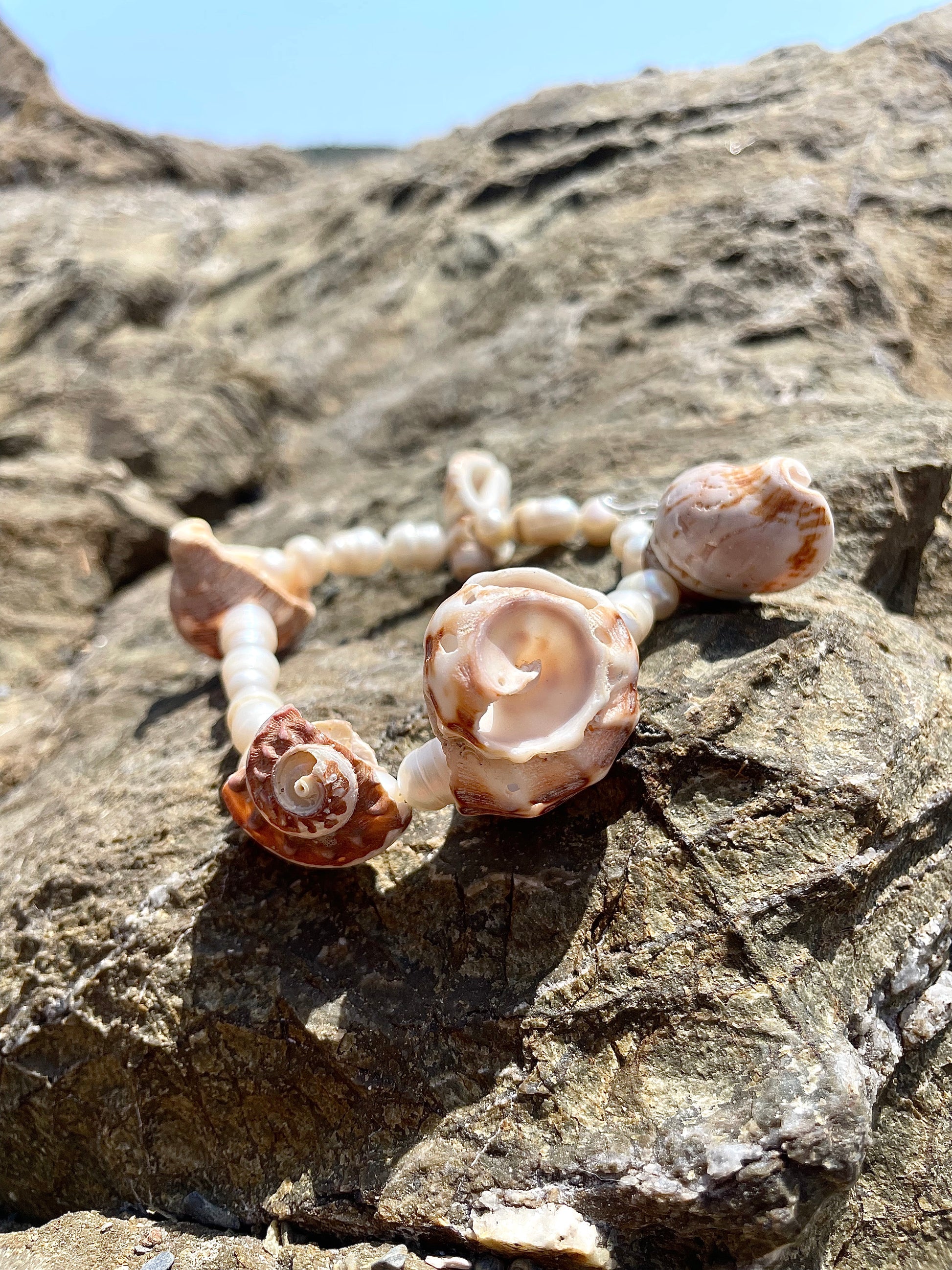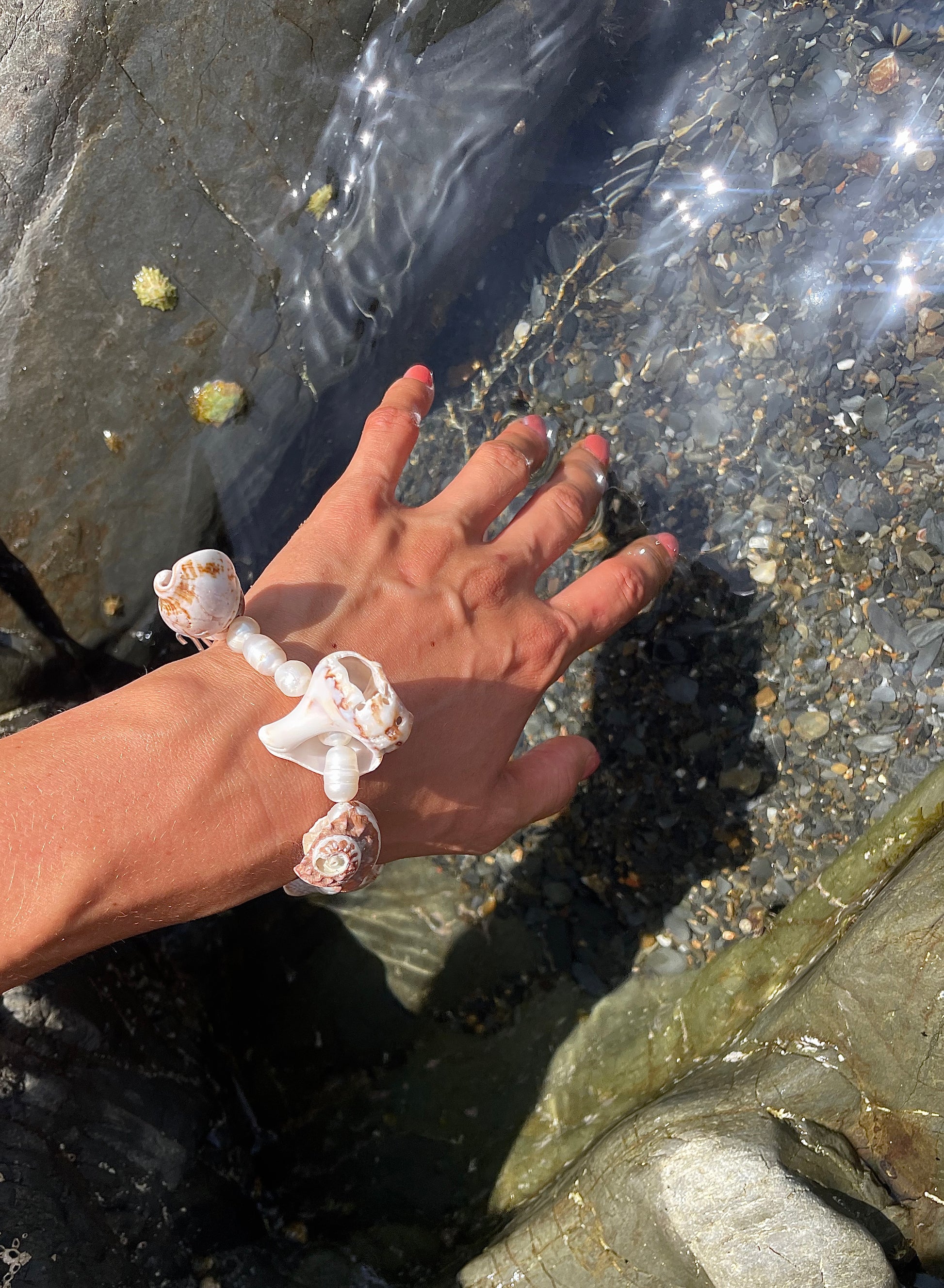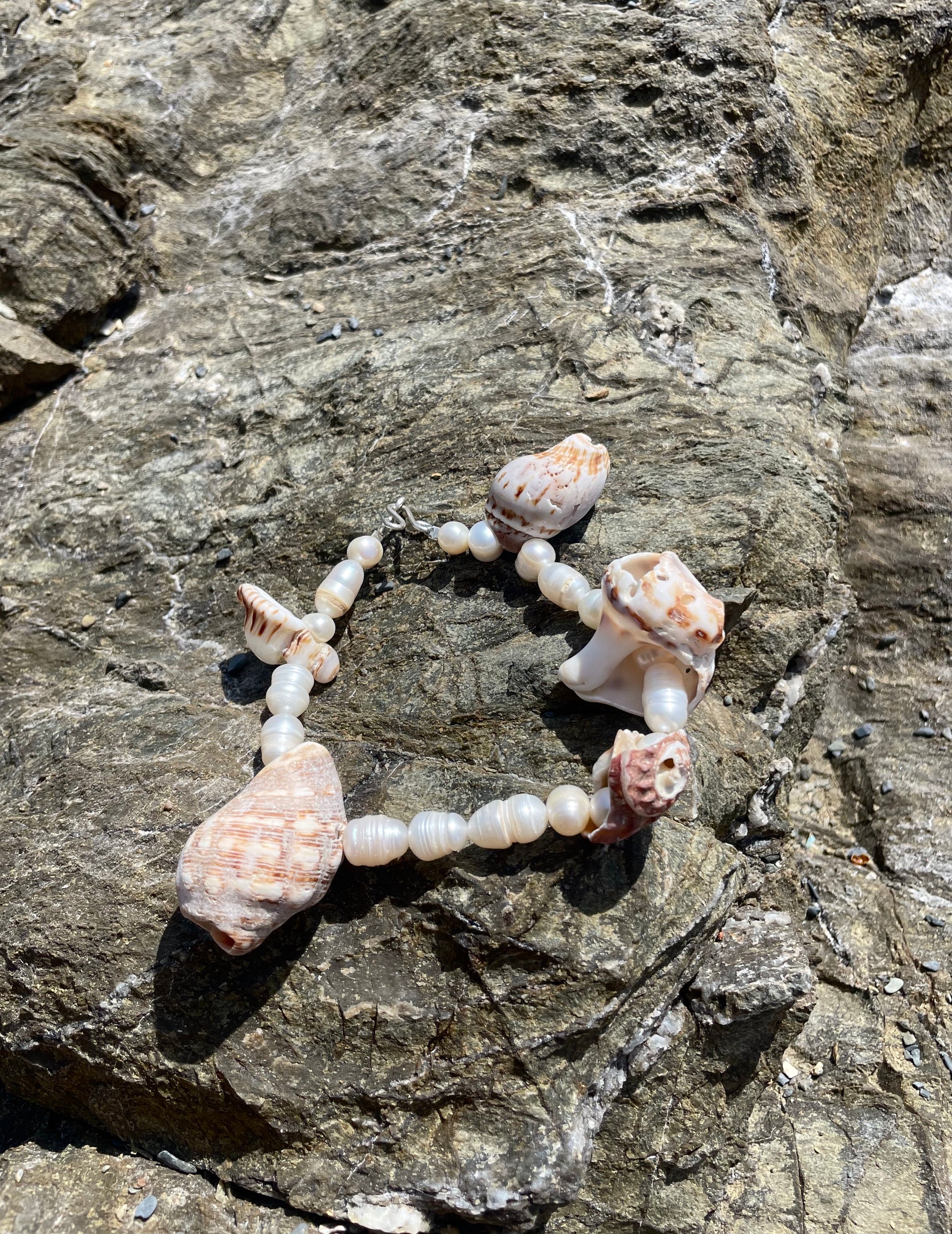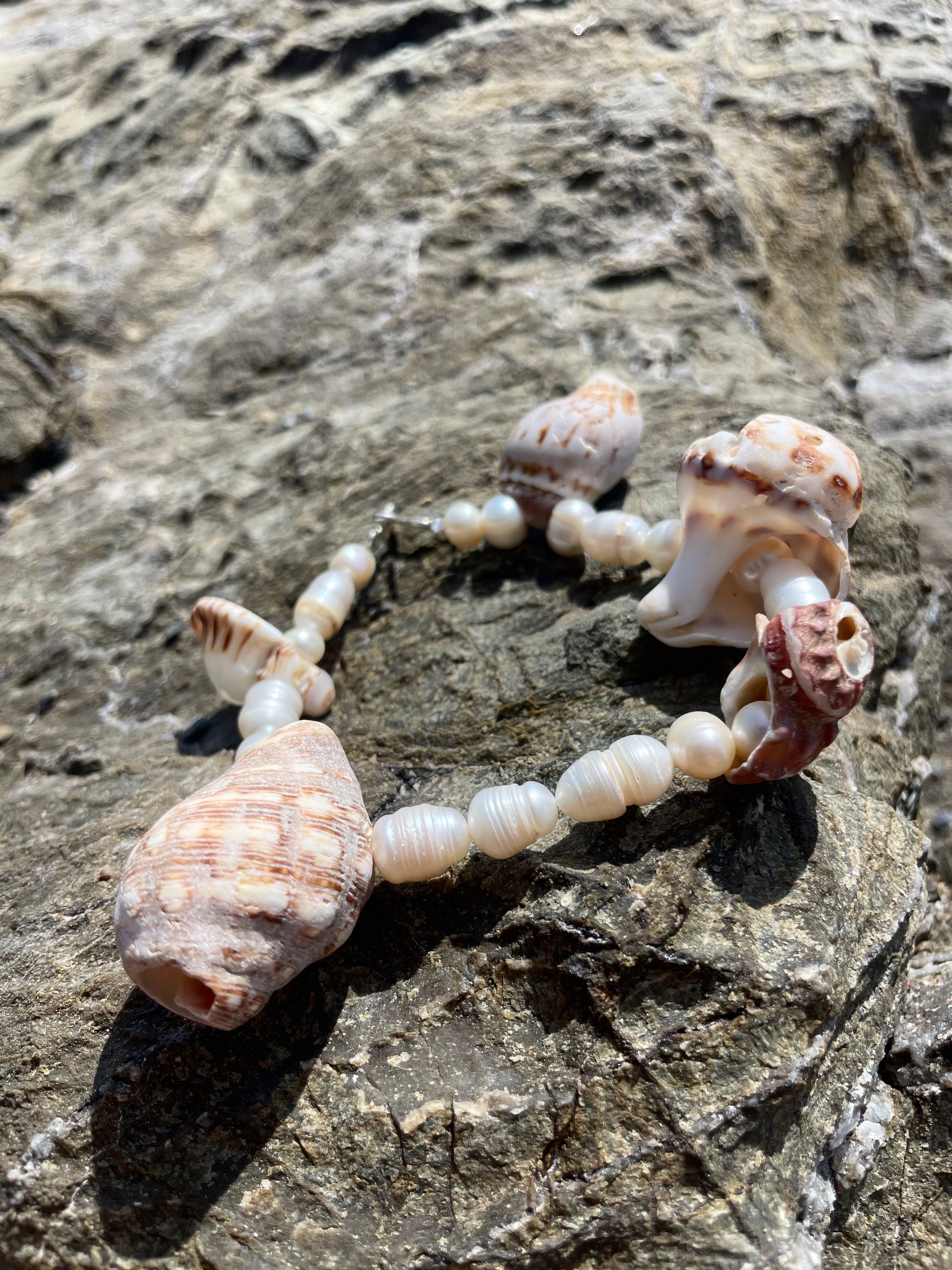 TANO · pulsera con perlas de agua dulce y distintas conchas marinas en tonos beige.