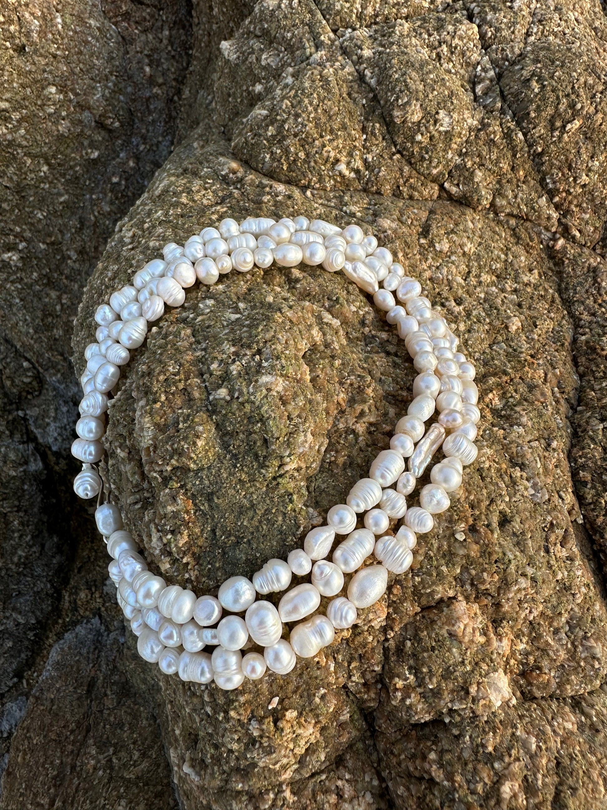 TRINITA · una pieza compuesta por tres hileras de diferentes longitudes, creadas con perlas de agua dulce en variadas formas y tamaños. Cada hilo tiene un detalle especial: una perla barroca alargada que irradia sutiles destellos en tonos nácar, aportando un brillo cambiante y sofisticado.