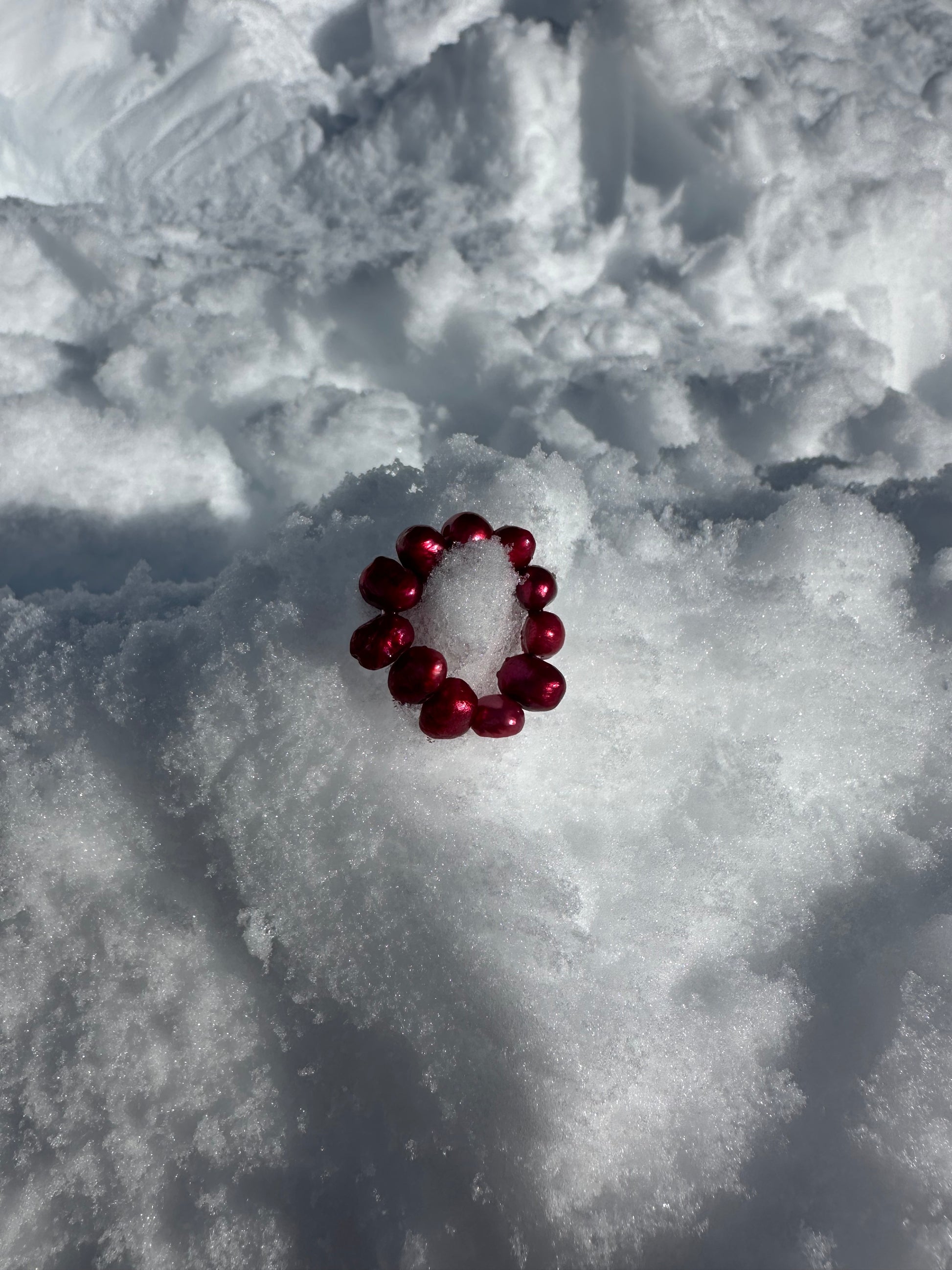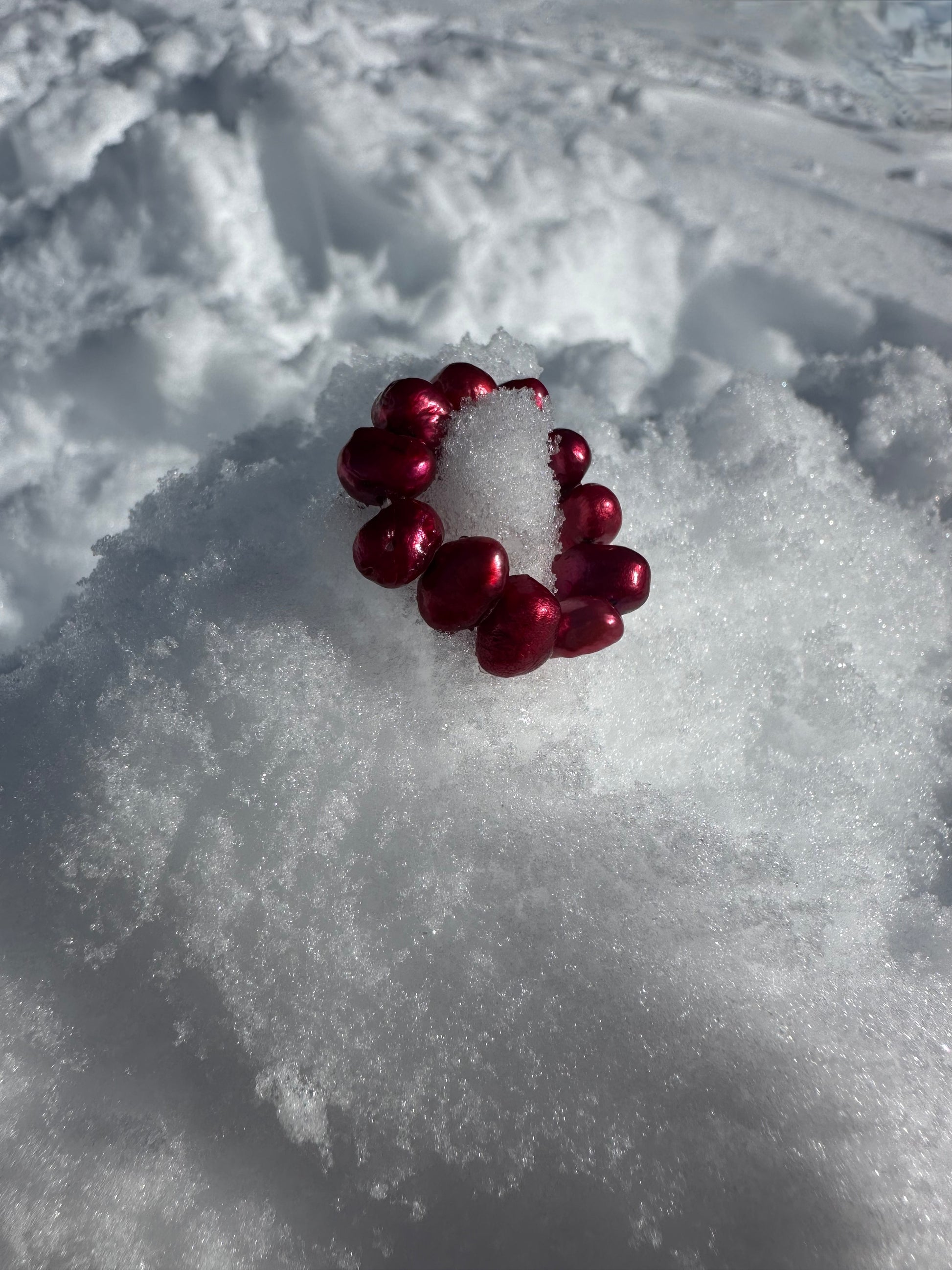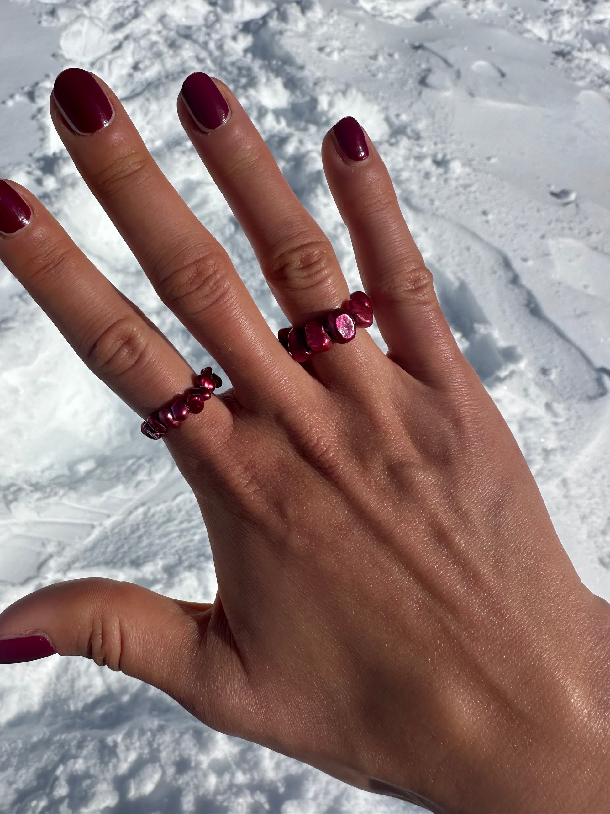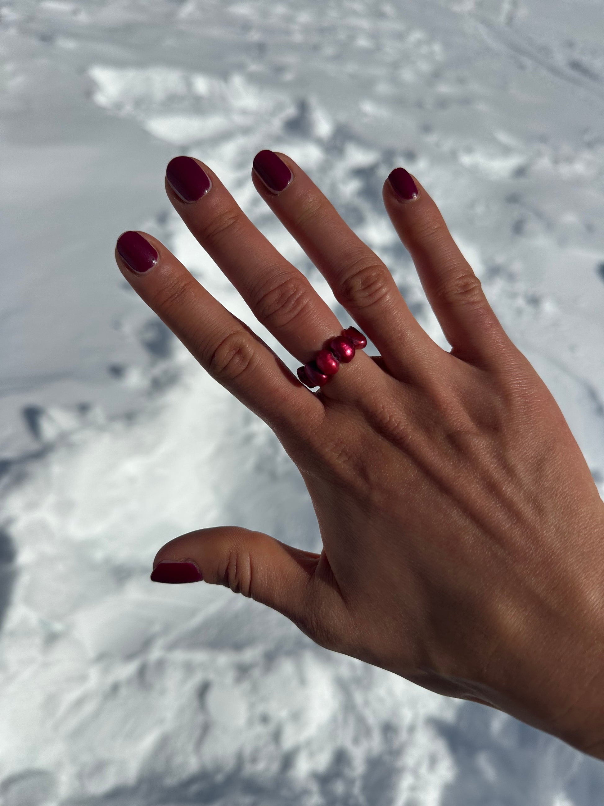 VELORIA · anillo elástico compuesto por perlas de agua dulce de tamaño medio en intensos tonos rojo burdeos.
